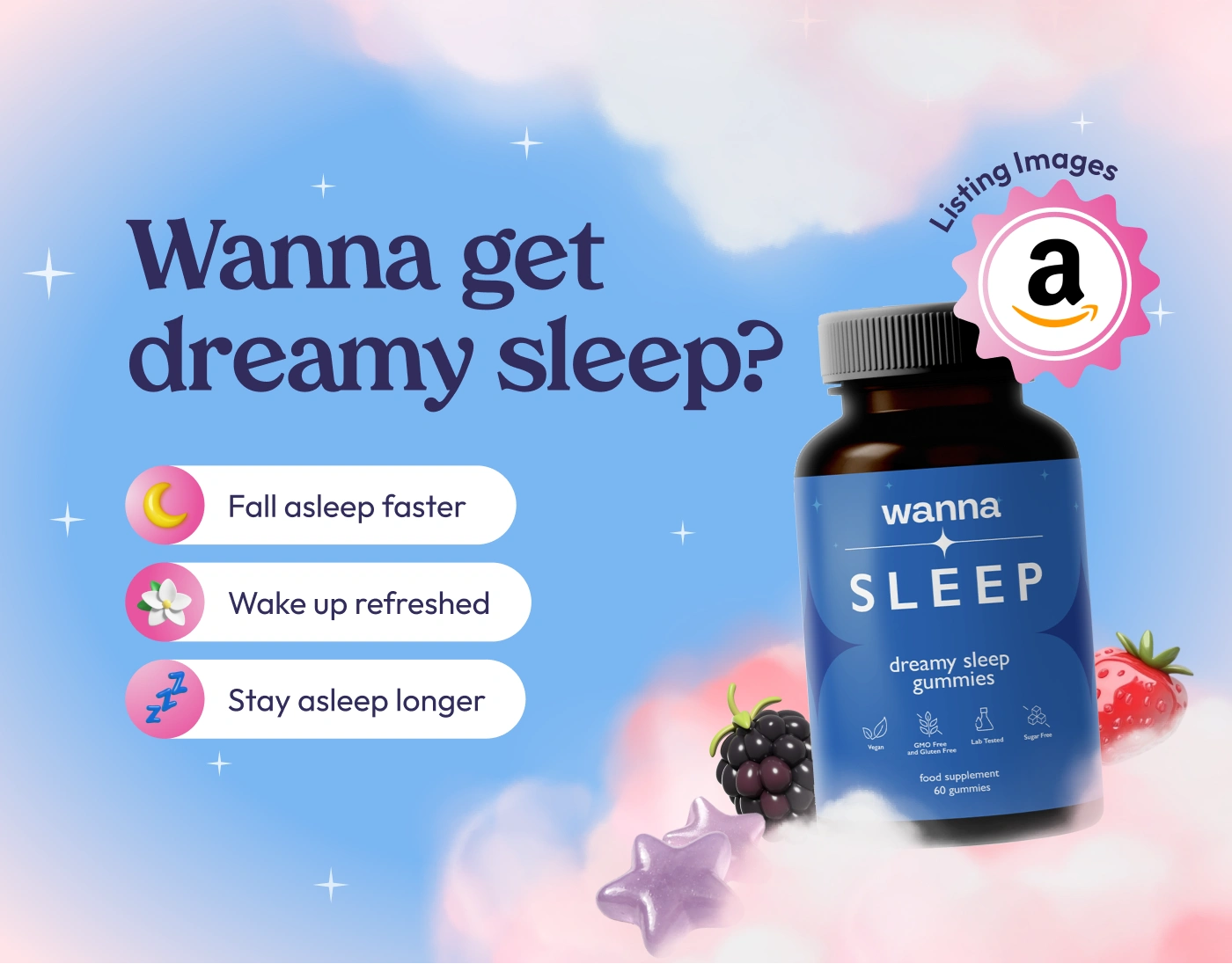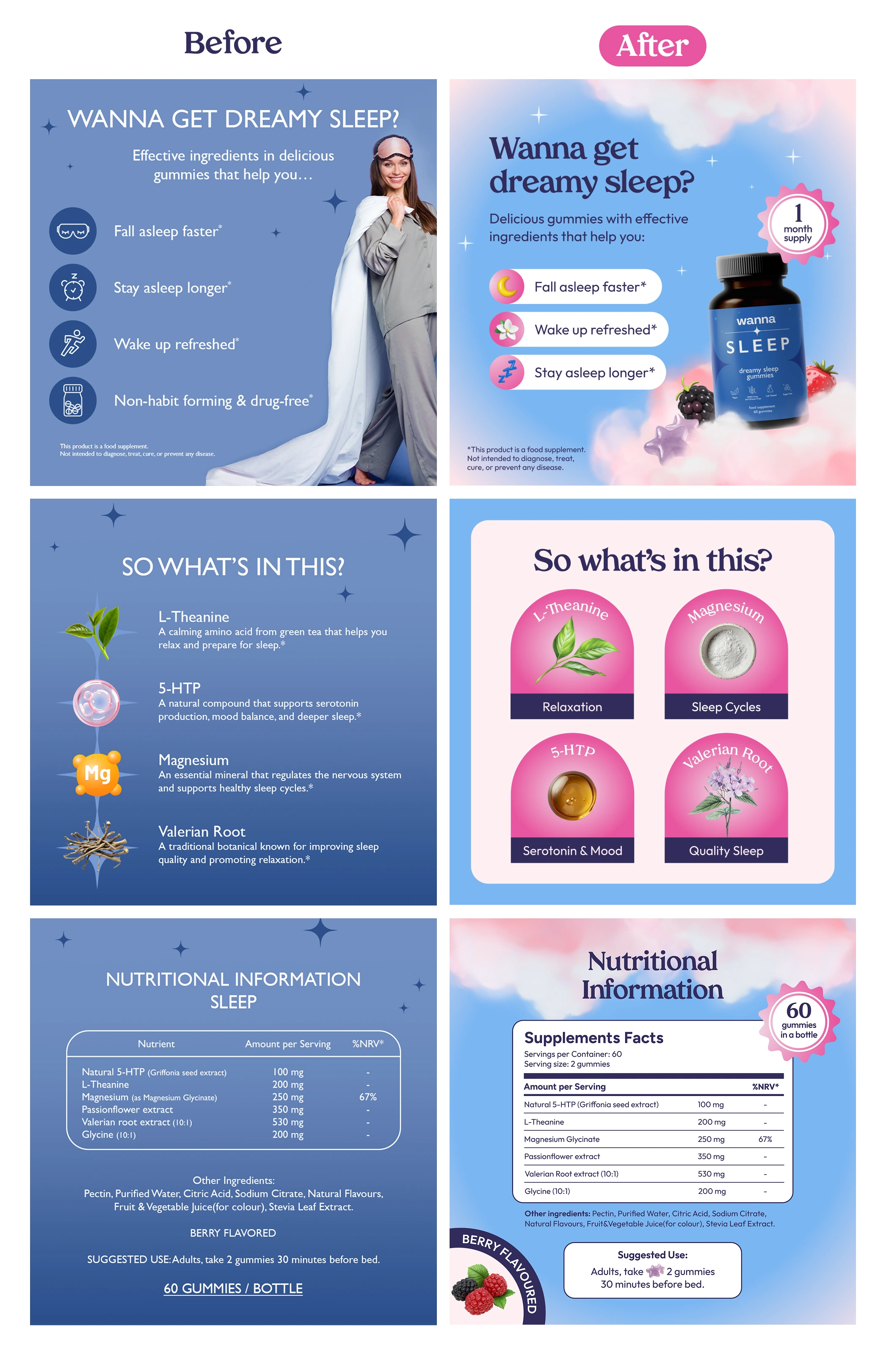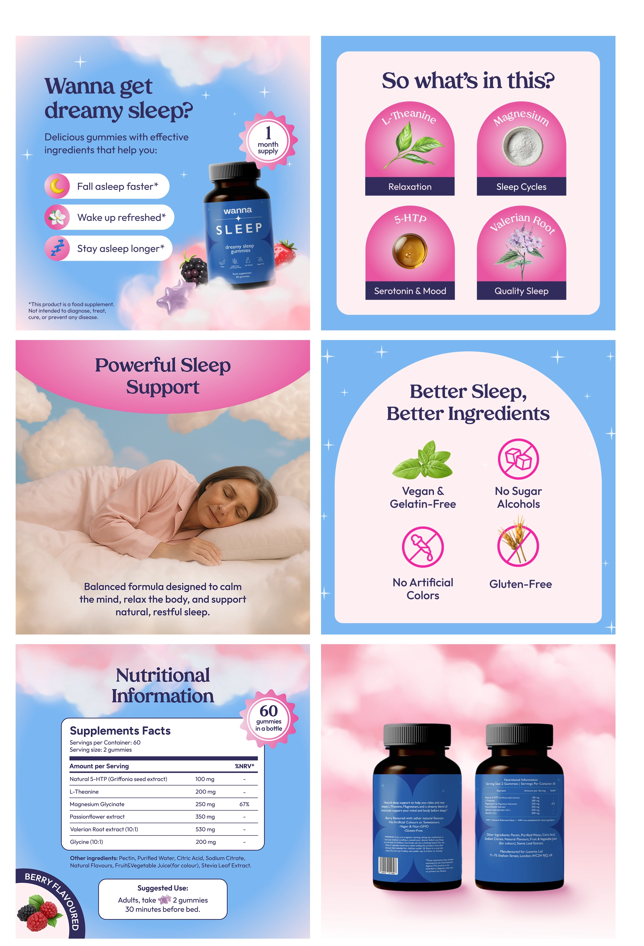 A refreshed, Gen Z-inspired look for Wanna Sleep, melatonin sleep gummies made to help you relax and drift off naturally. Soft lilacs, playful typography, and dreamy gradients bring a modern twist to bedtime wellness.