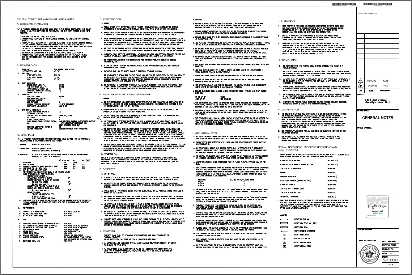 Design of steel decking, beam-to-column connections, and shear wall details.