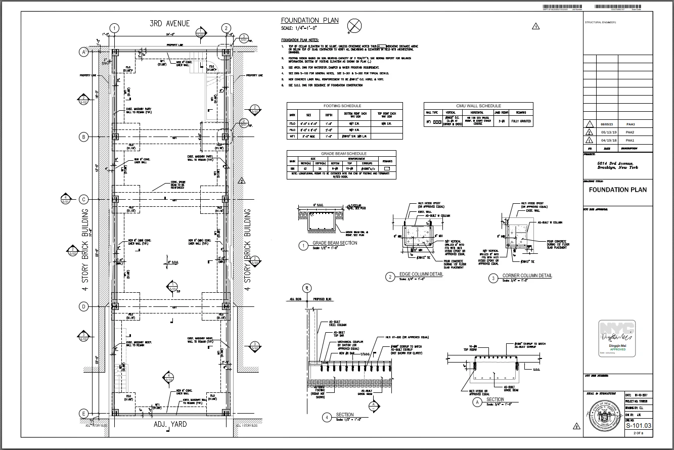Features detailed cross-sectional and elevation views of complex foundation elements, tie-ins to existing masonry party walls , and underpinning/shoring precautions for adjacent structures.