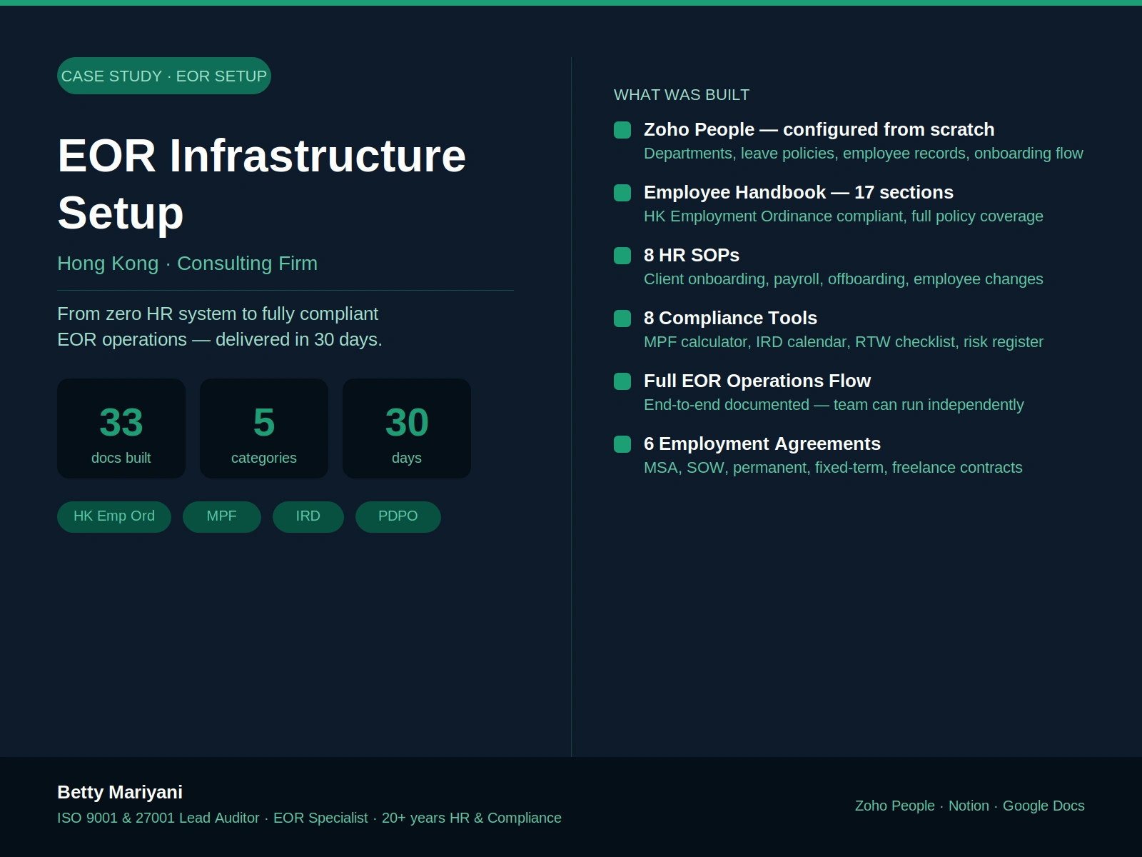HK-based consulting firm was expanding its team and needed a compliant employment framework from scratch. No HR system, onboarding process, employee handbook.