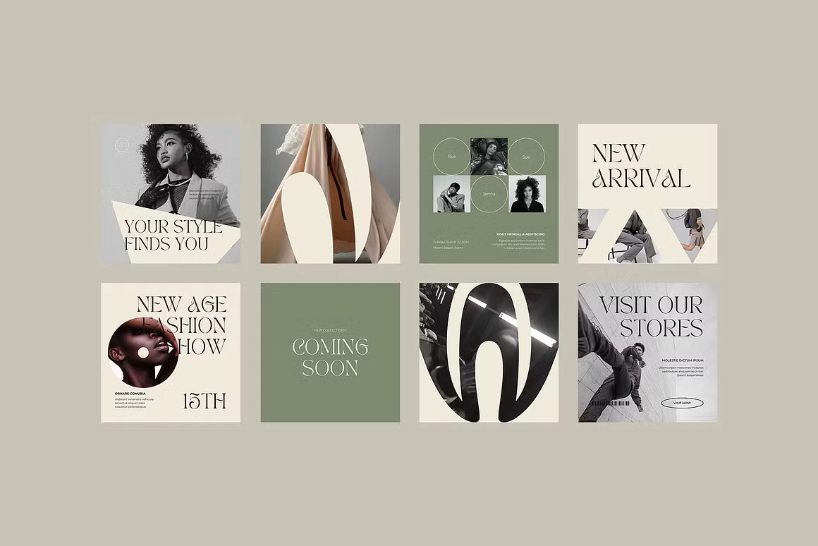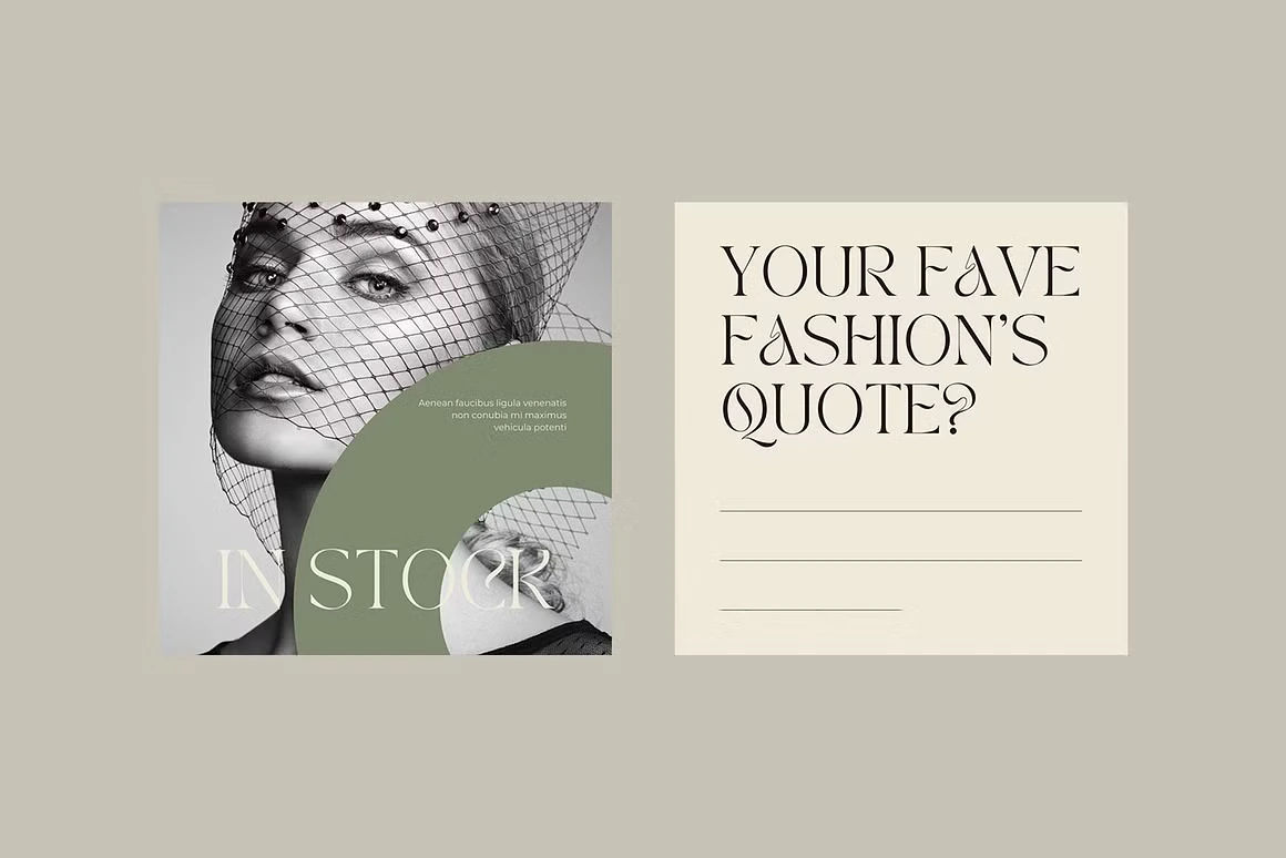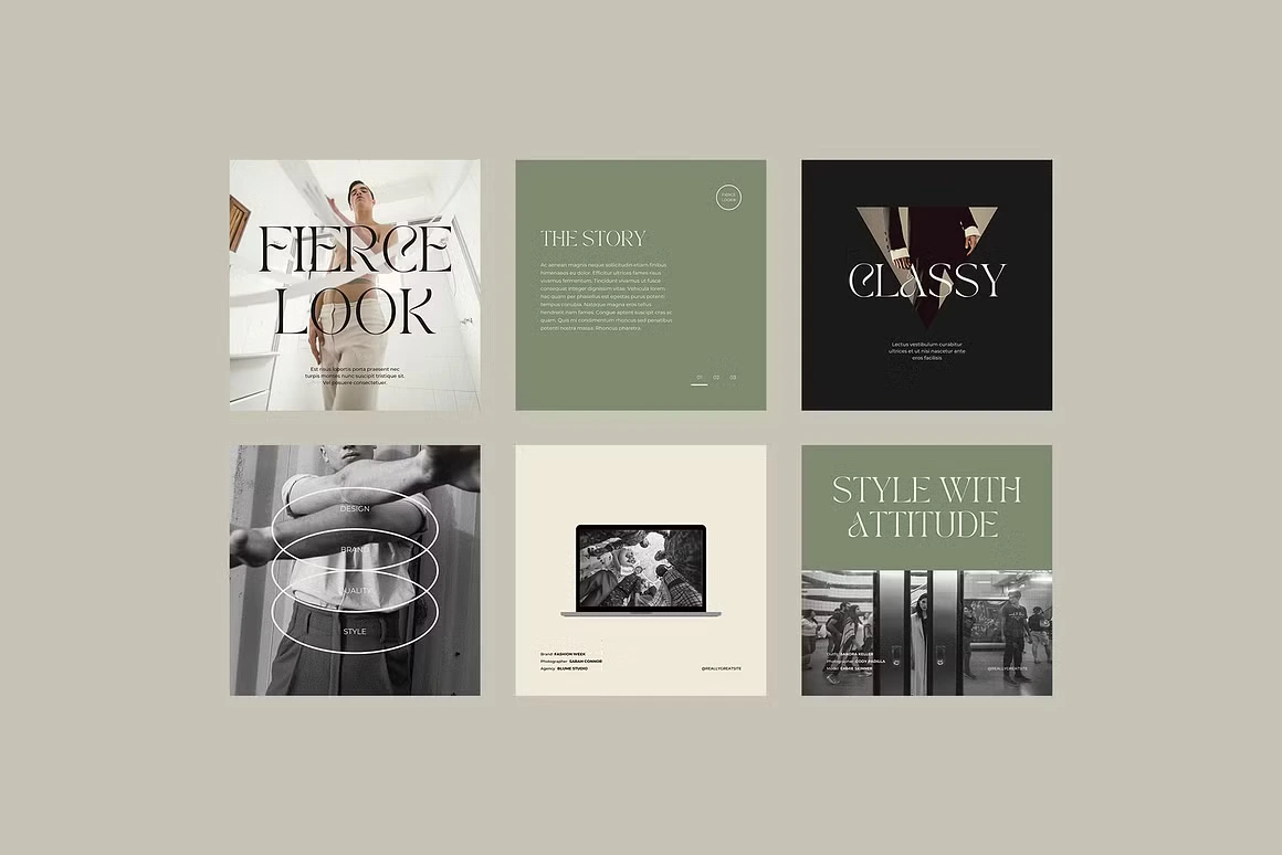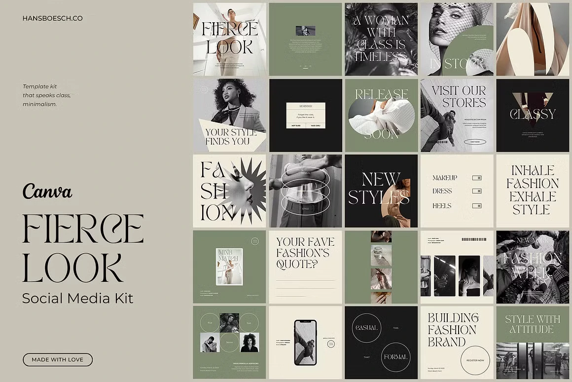 Fierce Look is a Canva social media kit built for fashion and lifestyle brands that lead with attitude. The aesthetic is editorial and unapologetically bold, deep blacks, sage greens, and warm creams paired with high-contrast serif typography that commands the feed. Templates cover everything from product drops and store announcements to quotes, lookbooks, and fashion week content. Each layout is designed to feel like a magazine spread, giving your brand a polished, high-fashion presence without the studio budget.