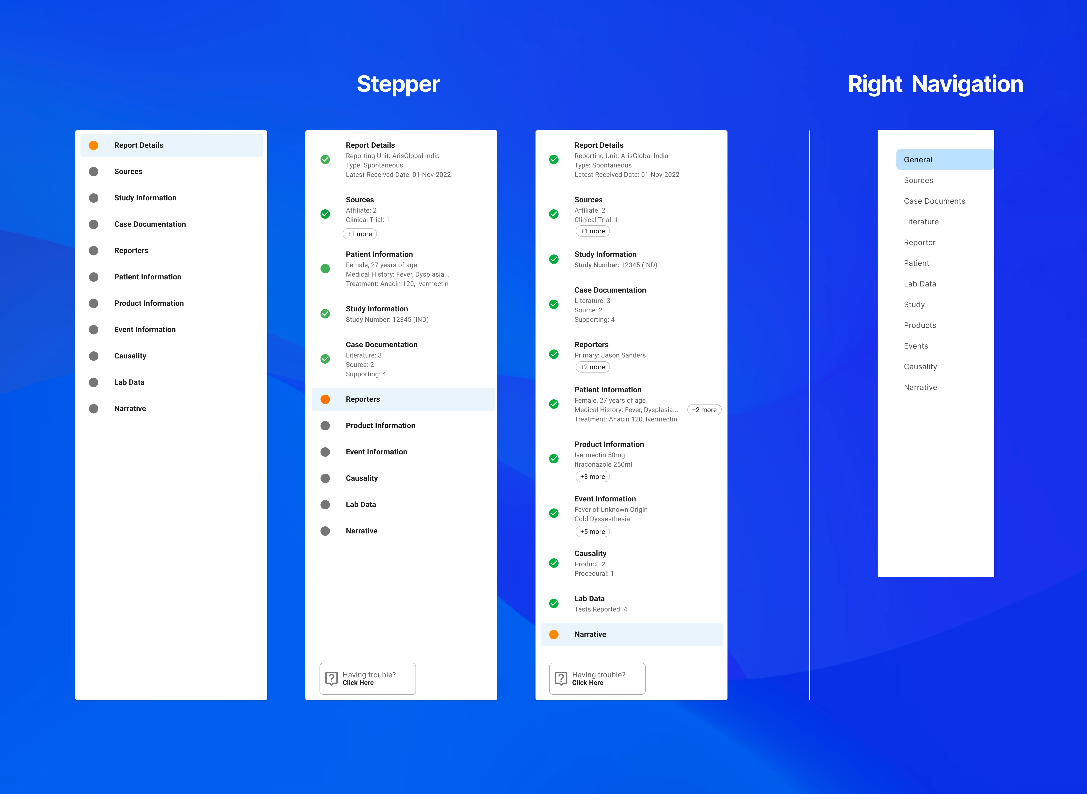 As part of my design process, I ensured that ArisGlobal's product suite could be seamlessly integrated and navigated by even the most inexperienced users. By collaborating with stakeholders and engineering partners, we addressed user needs and technological feasibility.