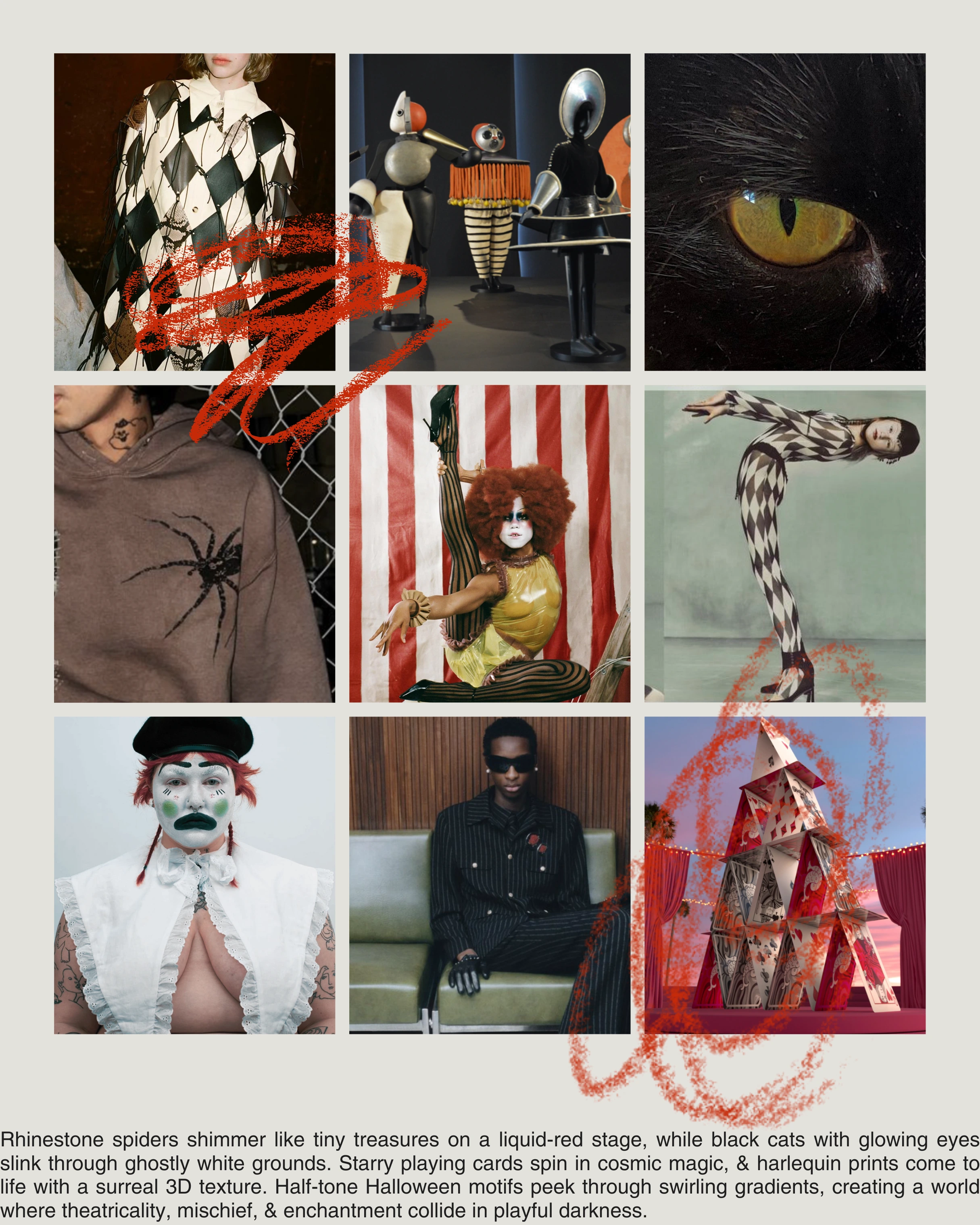 Execution: Rhinestone spiders shimmer like jeweled treasures against liquid-red grounds, black cats with glowing eyes prowled through ghostly whites, and harlequin checks (not produced) distorted into surreal 3D knit textures. Starry playing cards and half-tone Halloween motifs layered through swirling gradients, building a world where magic and mischief collide.