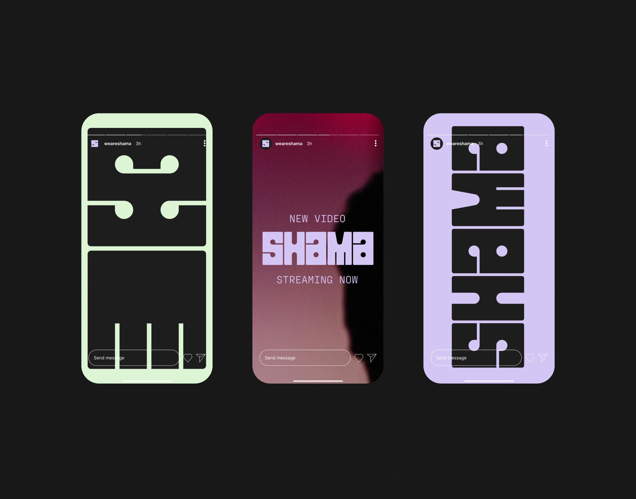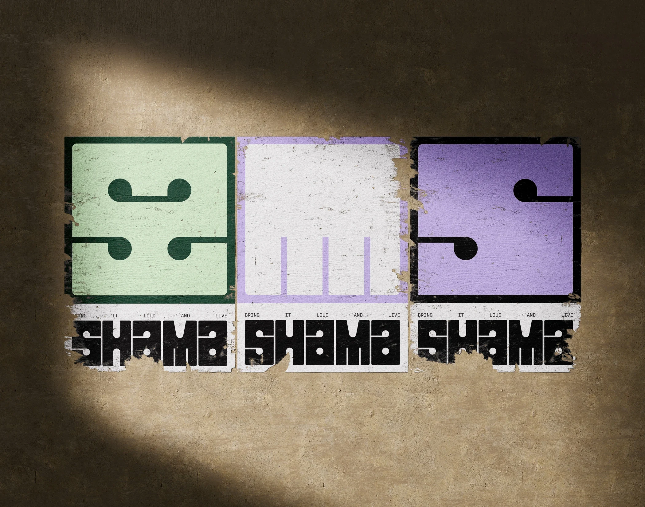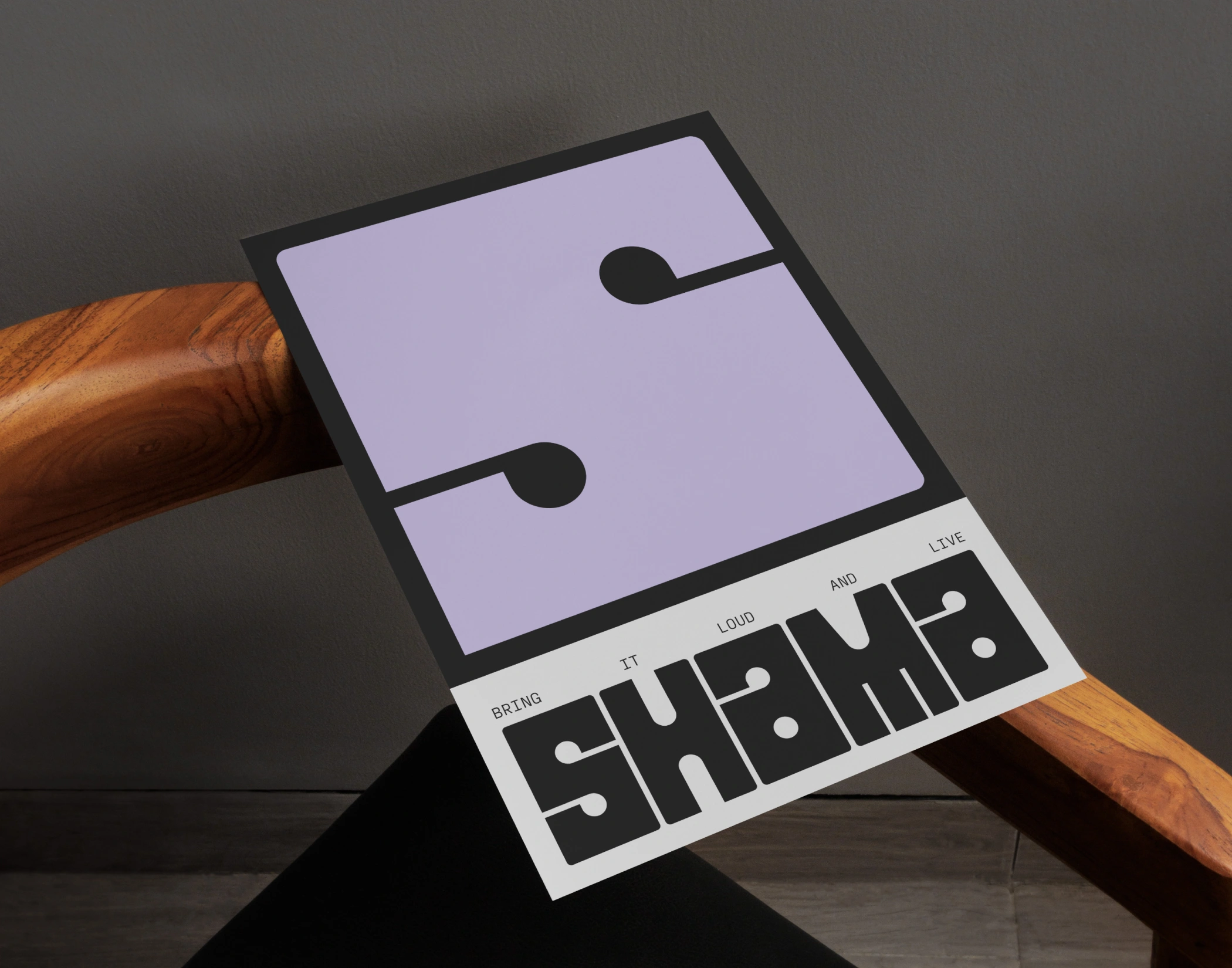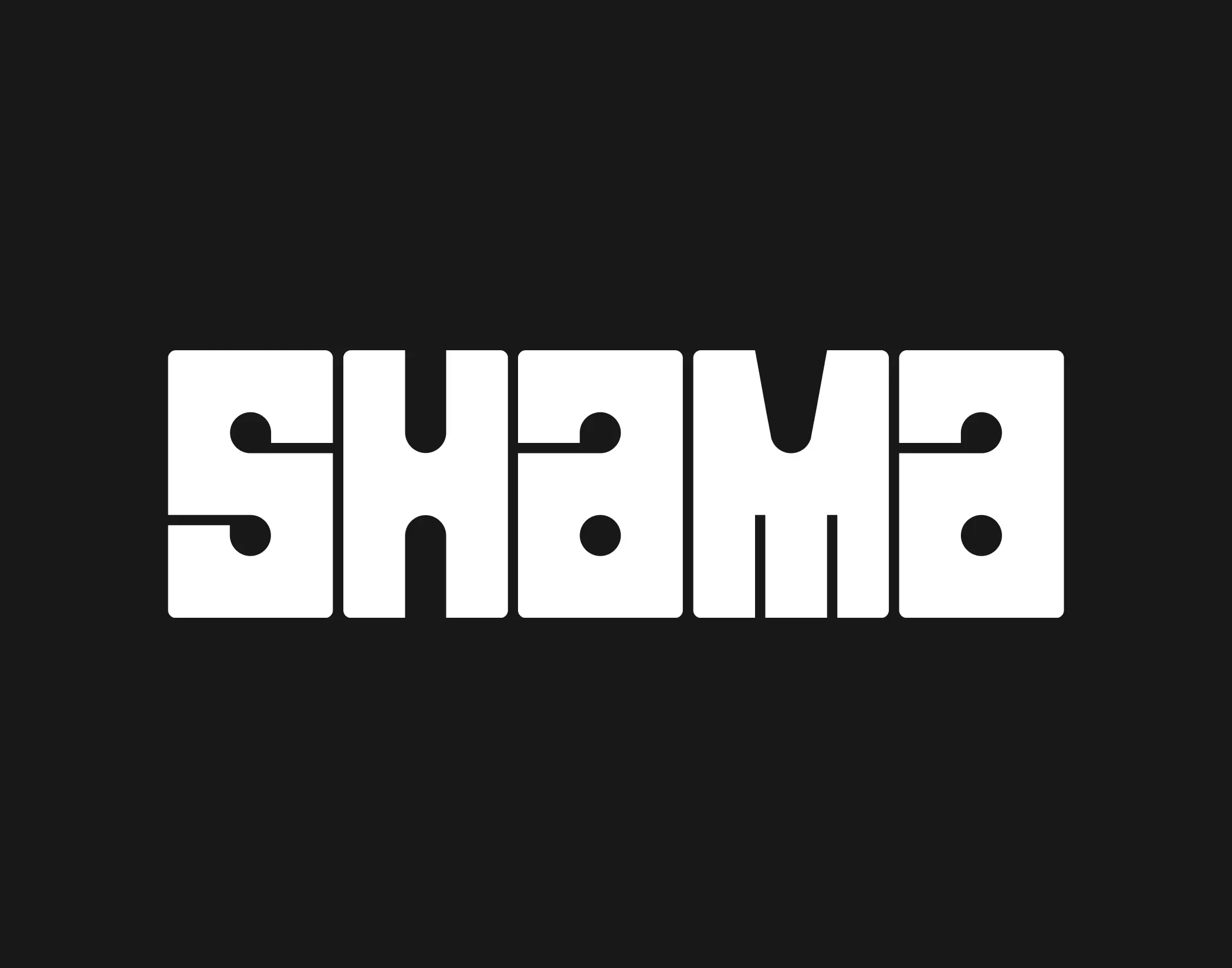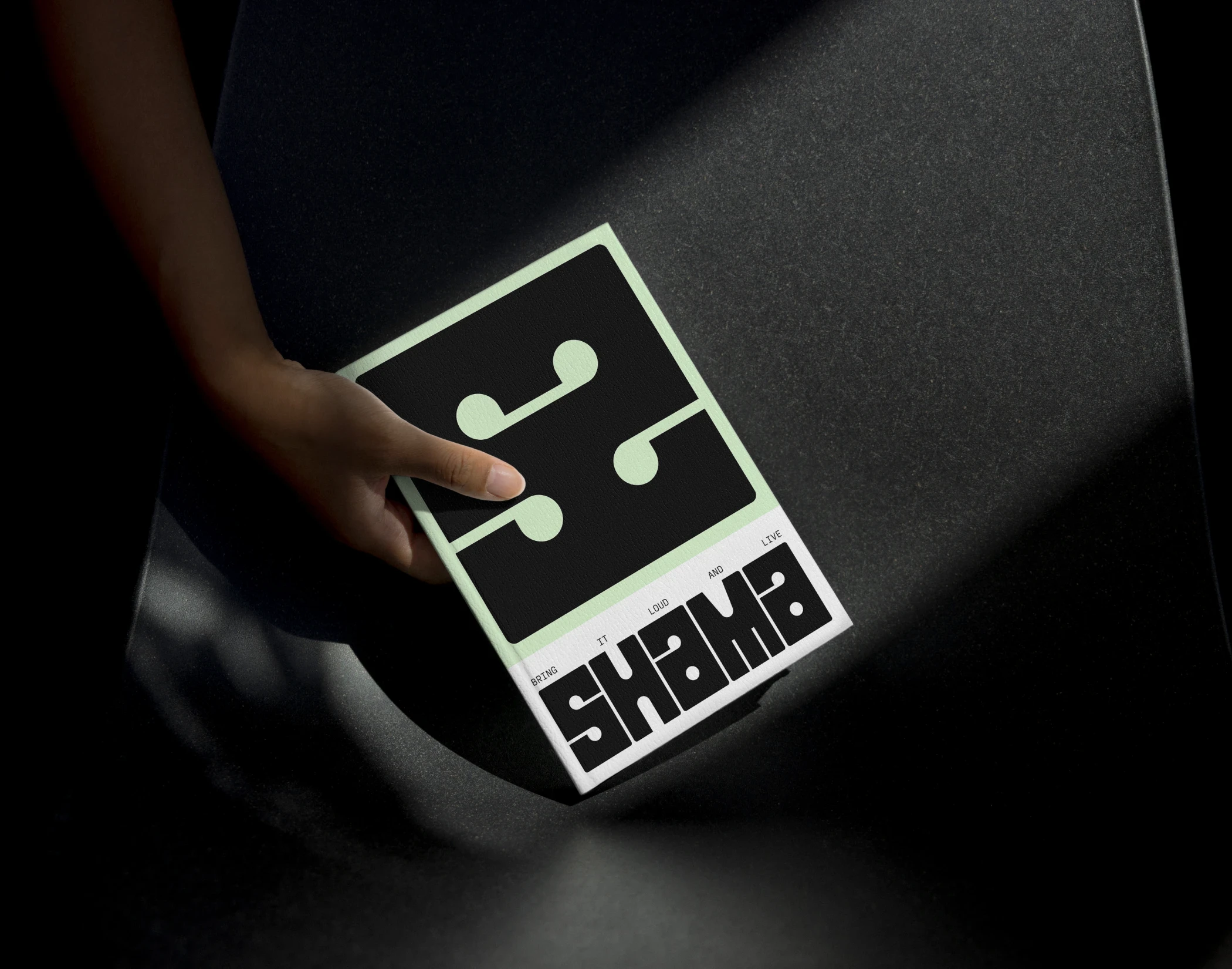 The identity is built around a logo that combines soft curves and angular blocks, in a play of shapes inspired by audio and video cassettes. This contrast expresses the tension between analog nostalgia and digital energy. A vivid color palette reinforces this intent, evoking SHAMA’s vibrant and expressive universe.