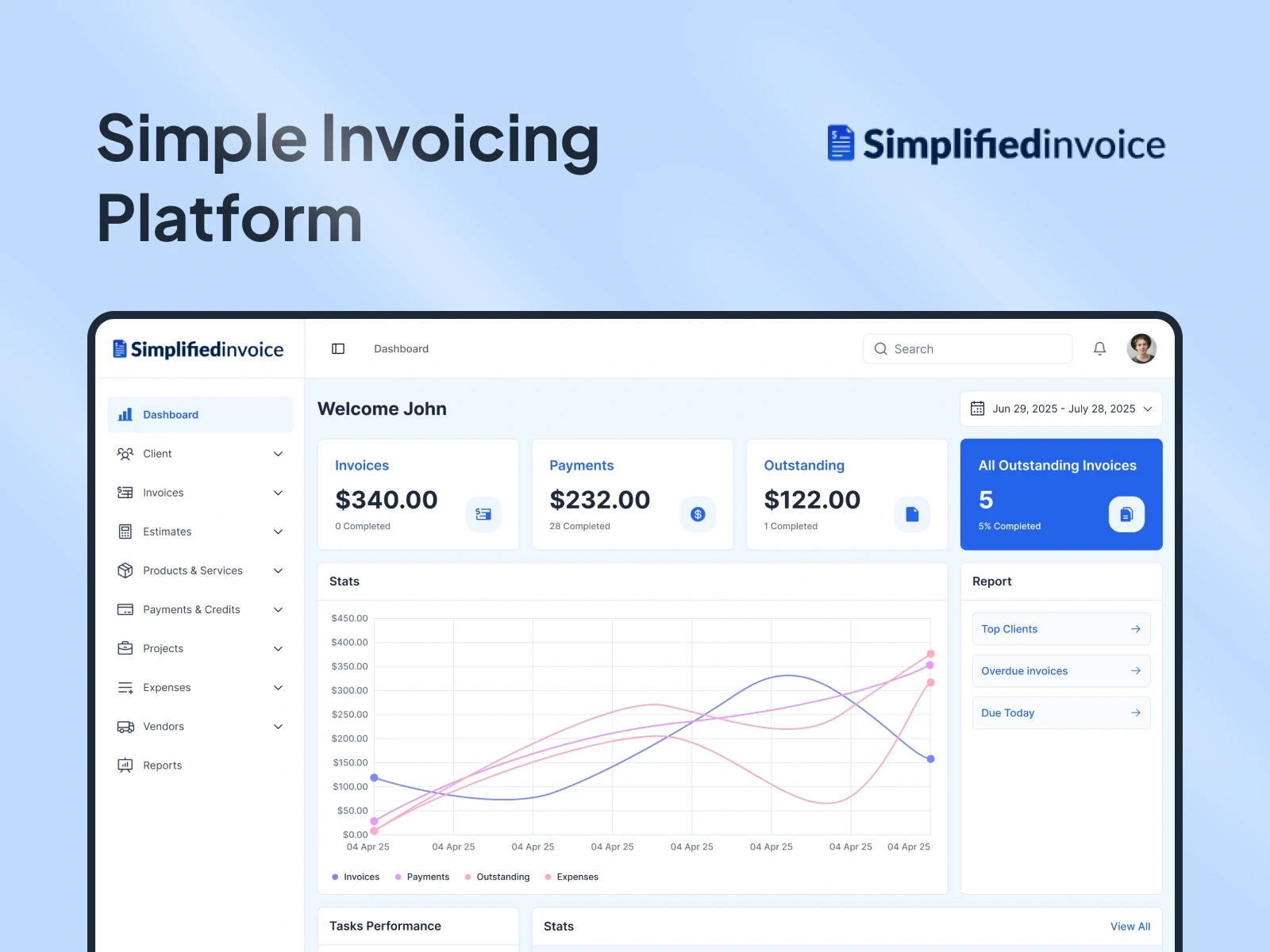 The goal was to transform SimplifiedInvoice’s main dashboard into a clean, modern, and easy-to-scan control center, while still presenting key invoice analytics in a way that stays readable at a glance.