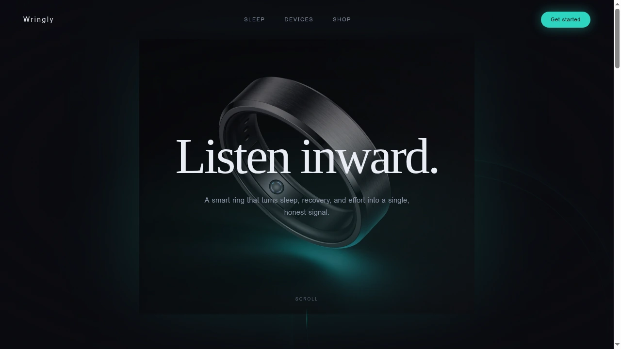 The hero pairs a slow-rotating product shot with a single line of copy. The ring sits inside a teal halo that pulses gently. As you scroll, the ring drifts down and fades while the headline floats up - a subtle parallax that makes a flat web page feel cinematic.
