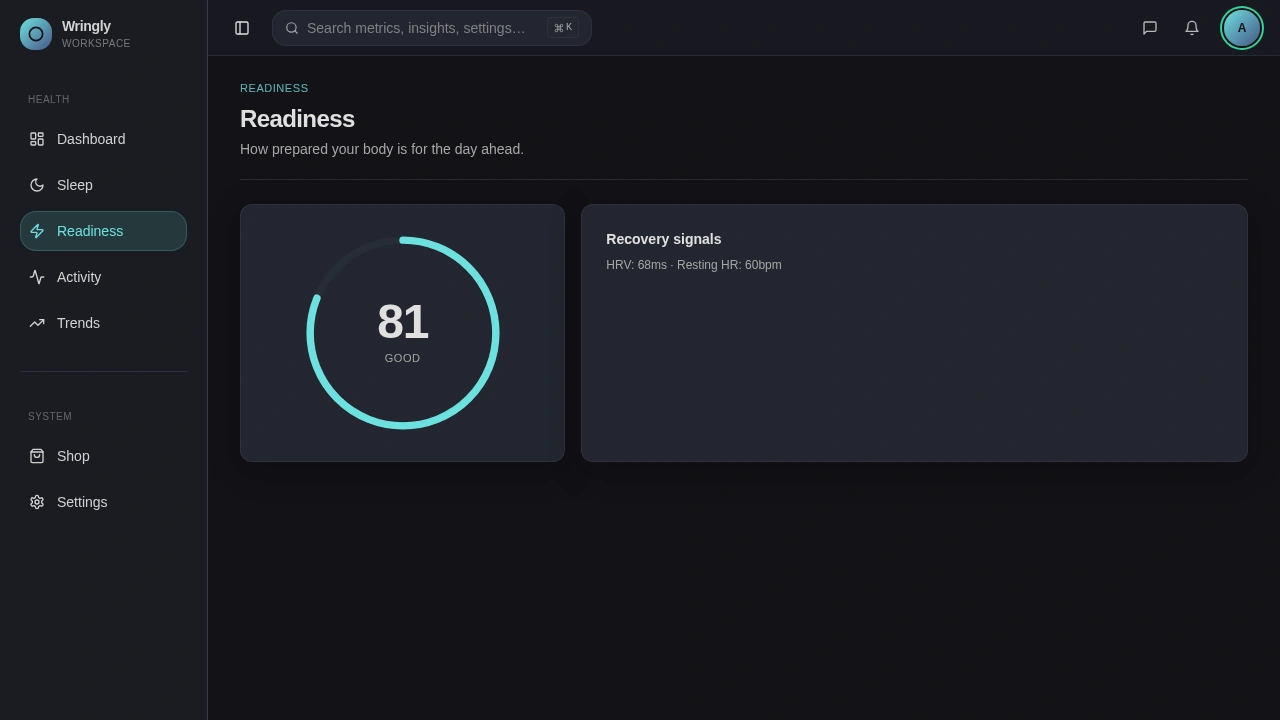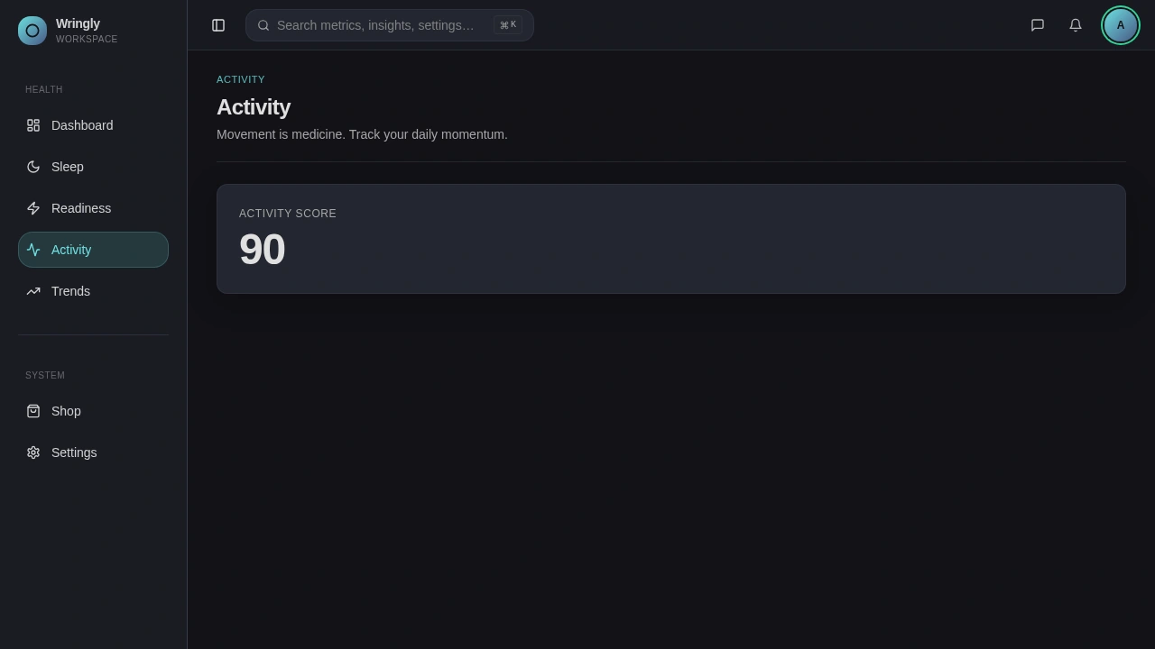 Each health page answers exactly one question. Sleep shows the score and how the night broke down. Readiness shows the score and the recovery signals behind it. Activity surfaces effort. The pages are intentionally sparse, leaving room to grow once real users tell us what they want to dig into.