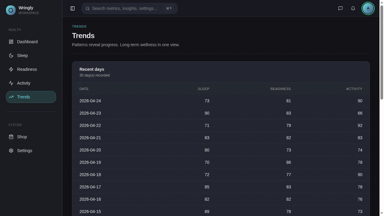 Patterns matter more than any one day. Trends shows 30 days of scores in a clean table, with richer charts planned for the next version. Starting with a table means it shipped immediately and works well for screen readers.
