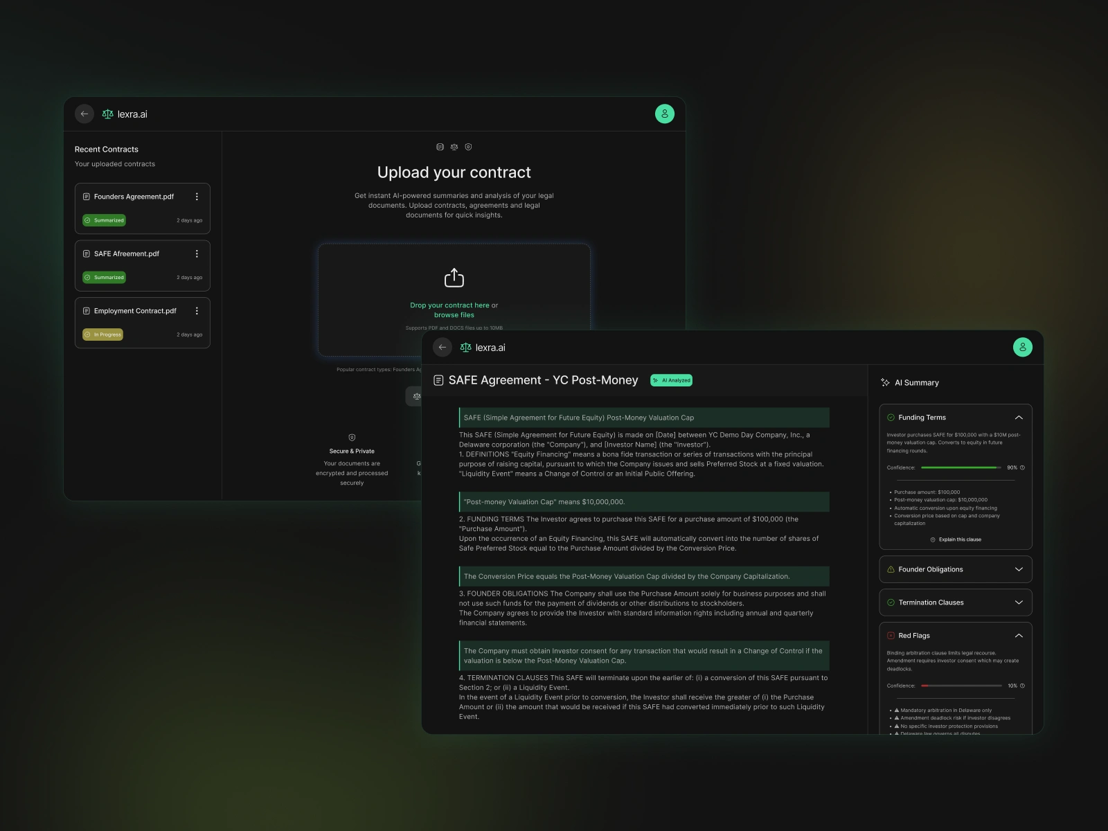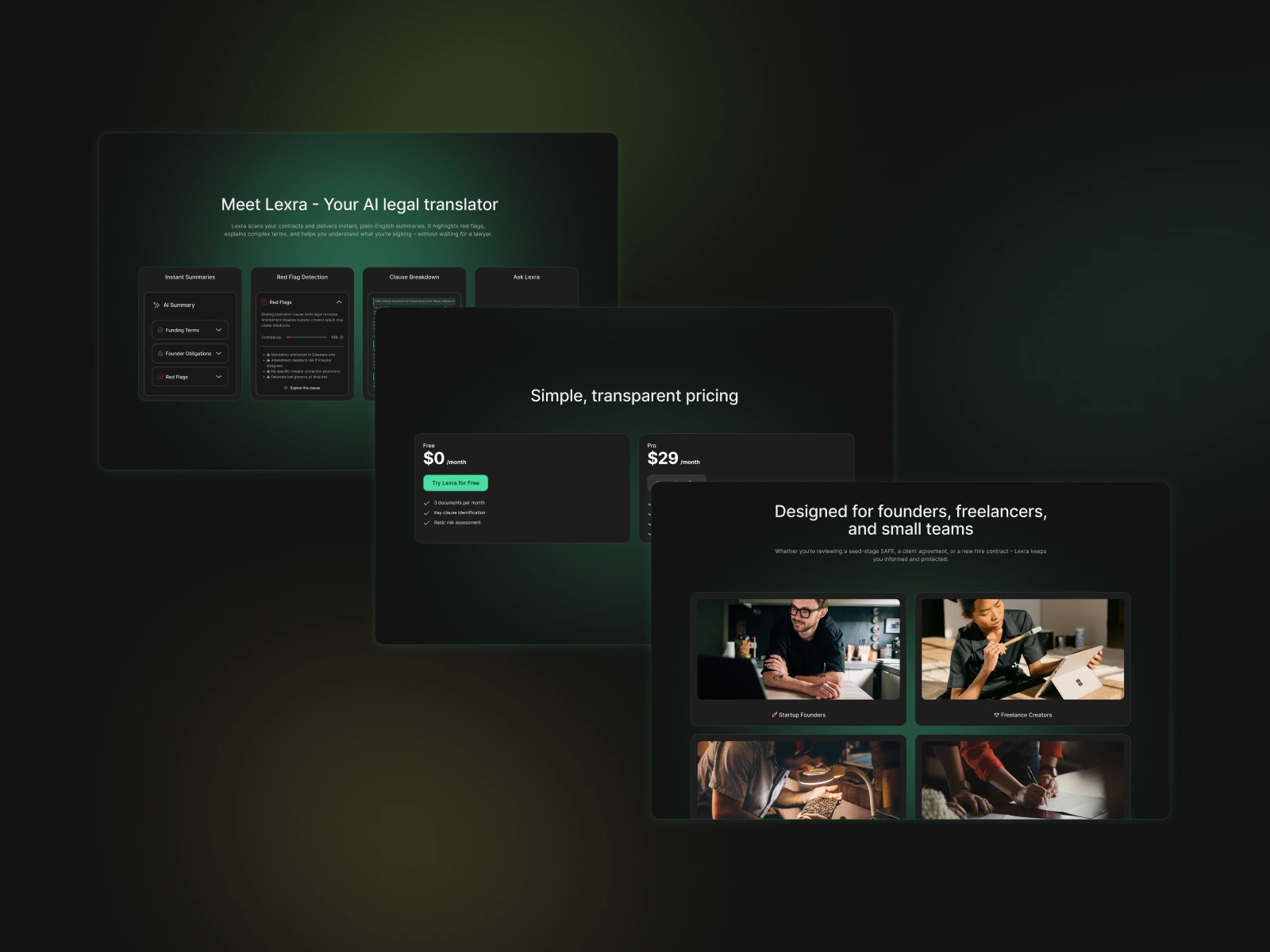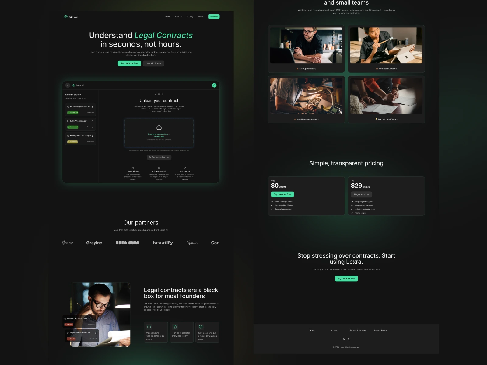 I created the brand identity, UX flow, and high-fidelity landing page to showcase how Lexra simplifies legal language into clear, actionable summaries.