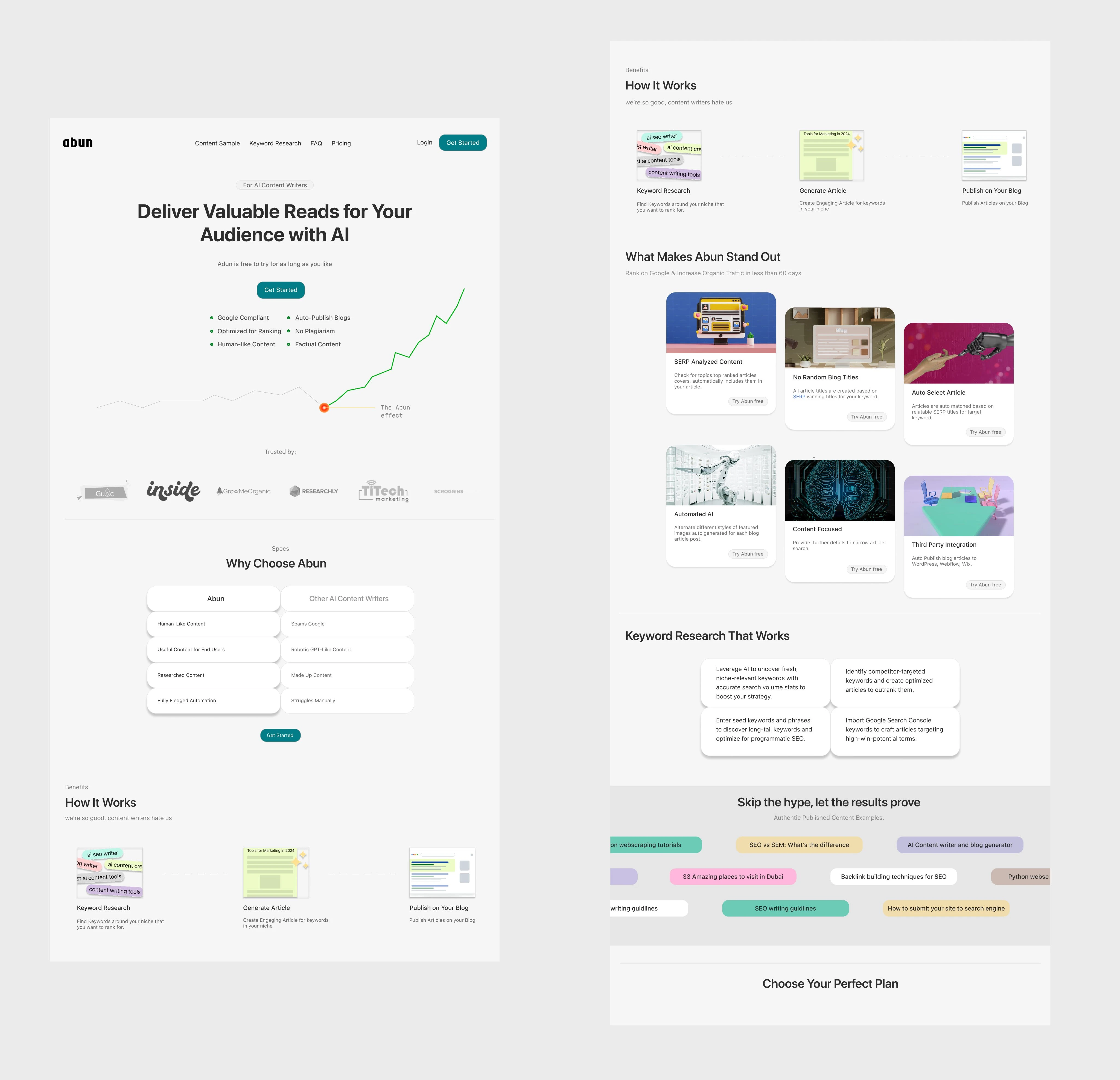 Abun was designed with the everyday writer in mind, elegant, precise and straightforward. Fully developed in figma, the idea was to serve as creative competition for other AI writing assistants. Designed fully in light mode, readability and accessibility never comes into question as it’s typography, and layout are well contrasted with its grey background, resulting in a modern yet minimalist outlook.
