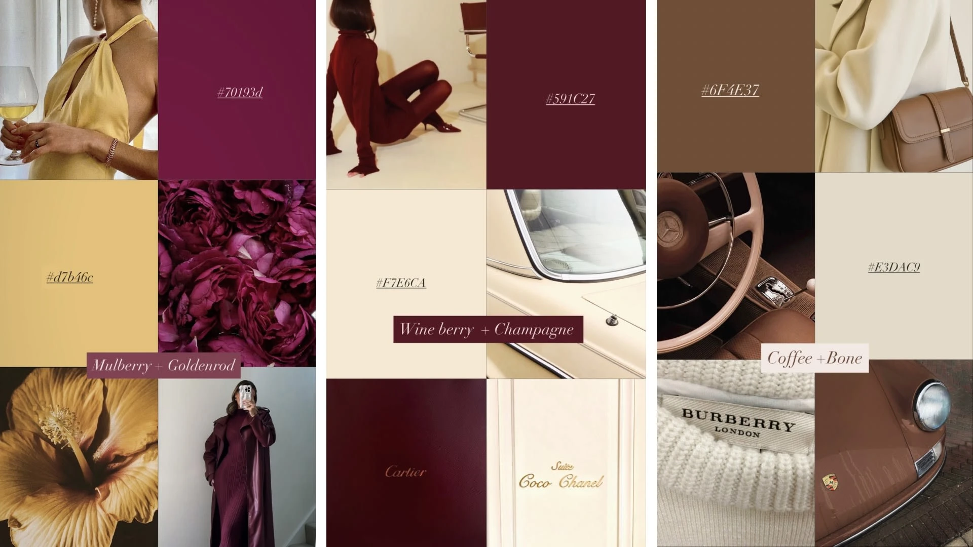 Wine Berry + Champagne: Deep romance contrasted with celebratory sparkle, ideal for luxury editorials.