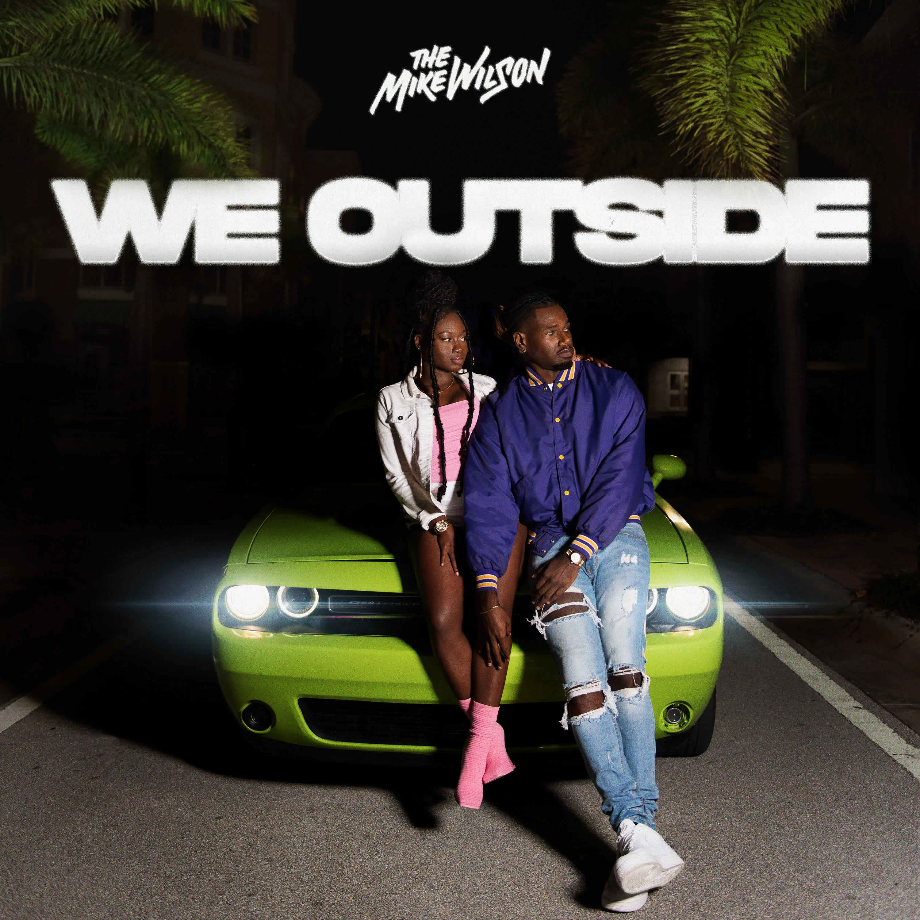 This cover art uses a nighttime street scene, with two people posed on a bright green car. Bold white text overlays the image, with a shadow effect for depth.
