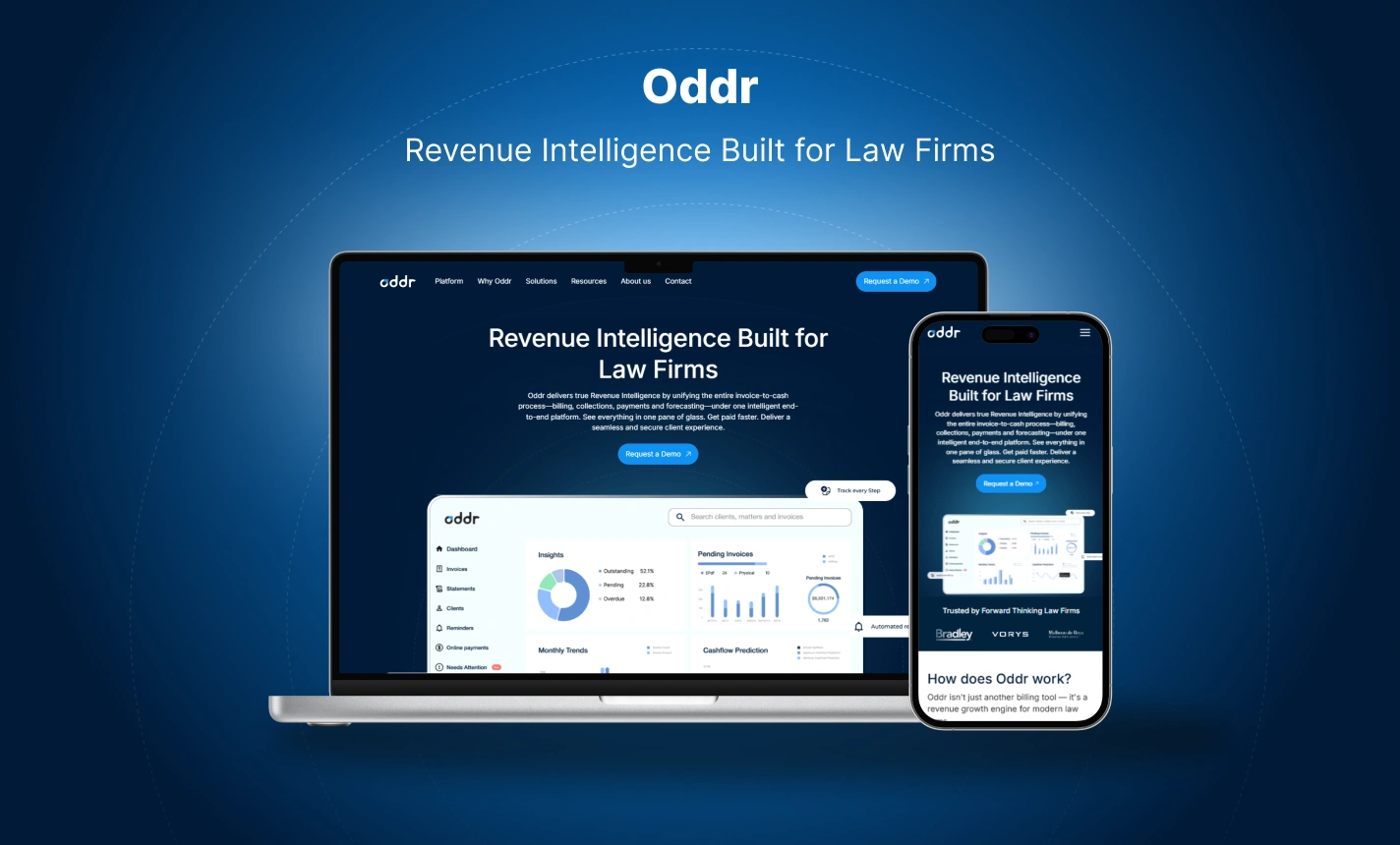 As the digital design and development partner for Oddr, we delivered a streamlined, confidence-building website that effectively positioned the brand as the legal industry’s first Revenue Intelligence platform. Through intuitive design, clear messaging, and impactful visual storytelling—from automated billing to AI forecasting—we illustrated real value for law firms. With signature metrics, client testimonials, and leadership narratives, the site delivers clarity, authority, and a compelling invitation to explore Oddr’s transformative invoice-to-cash solution.