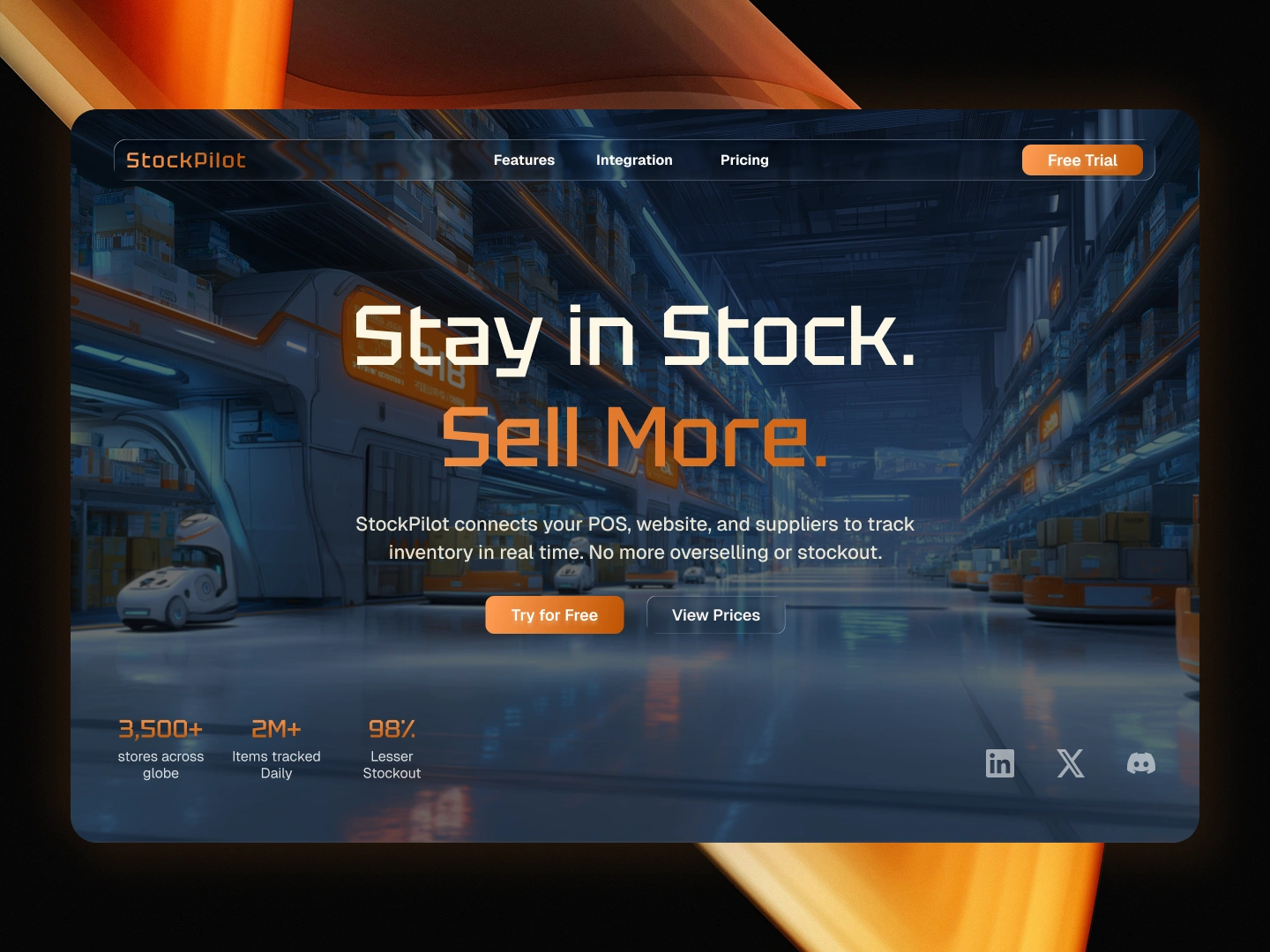 StockPilot’s hero section focuses on clarity for a B2B audience. The headline speaks directly to the pain point, which was staying in stock and selling more. The subheading explains exactly how the product connects POS systems, websites, and suppliers to provide real-time inventory tracking. A futuristic warehouse image with autonomous robots reinforces the scale and efficiency of the solution. Bullet-point stats in the social proof area make the product’s impact immediately tangible.