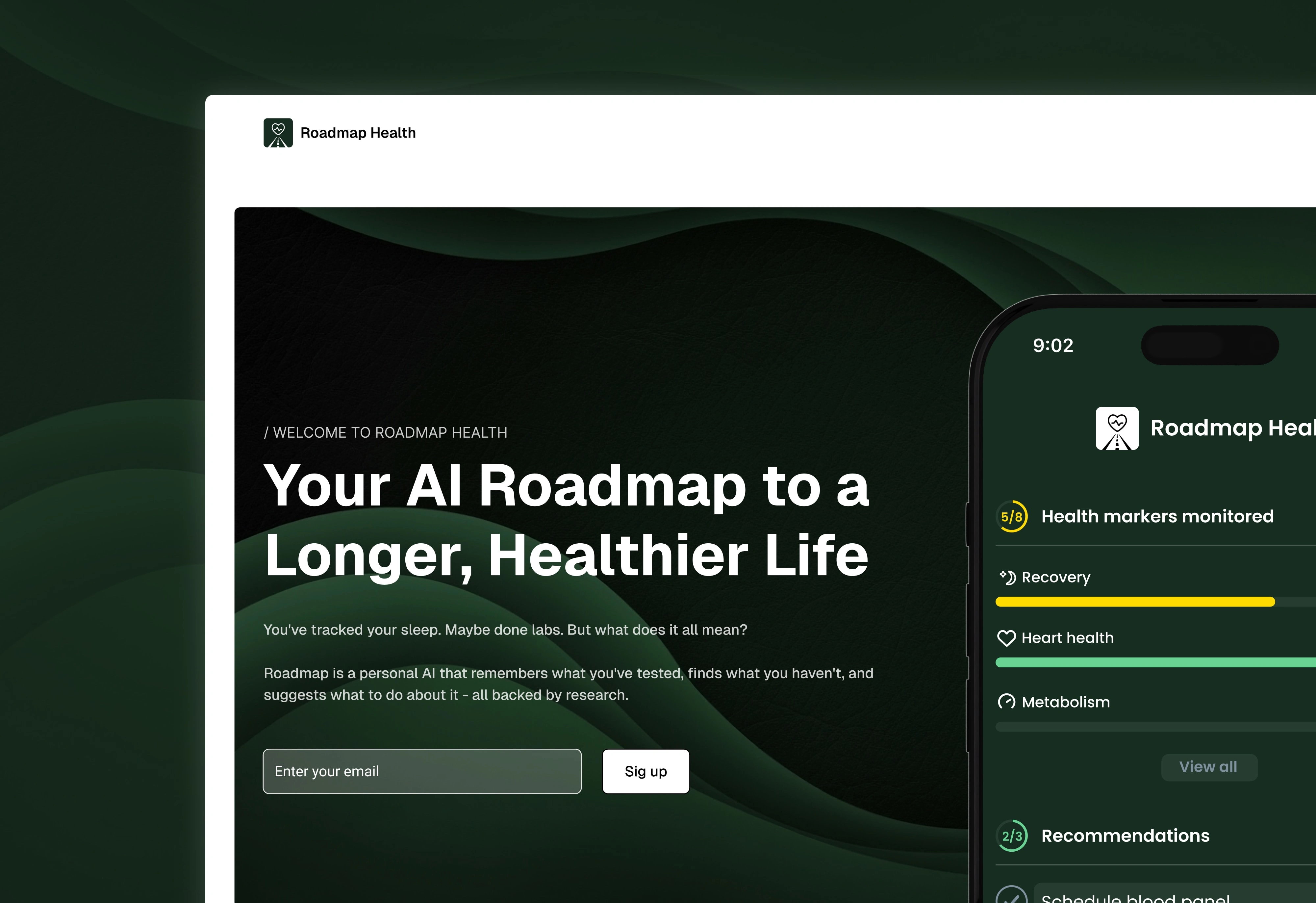 A calming dark green color scheme evokes growth, vitality, and nature-inspired wellness, contrasted with clean white text for readability and a subtle white logo for branding. Fluid, curved shapes in the background add a modern, organic flow, symbolizing life's roadmap. Bold, sans-serif typography emphasizes key phrases like "Your AI Roadmap to a Longer, Healthier Life," while supporting copy addresses user pain points (e.g., "Tracked your sleep. Maybe done labs. But what does it all mean?").