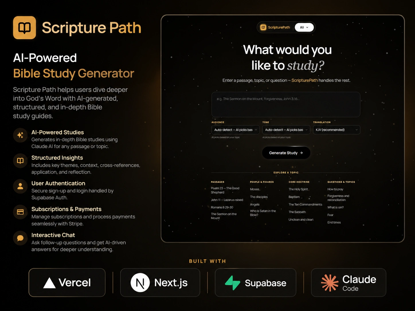 Full-stack AI Bible study web app. Claude-powered study generation, Supabase auth, KJV API, credit system, PDF export. Zero to deployed MVP in 30 days.