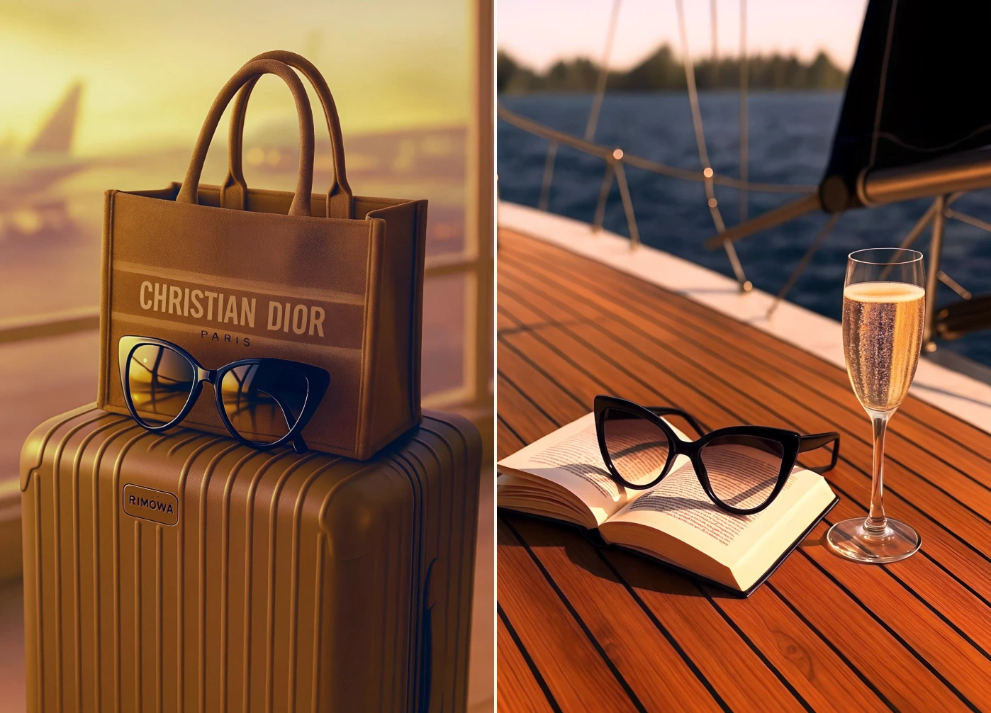 Lifestyle context (on a yacht with champagne, in Paris, at the airport)