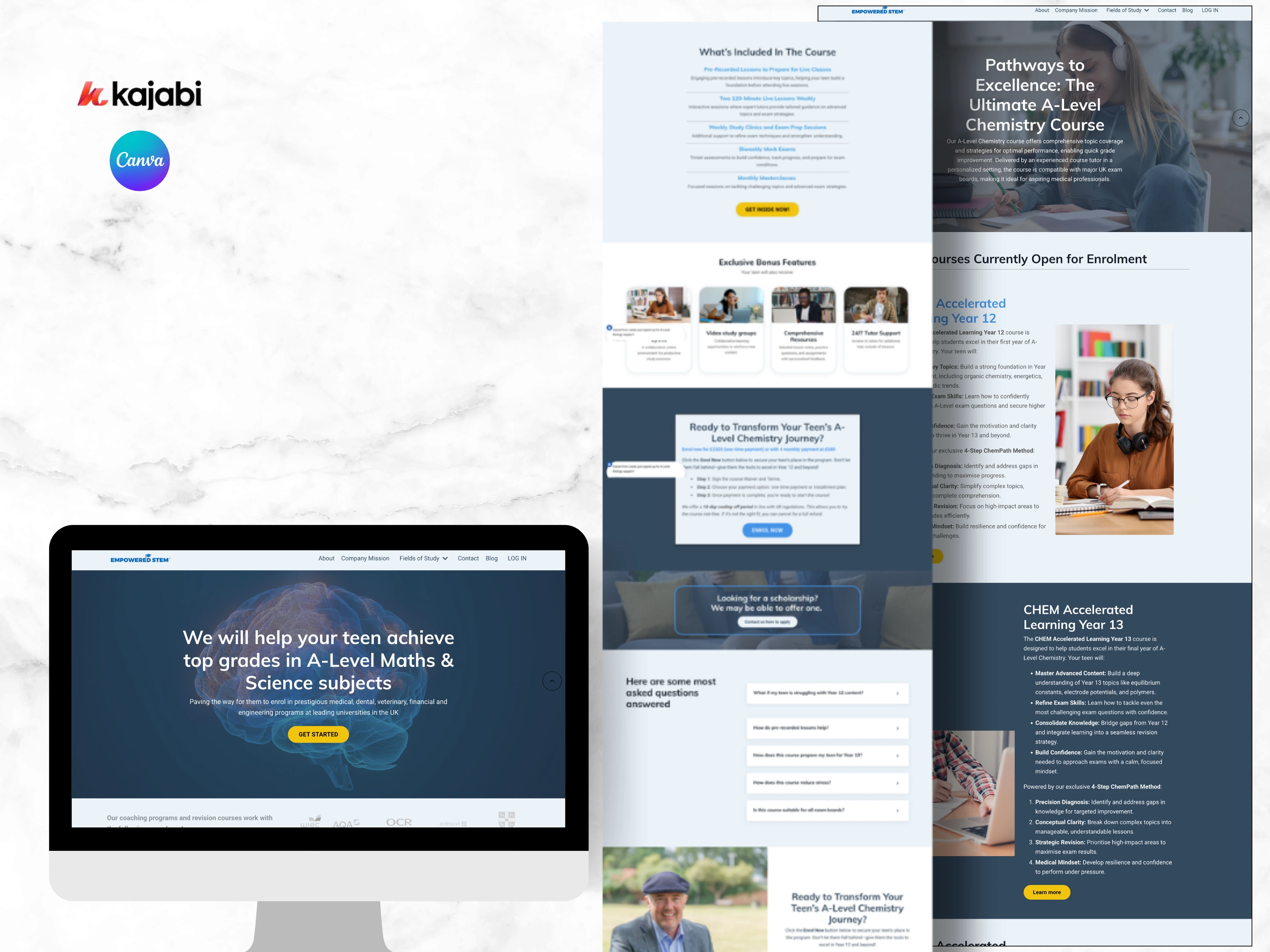 EmpoweredSTEM’s founder, Dr. Graeme Matthews, first reached out to me in 2021 through my Kajabi Expert profile. At the time, he was in the early stages of launching his educational brand and needed a professional website to represent EmpoweredSTEM’s mission — helping A-Level students reach academic excellence through neuroscience-based study strategies.