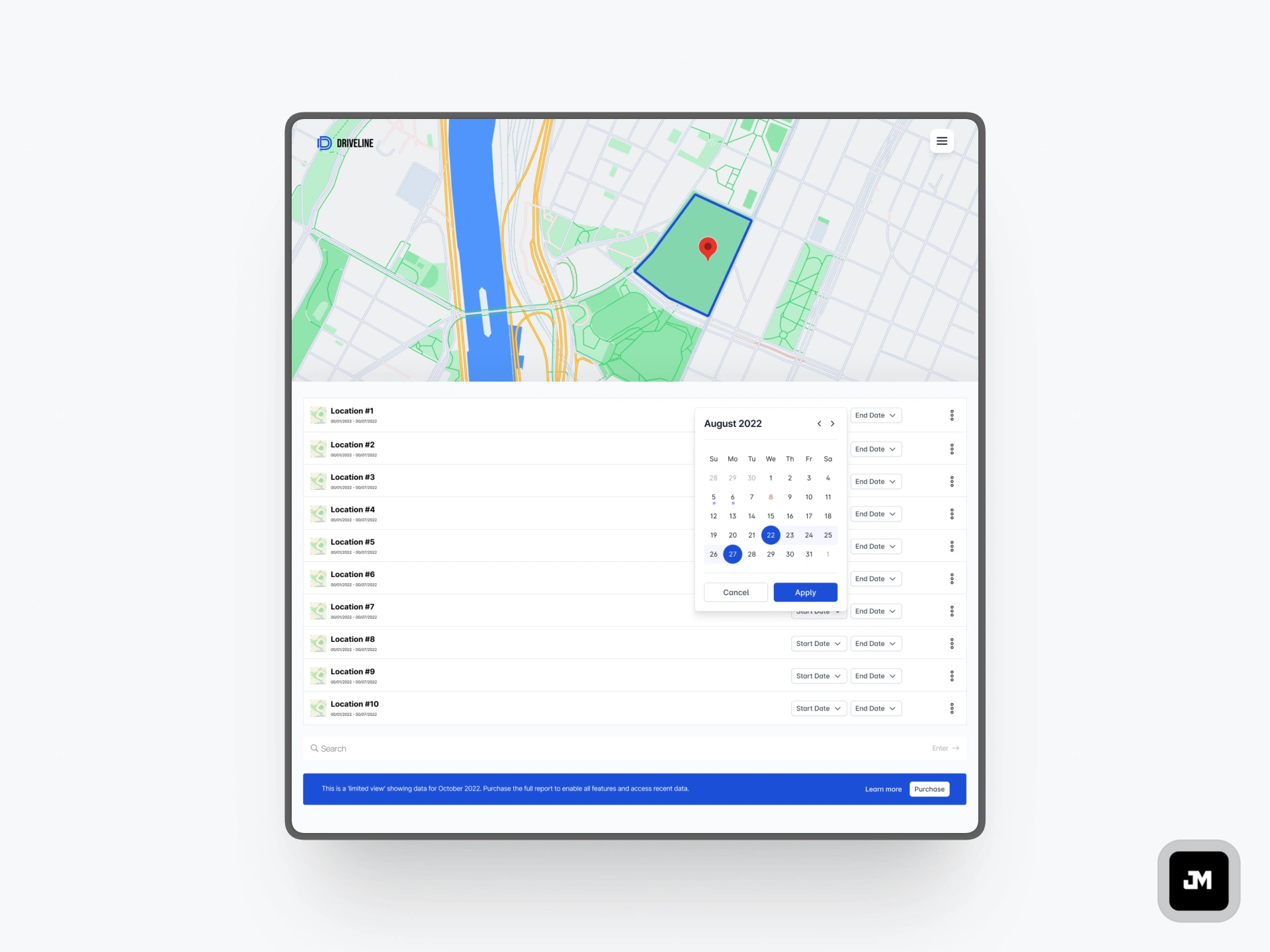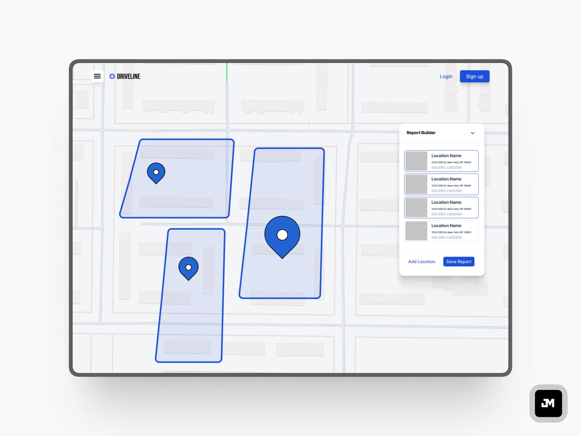 The scope covered user flows, information architecture, geo-fencing map UI, report builder, and a reusable component library built for developer handoff in Zeplin.