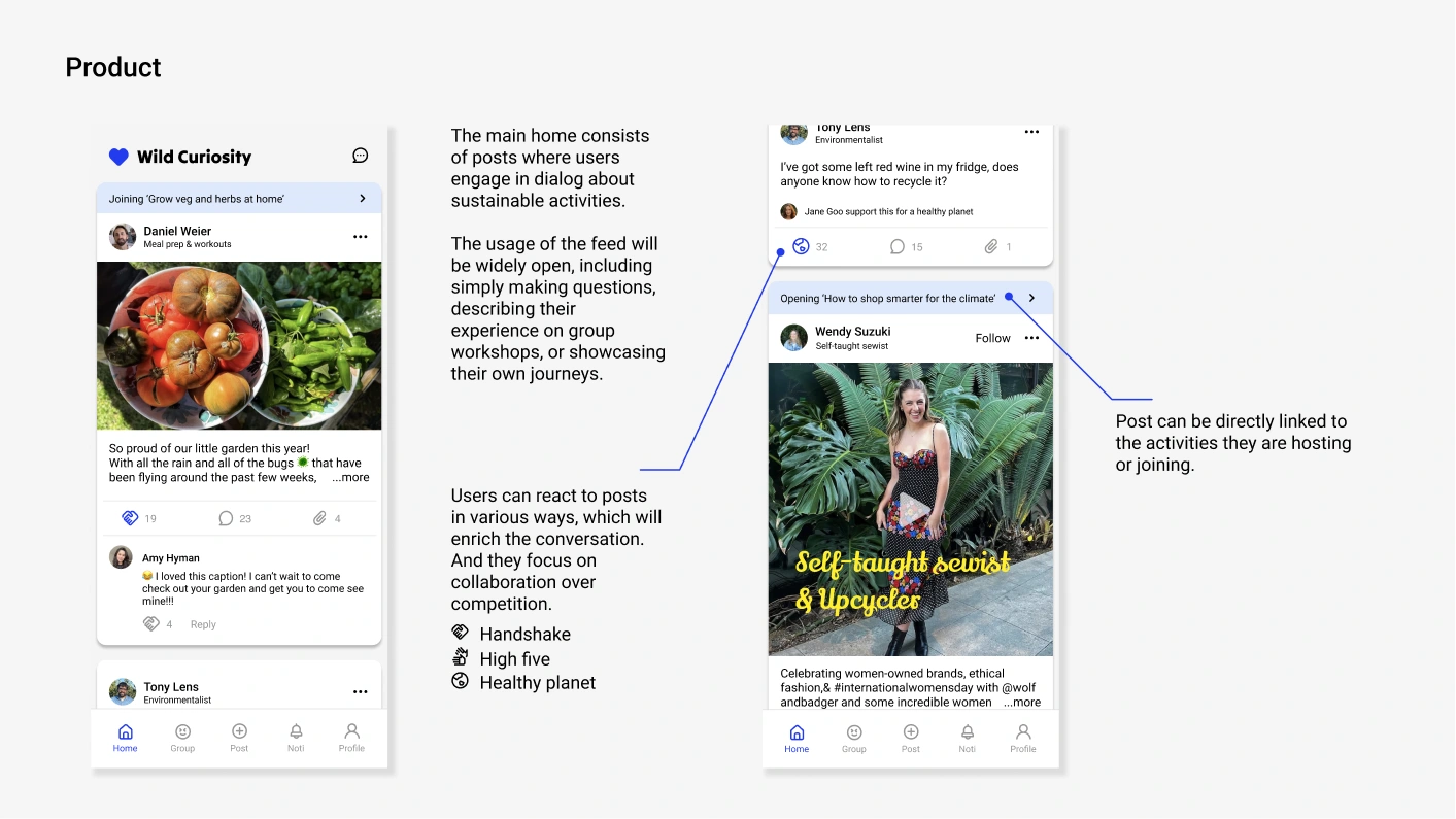 Created community-focused UX with home feeds for sharing, collaborative reactions, and profile journeys. Workshop feature enables themed learning sessions.