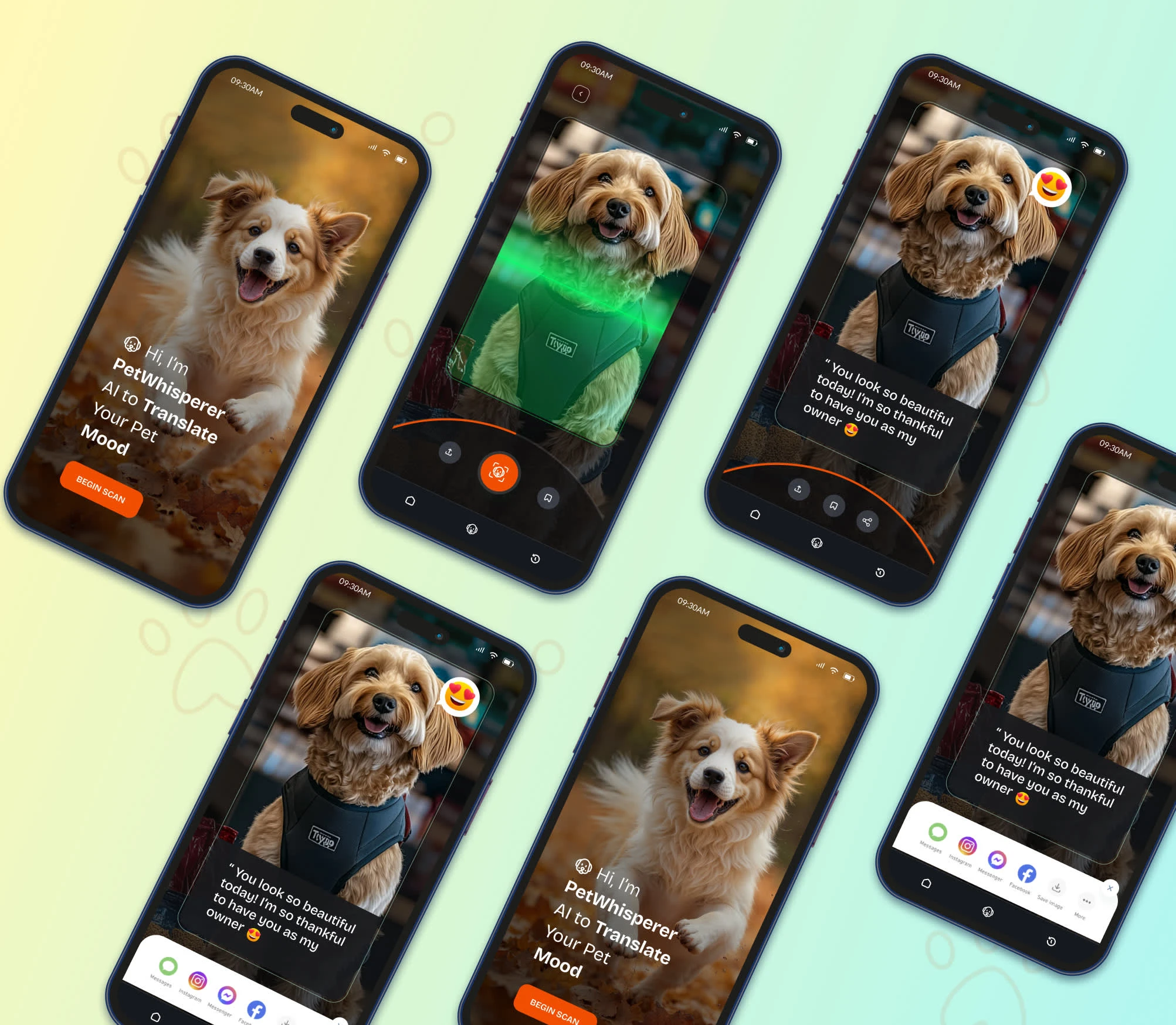 Mood Translation: A message is displayed, e.g., “You look so beautiful today! I’m so thankful to have you as my owner.” if the dog is happy.
