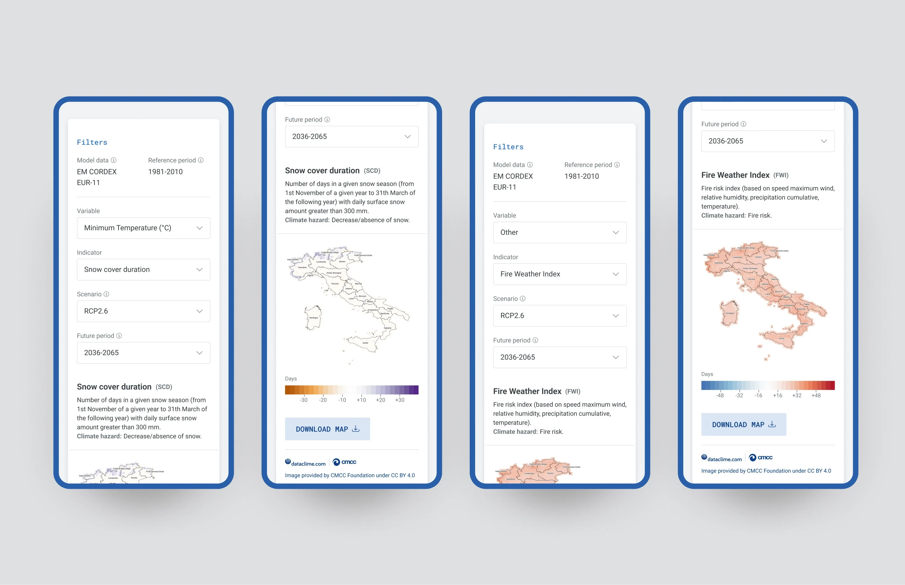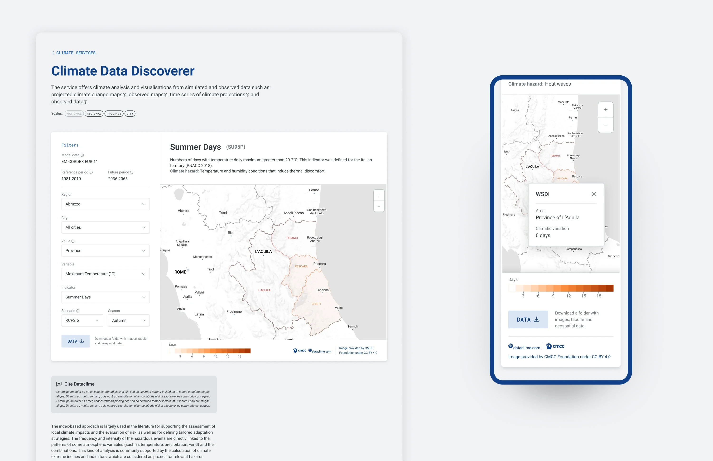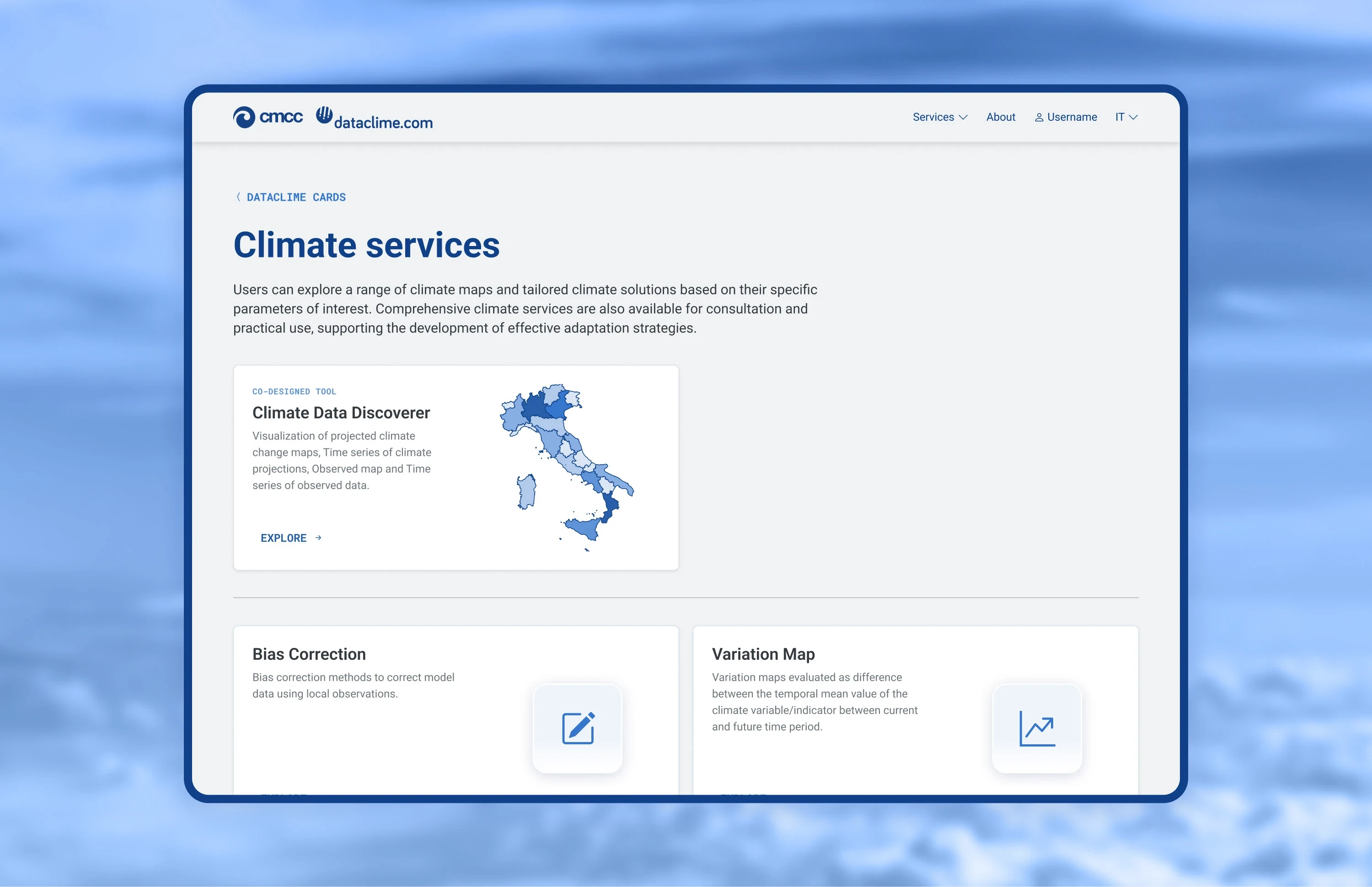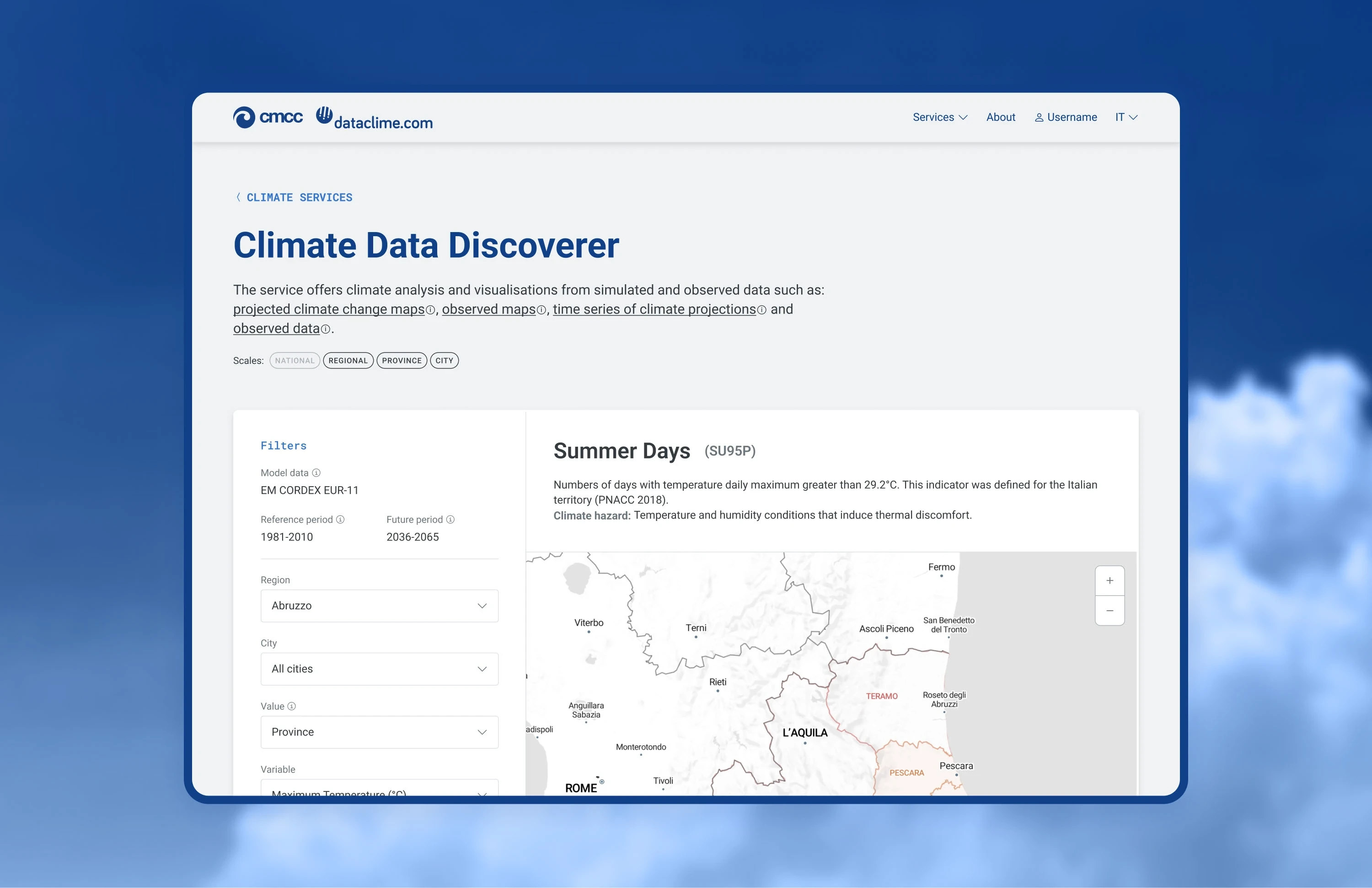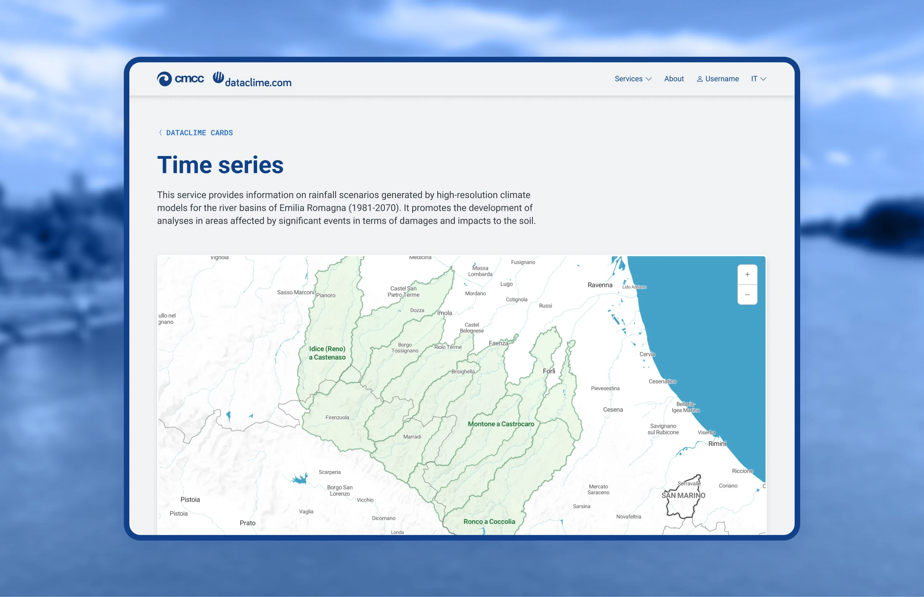 Developed by the Regional Models and Geo-Hydrological Impacts Division (REMHI) of the Institute for Climate Resilience (ICR) at the CMCC Foundation (Euro-Mediterranean Center on Climate Change), Dataclime has been operational since 2018. In 2024, I redesigned the platform, enhancing the user interface, improving map visualizations, and optimizing the overall user experience. Following these improvements, Dataclime now offers a suite of new services and features.