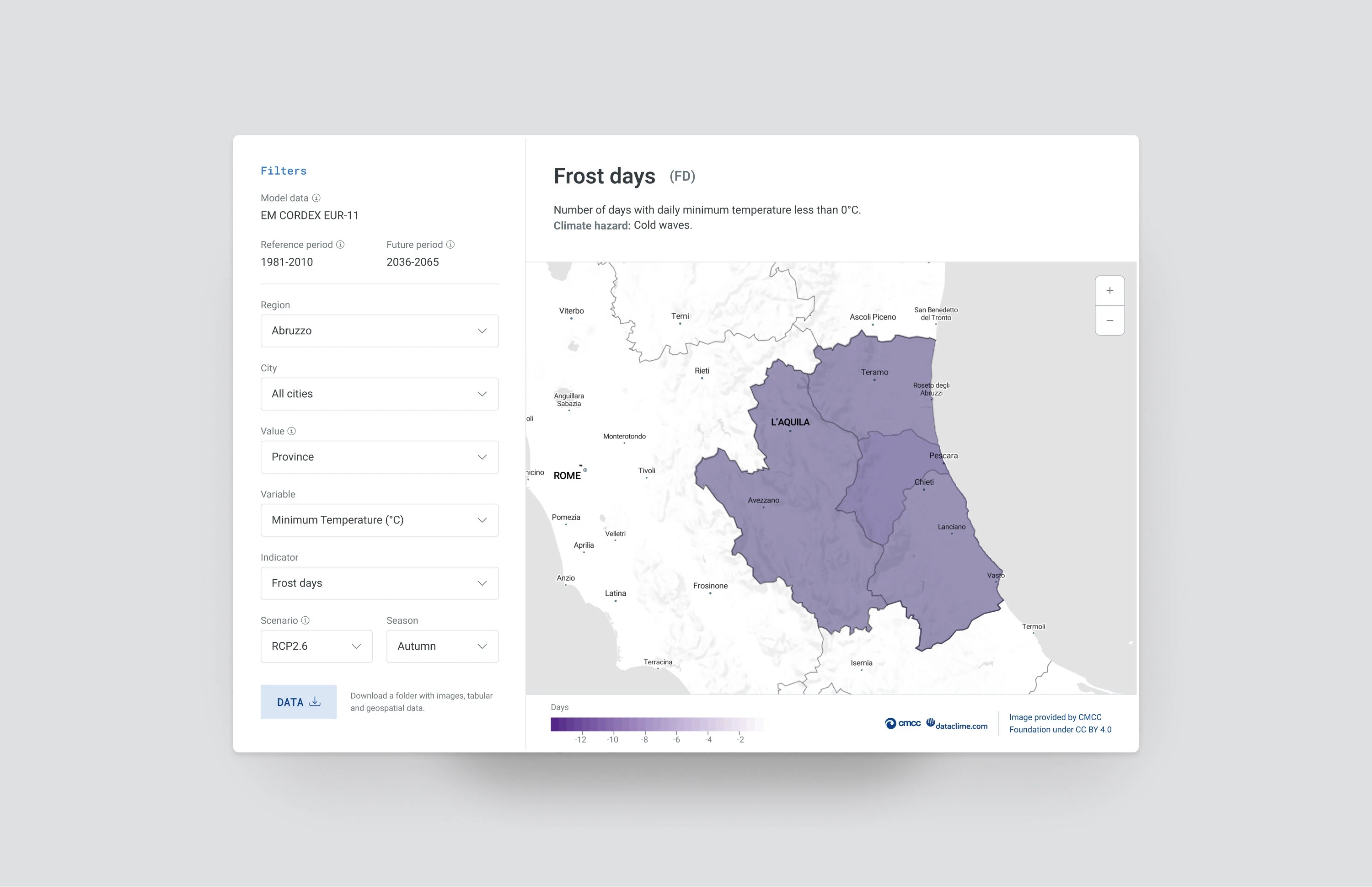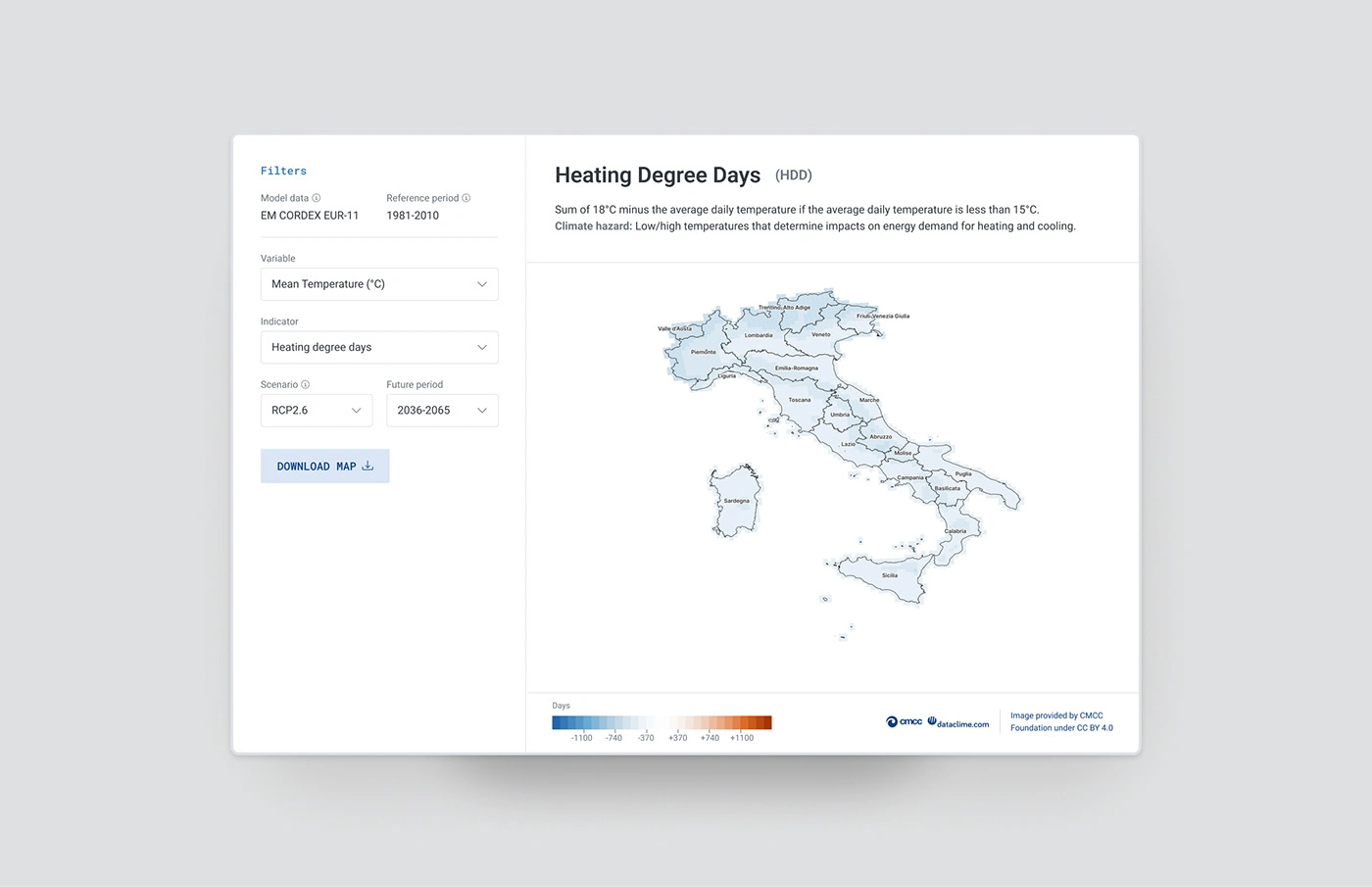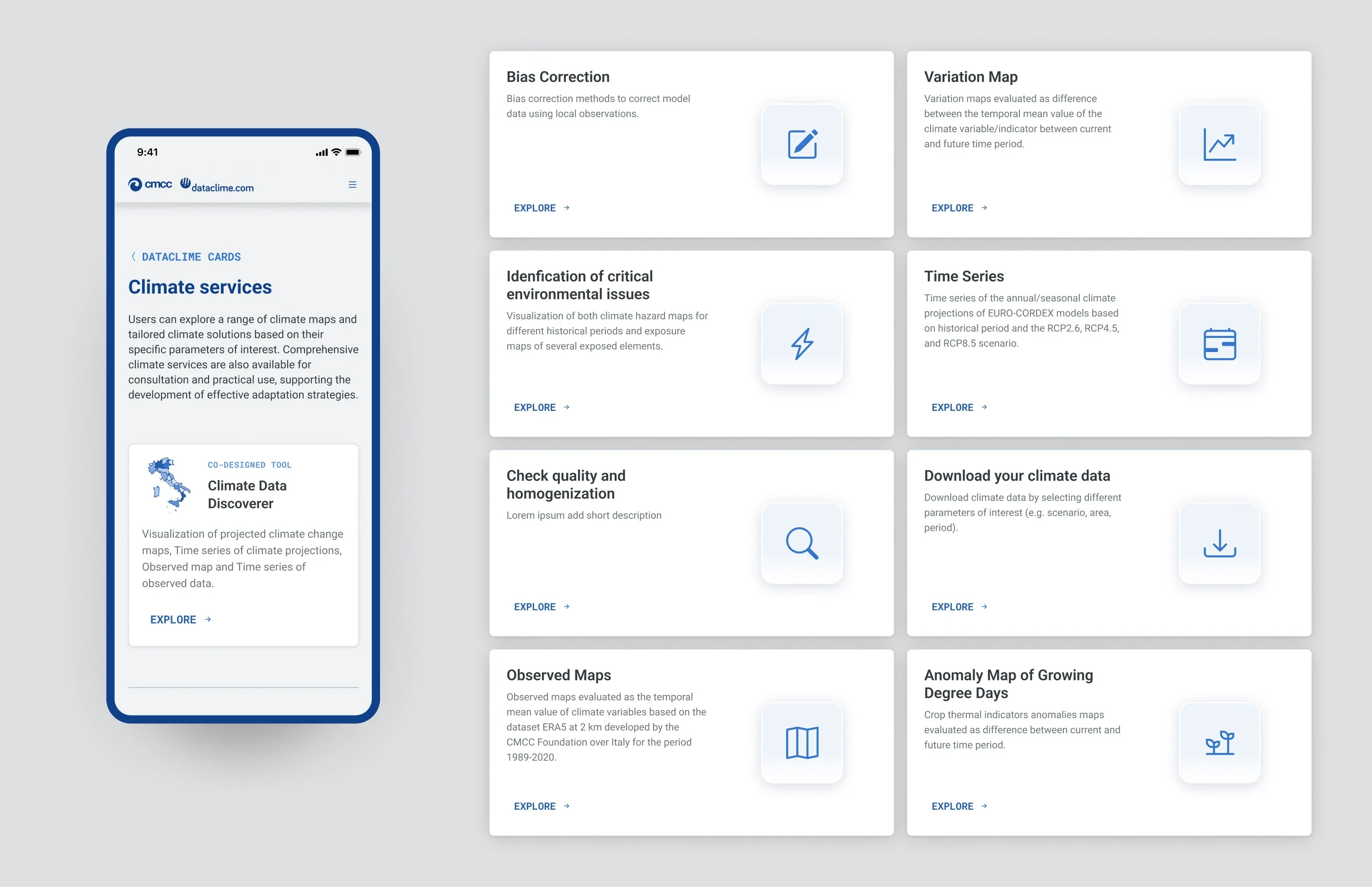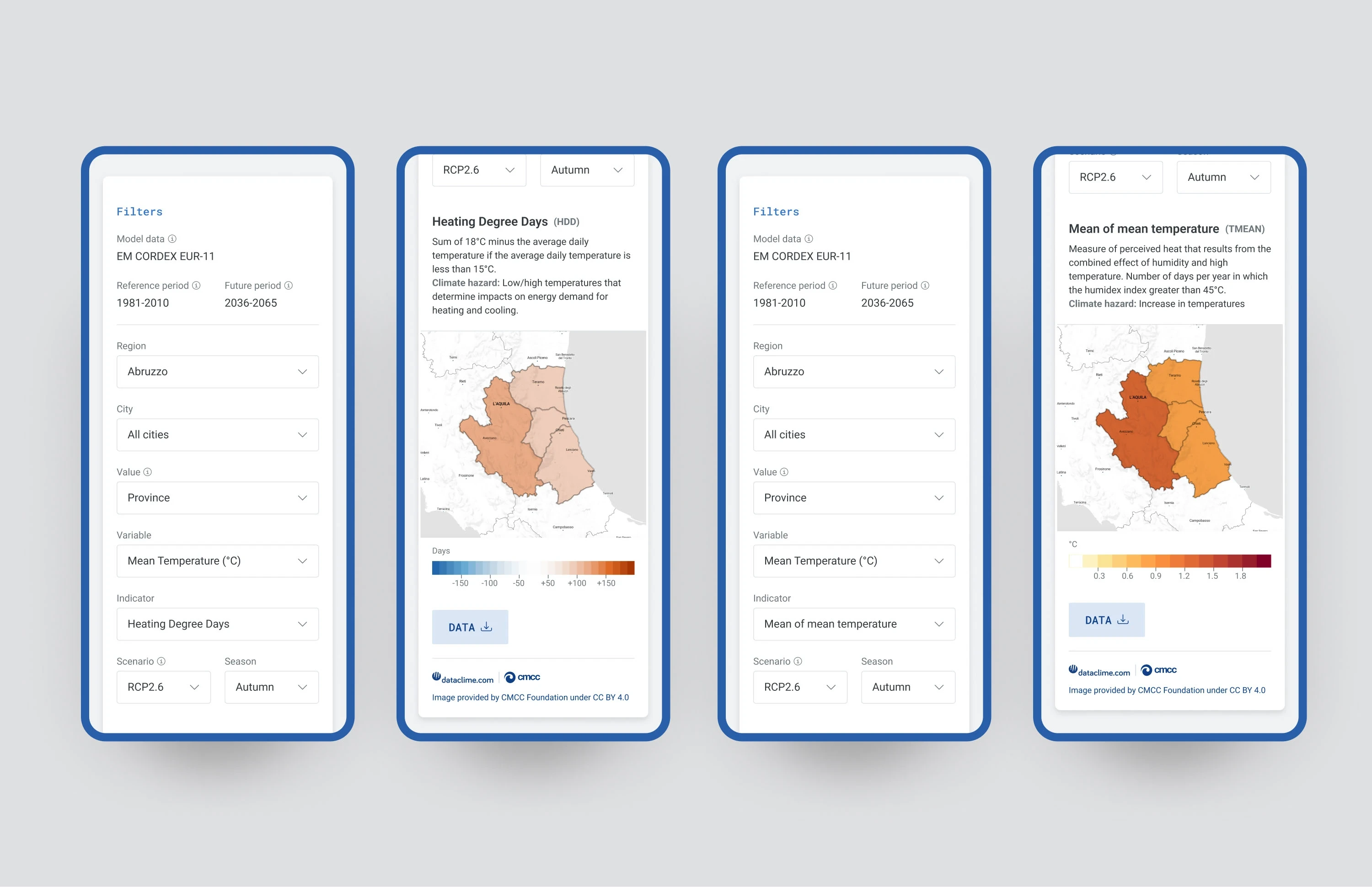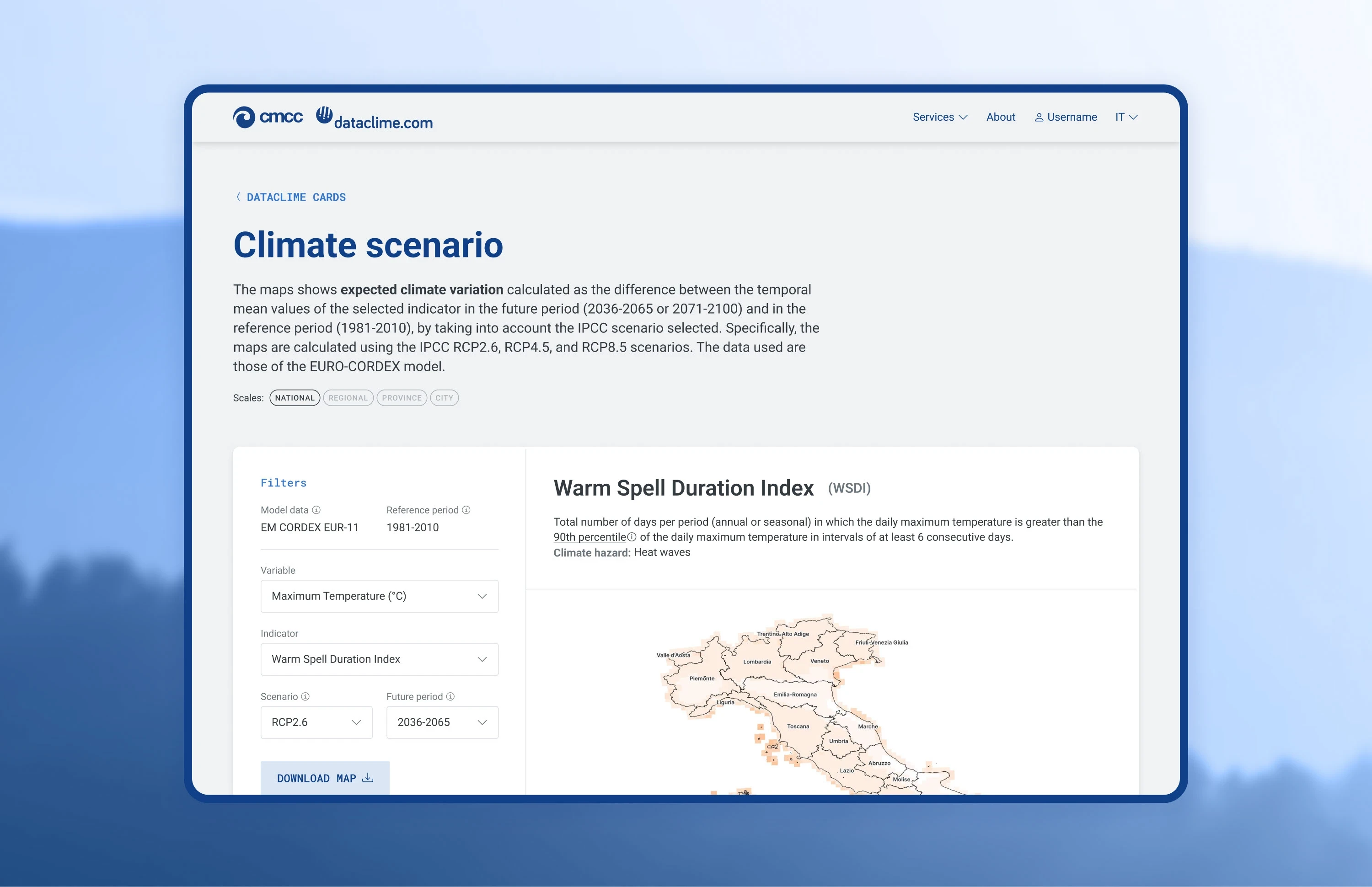 Developed by the Regional Models and Geo-Hydrological Impacts Division (REMHI) of the Institute for Climate Resilience (ICR) at the CMCC Foundation (Euro-Mediterranean Center on Climate Change), Dataclime has been operational since 2018. In 2024, I redesigned the platform, enhancing the user interface, improving map visualizations, and optimizing the overall user experience. Following these improvements, Dataclime now offers a suite of new services and features.