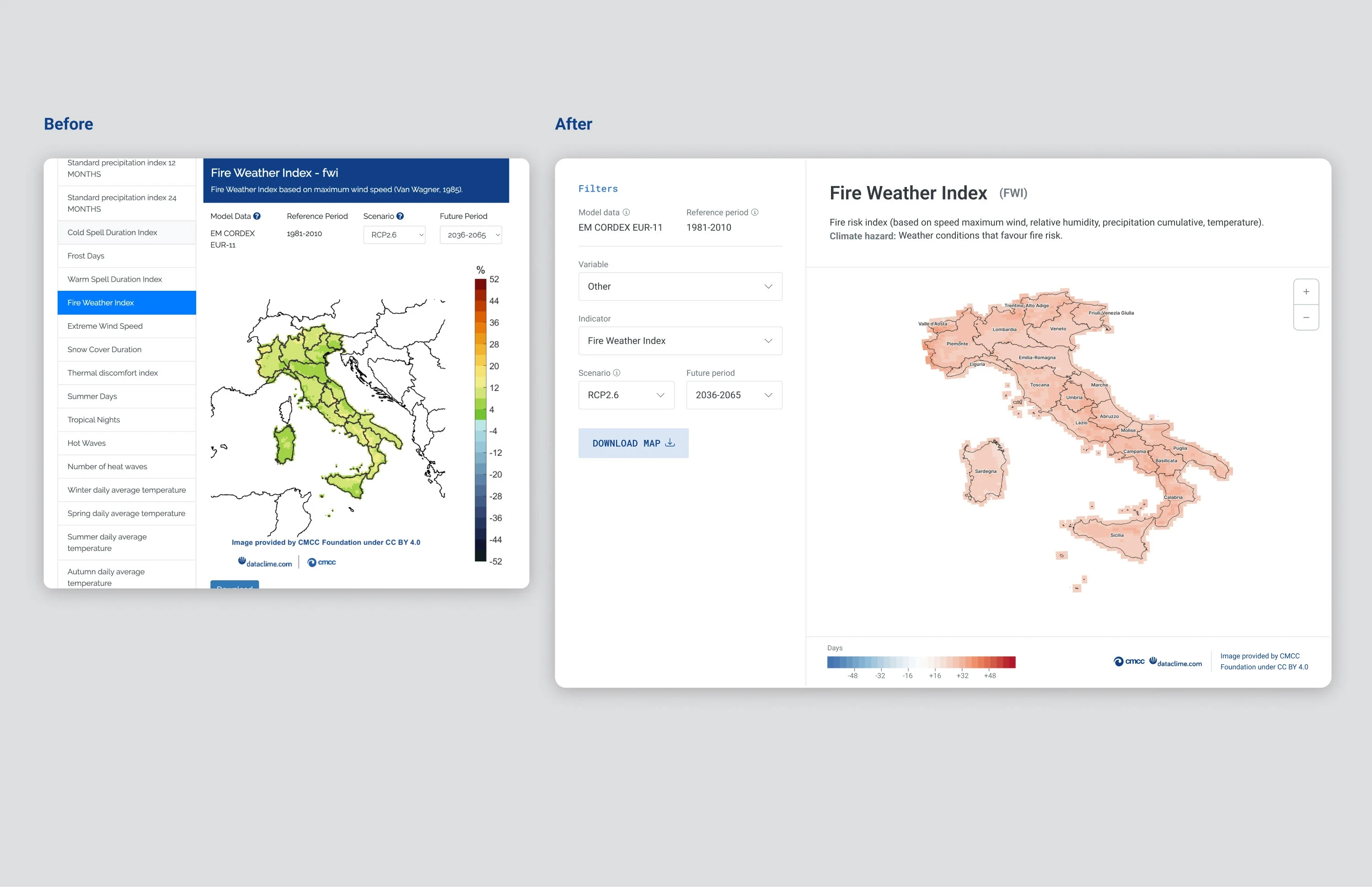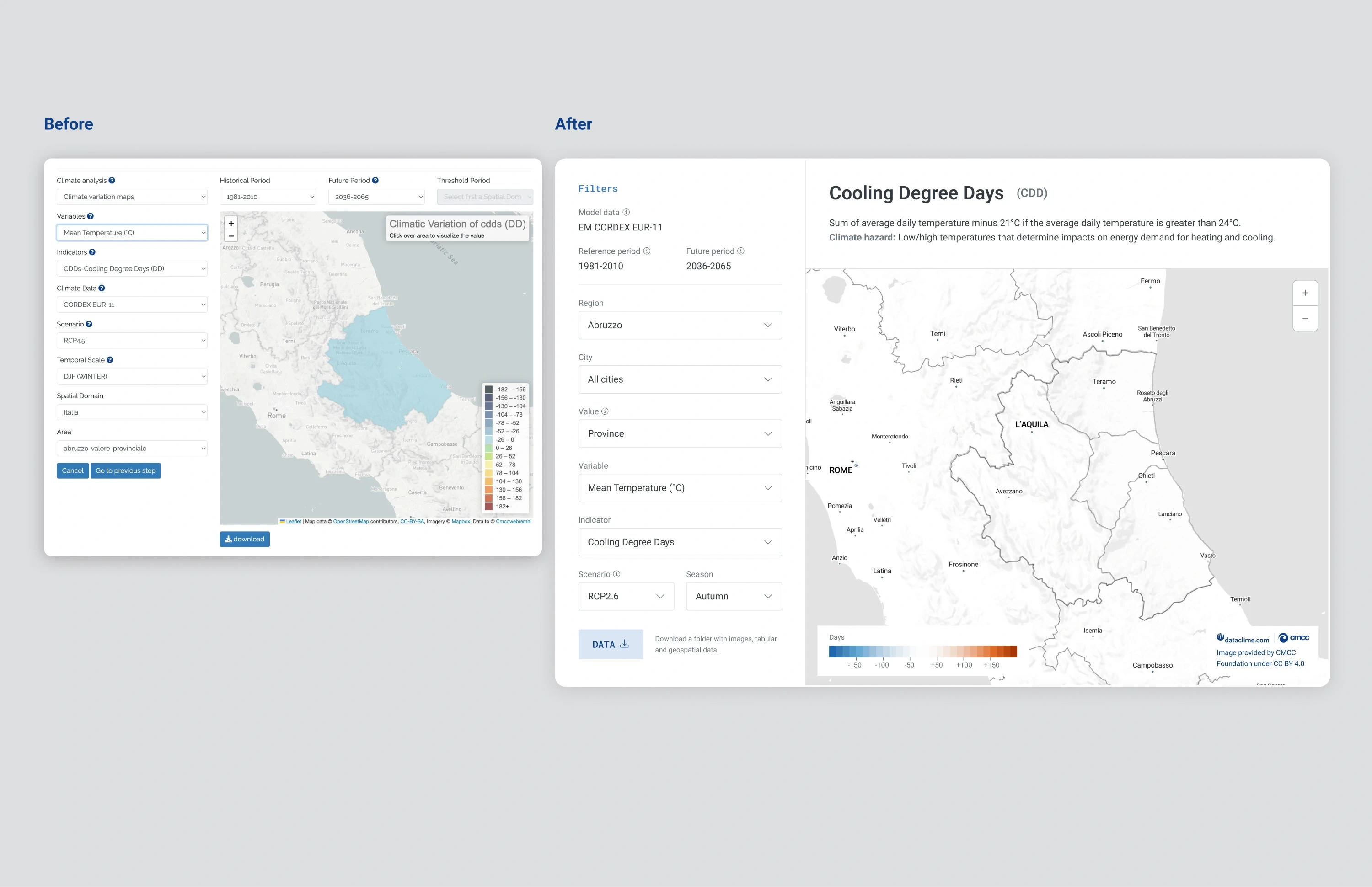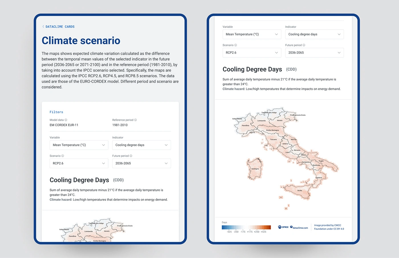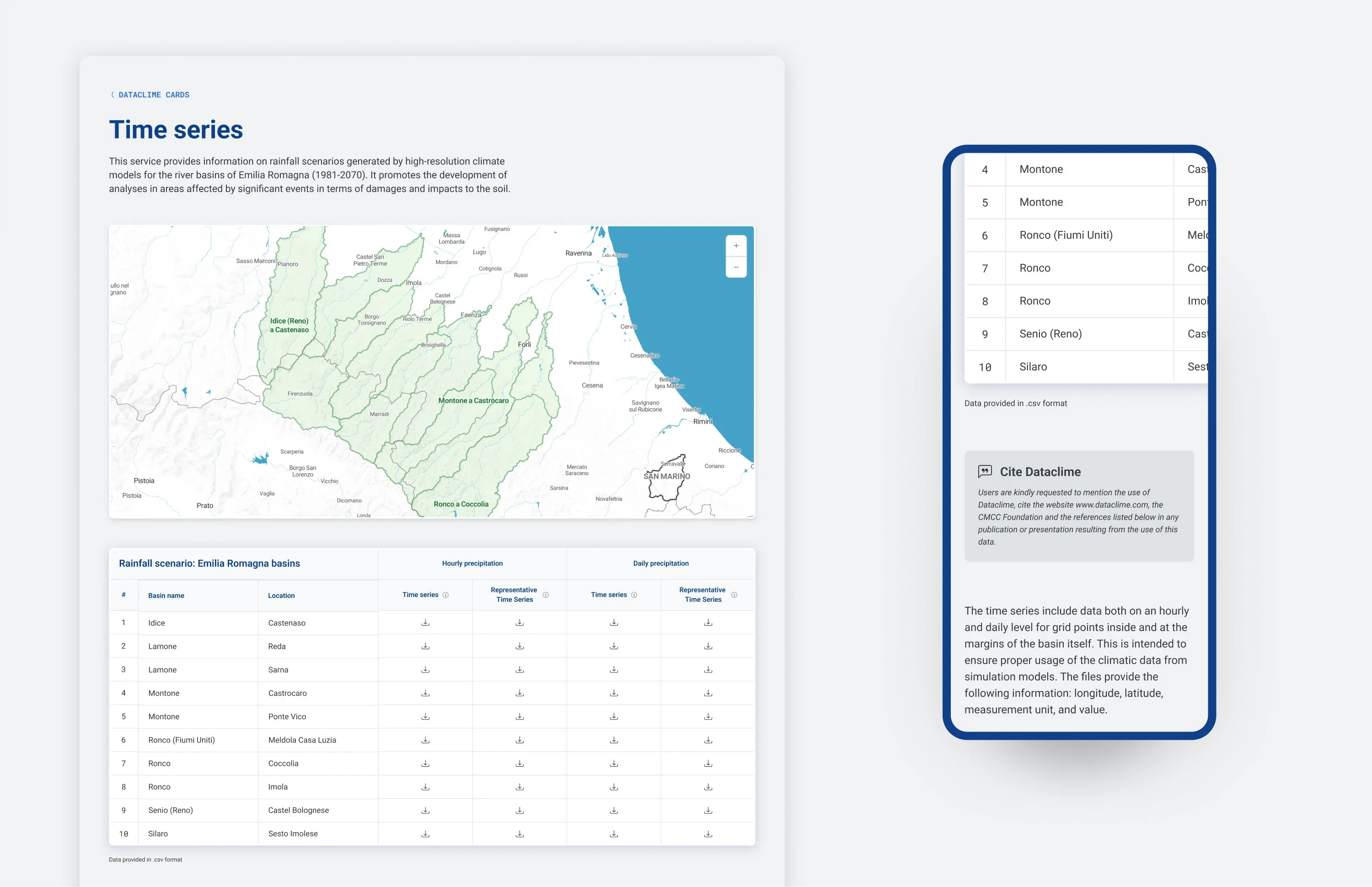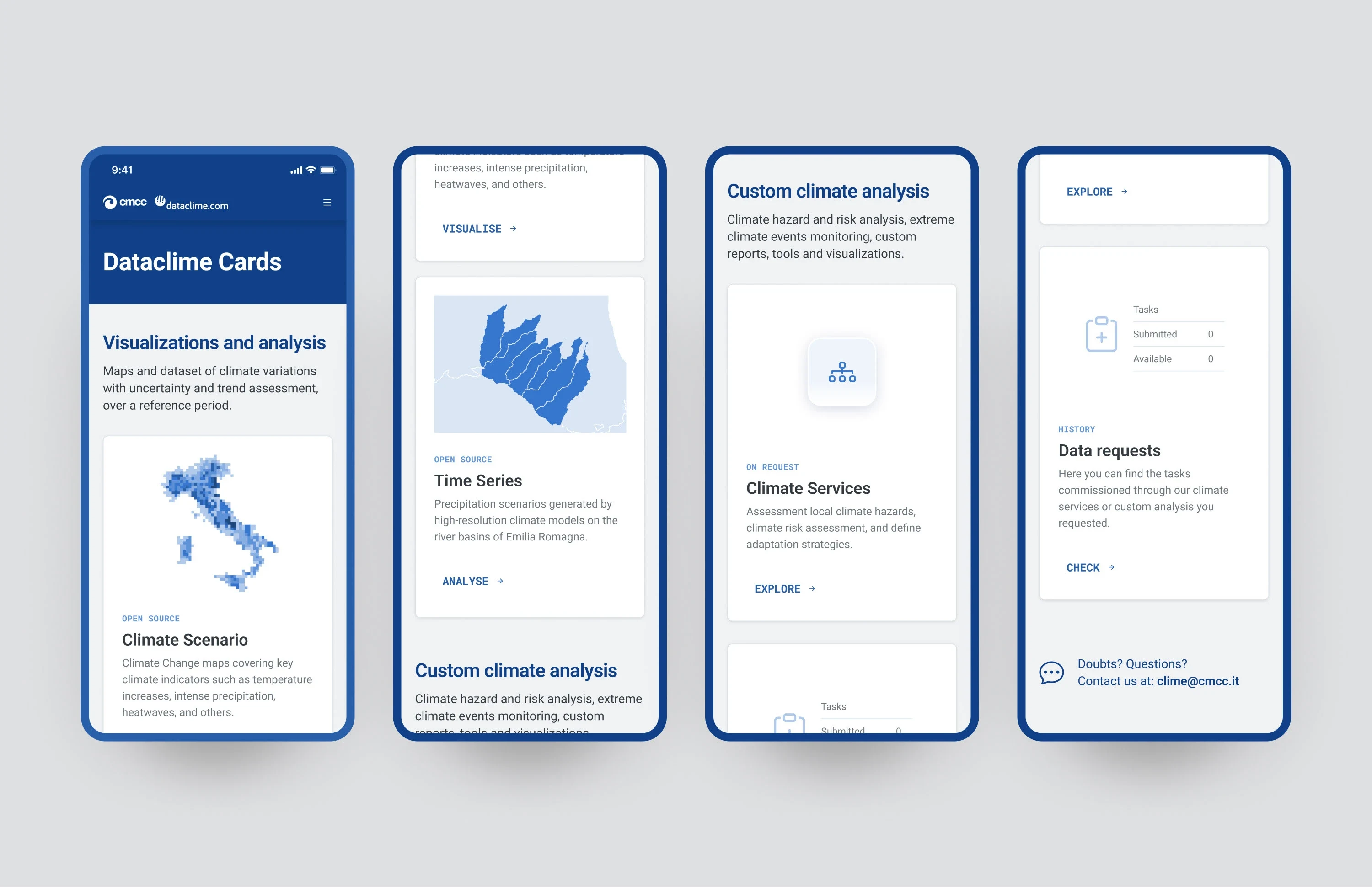 Developed by the Regional Models and Geo-Hydrological Impacts Division (REMHI) of the Institute for Climate Resilience (ICR) at the CMCC Foundation (Euro-Mediterranean Center on Climate Change), Dataclime has been operational since 2018. In 2024, I redesigned the platform, enhancing the user interface, improving map visualizations, and optimizing the overall user experience. Following these improvements, Dataclime now offers a suite of new services and features.