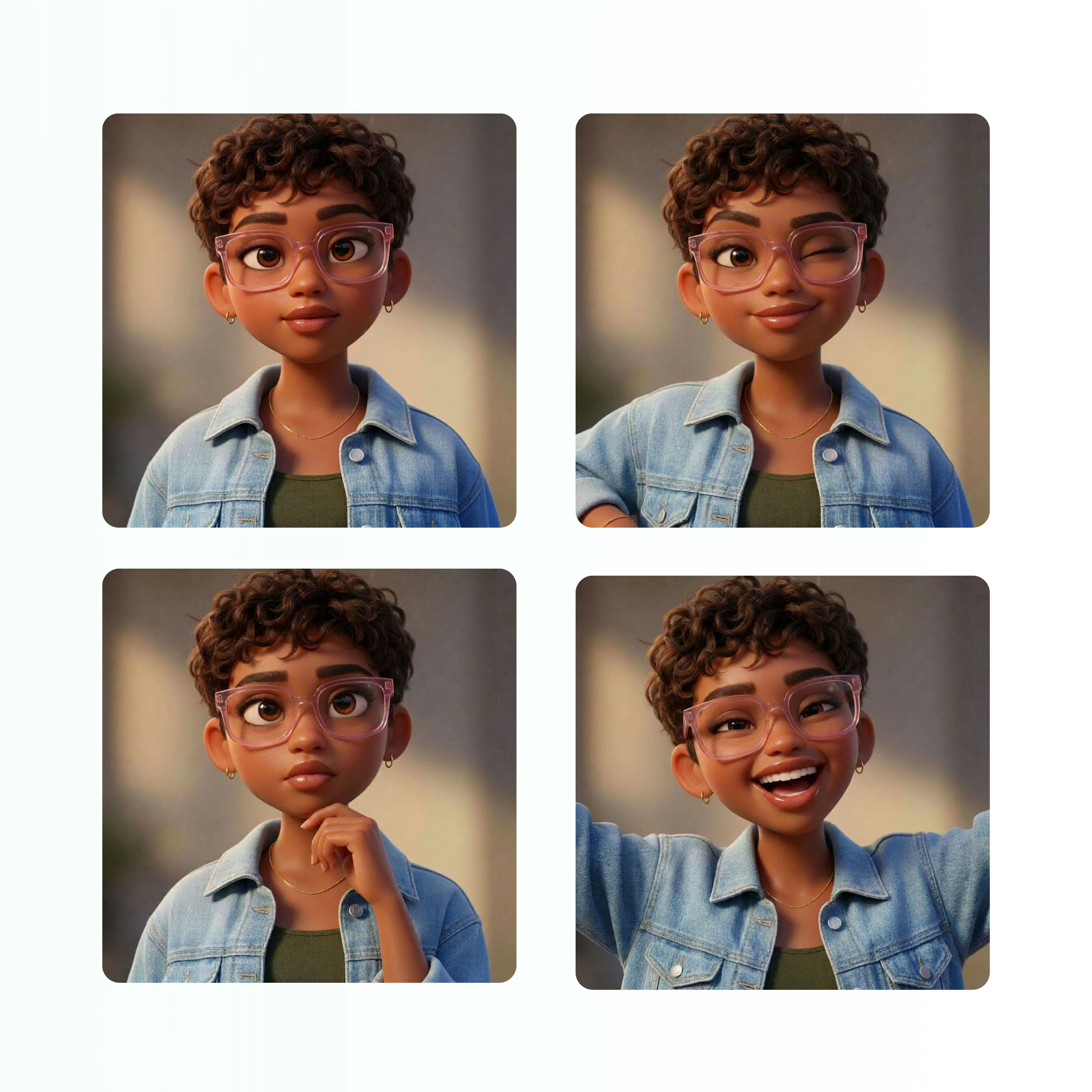 A Pixar-inspired character sheet exploring personality and expression, maintaining consistency across multiple emotions and stylized animation-ready visuals.