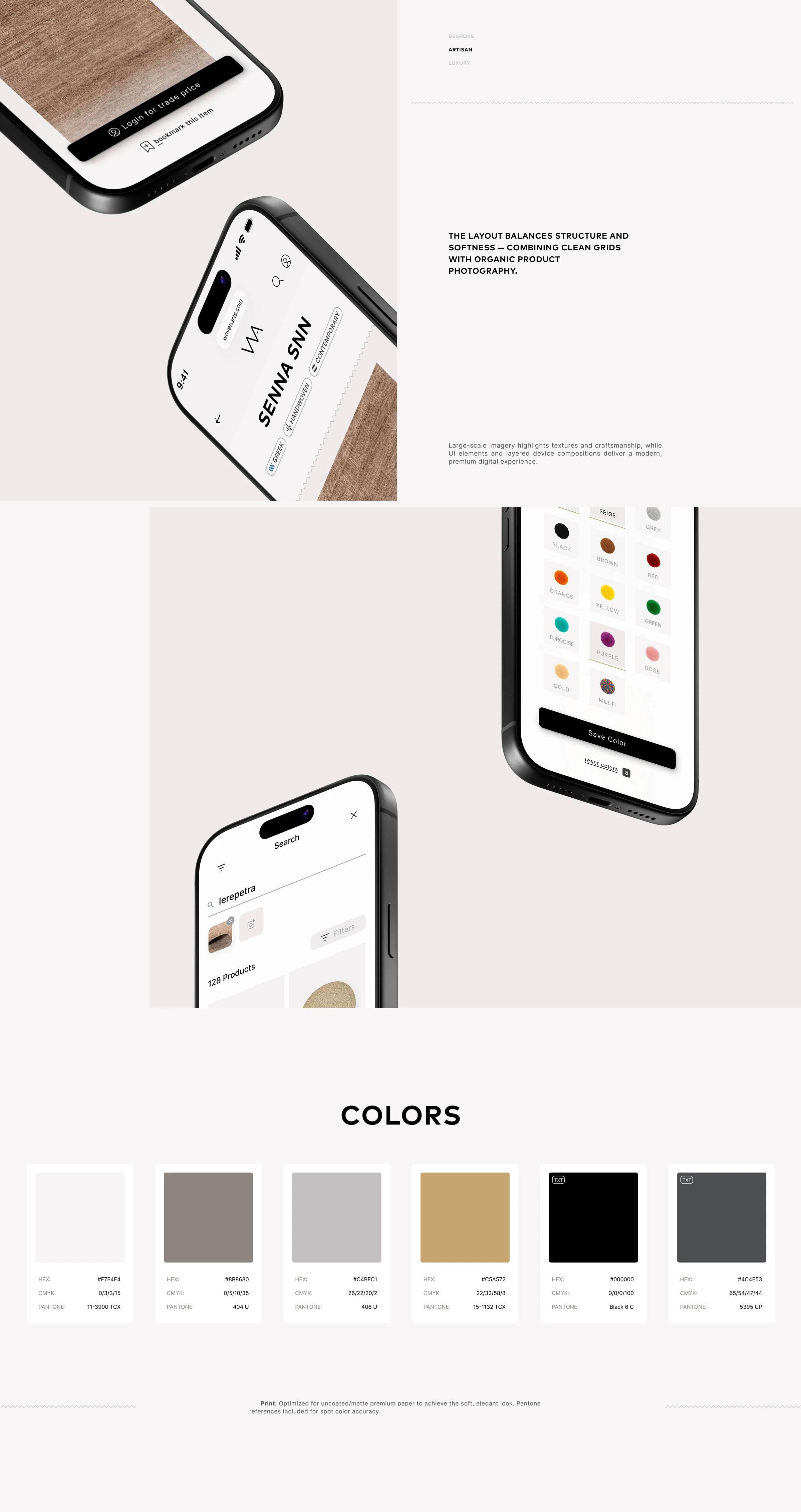 Large-scale imagery highlights textures and craftsmanship, while UI elements and layered device compositions deliver a modern, premium digital experience.