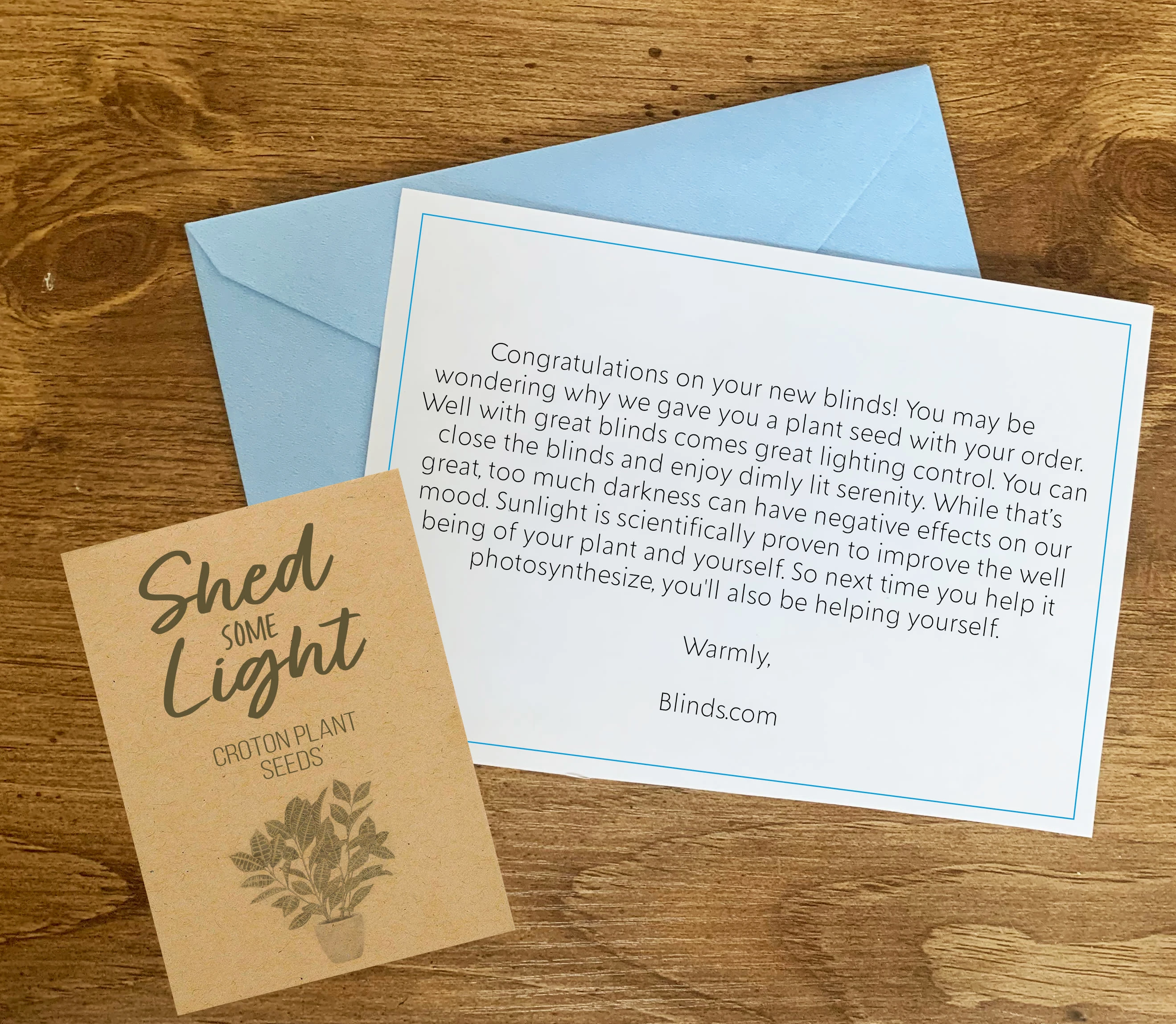 This complementary card explains why we're including plant seeds with blinds purchases.