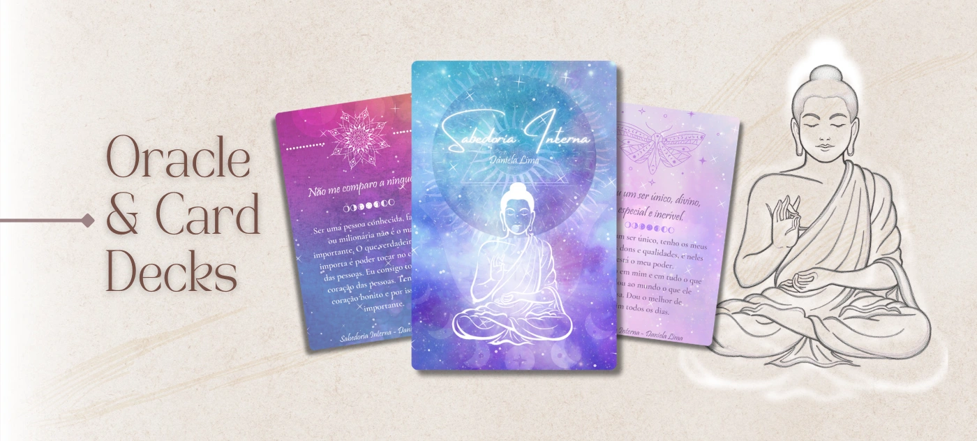 Custom-designed oracle and affirmation card decks, each with unique backgrounds, messages, and symbolic elements aligned with the project’s theme.