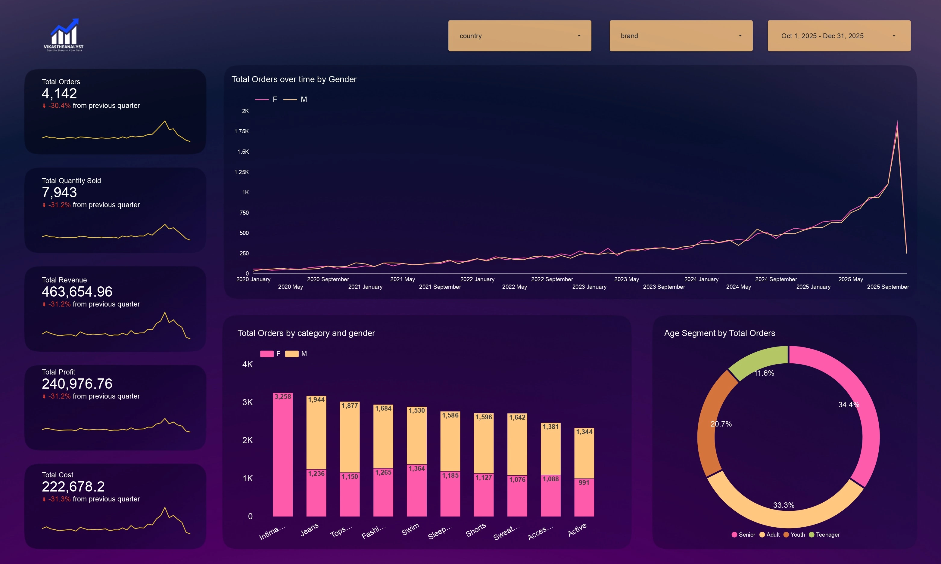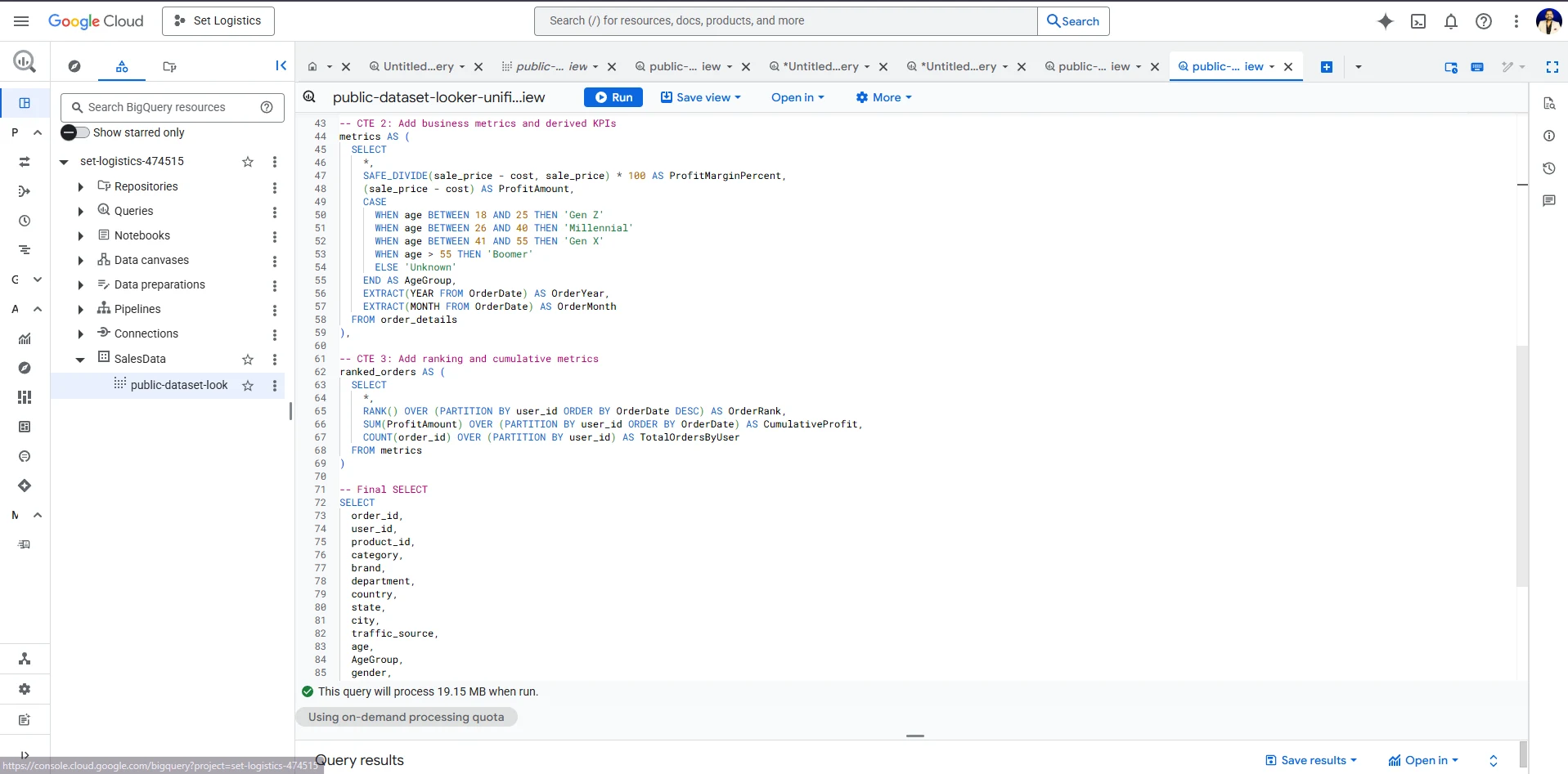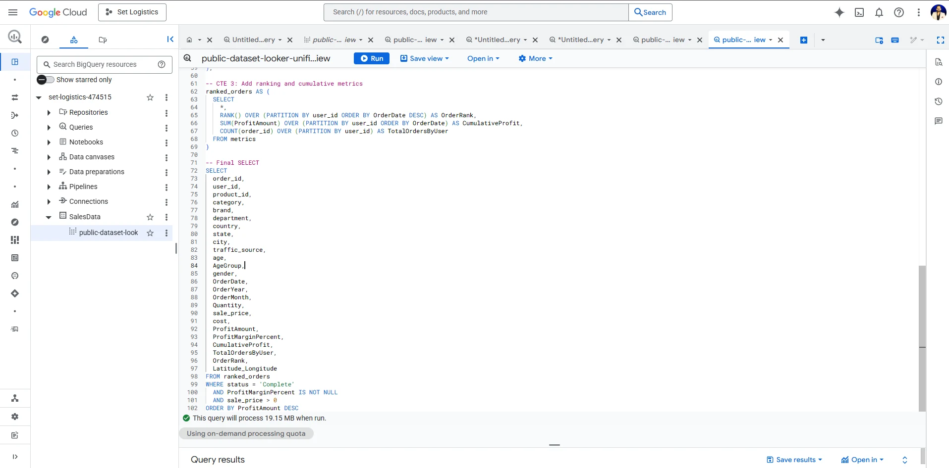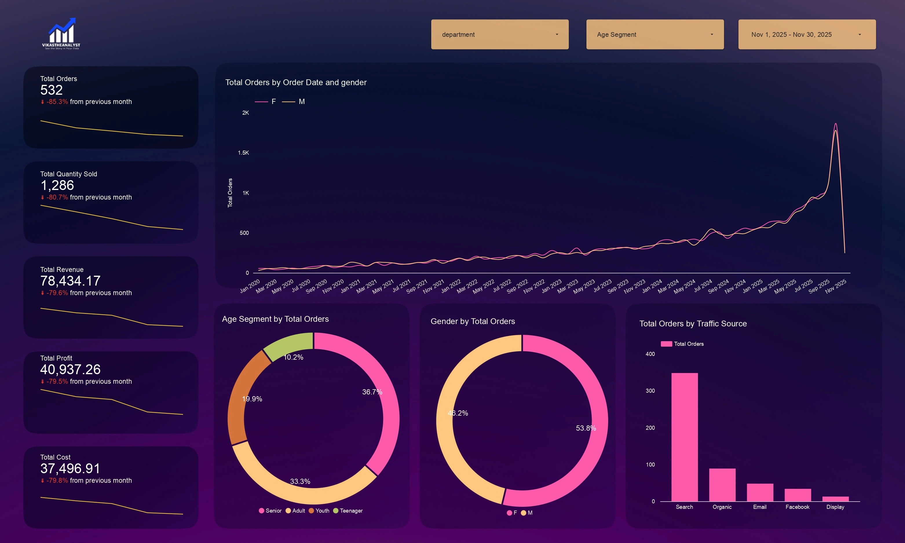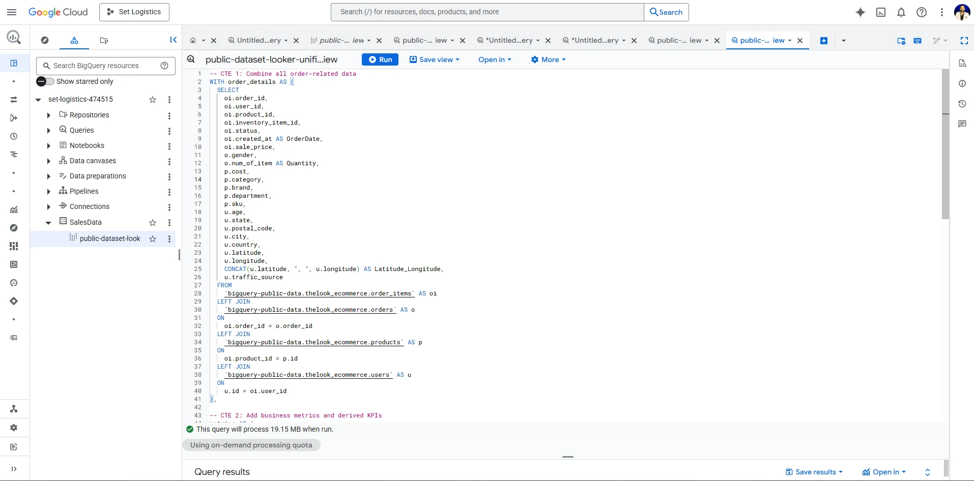 Developed a 5-page Ecommerce Analytics Report in Looker Studio using BigQuery public dataset "thelook_ecommerce." Combined multiple tables — Orders, Products, Order Items, and Users — through advanced SQL joins to create a unified view. The connected dataset enabled rich, interactive dashboards showing sales, customer, and product insights. Leveraged BigQuery, SQL, and Looker Studio to deliver a powerful data-driven visualization.