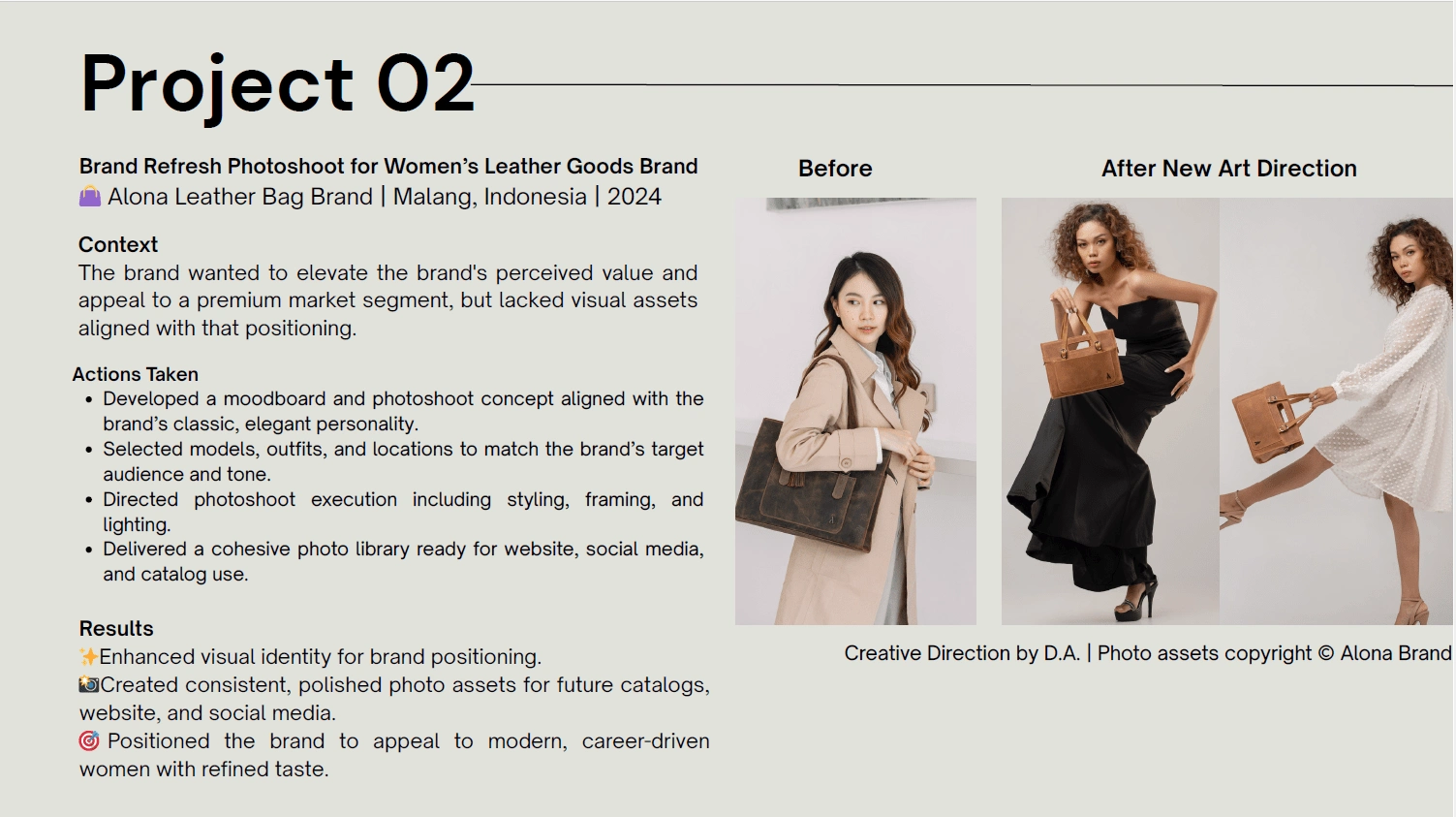 Directed a brand photoshoot to reposition a women’s leather bag brand into a more premium and refined market. I led the moodboard development, model and outfit selection, as well as visual execution including styling, framing, and lighting direction. The result was a polished, consistent photo library aligned with the brand’s elegant identity, ready for use across web, catalog, and social media.