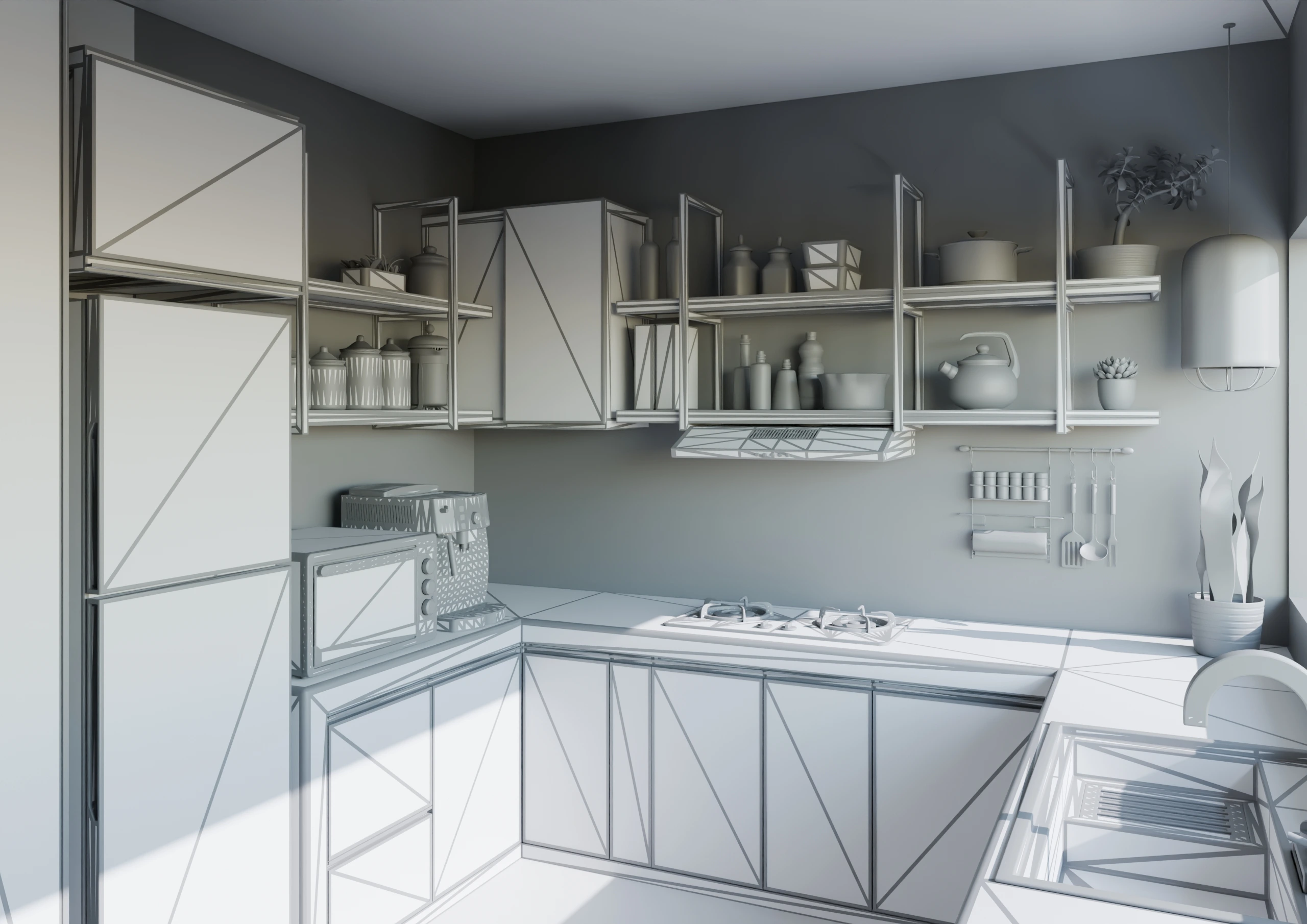 Industrial style kitchen design with raw materials such as brick and concrete. Rendered in a calm morning mood.