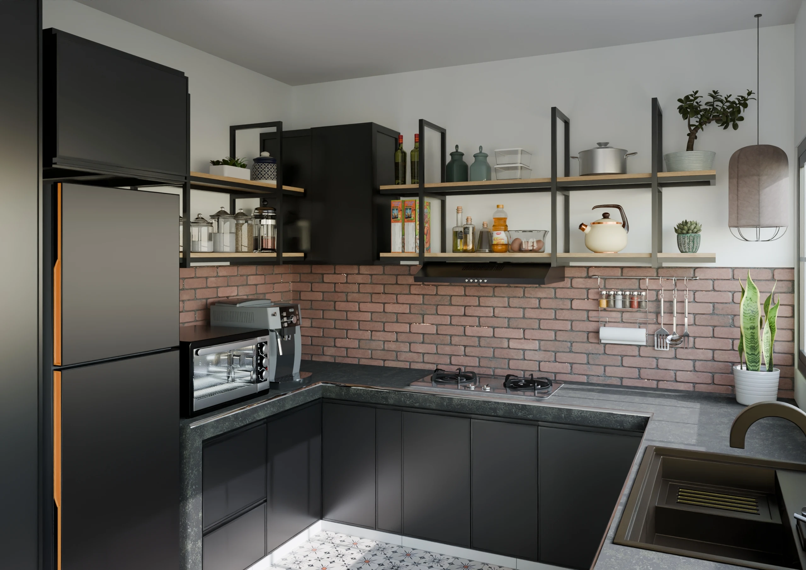 Modern Industrial with a focus on dark cabinetry, metalwork, and raw textures.
