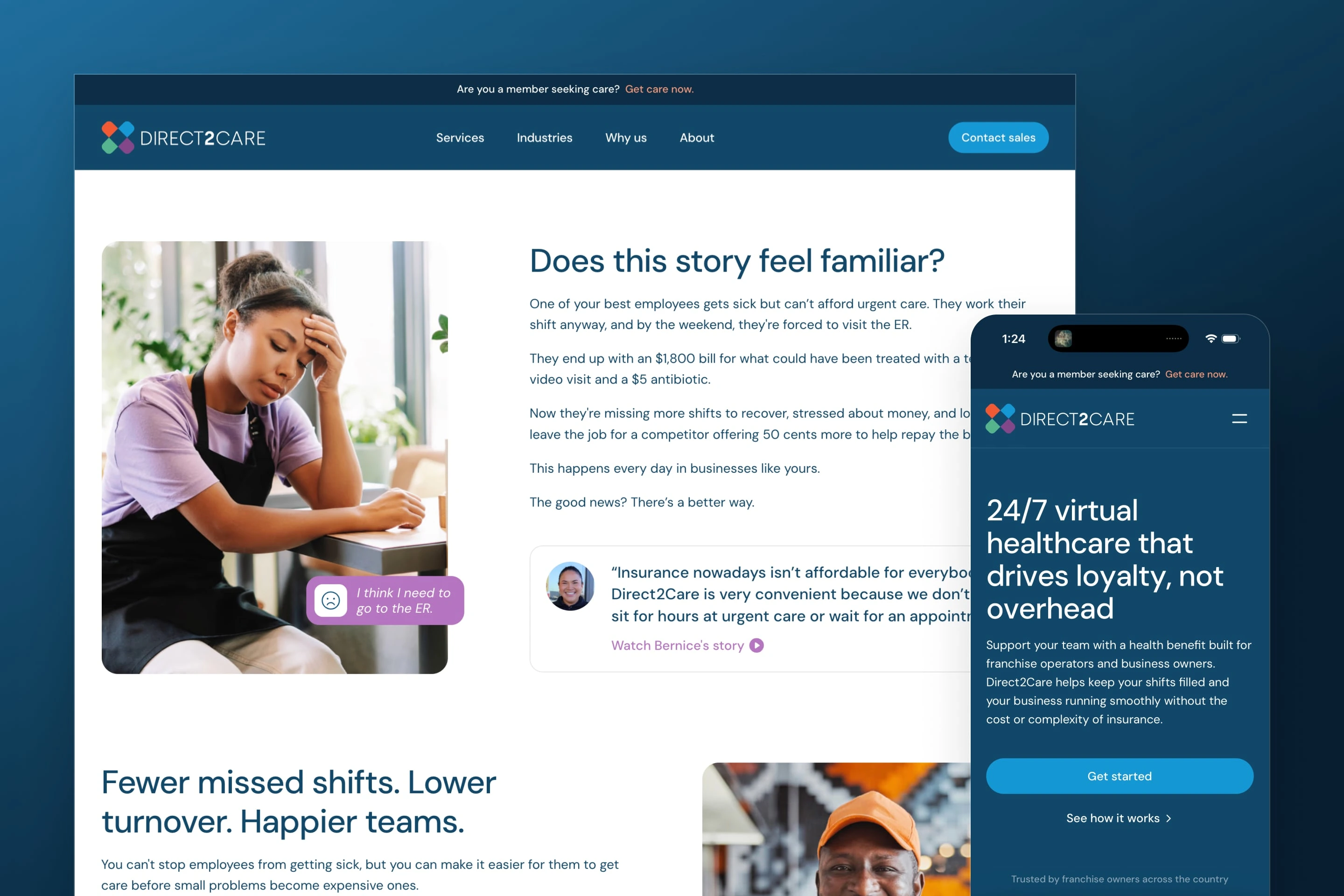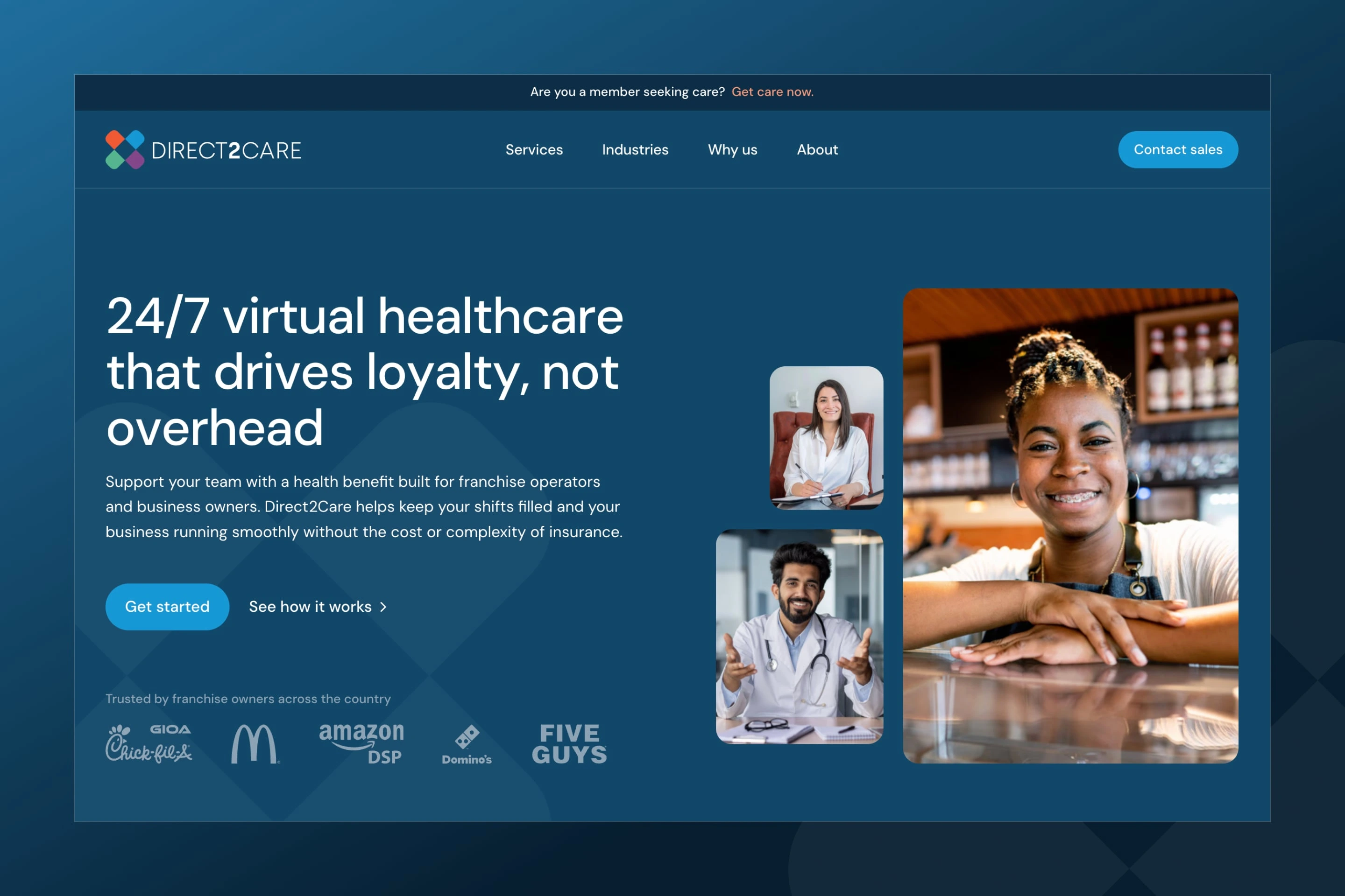Direct2Care provides a virtual healthcare benefit for franchise and business owners supporting hourly teams. They serve QSR, hospitality, logistics, and trades, with clients including Chick-fil-A and McDonald’s franchisees.