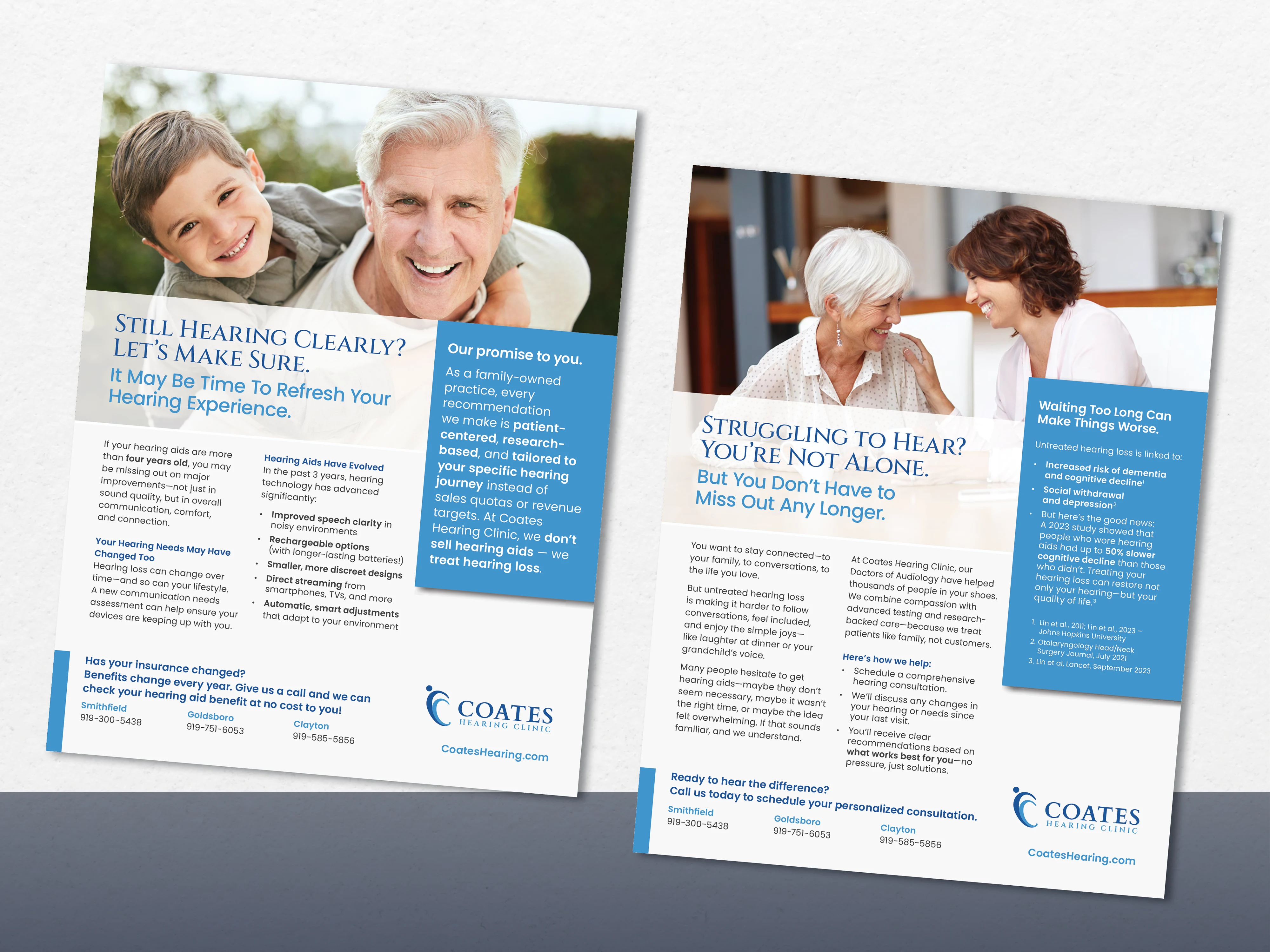 Designed two coordinated 8.5” × 11” folded mailers for Coates Hearing Clinic—one targeting patients with outdated hearing aids and another for patients who declined treatment. Each piece is printed on a single sheet, folded for insertion into a standard mailing envelope, and designed to make a strong first impression when opened. Warm, relatable imagery is paired with concise, research-backed messaging to encourage re-engagement and schedule consultations, enhancing patient outreach and retention.