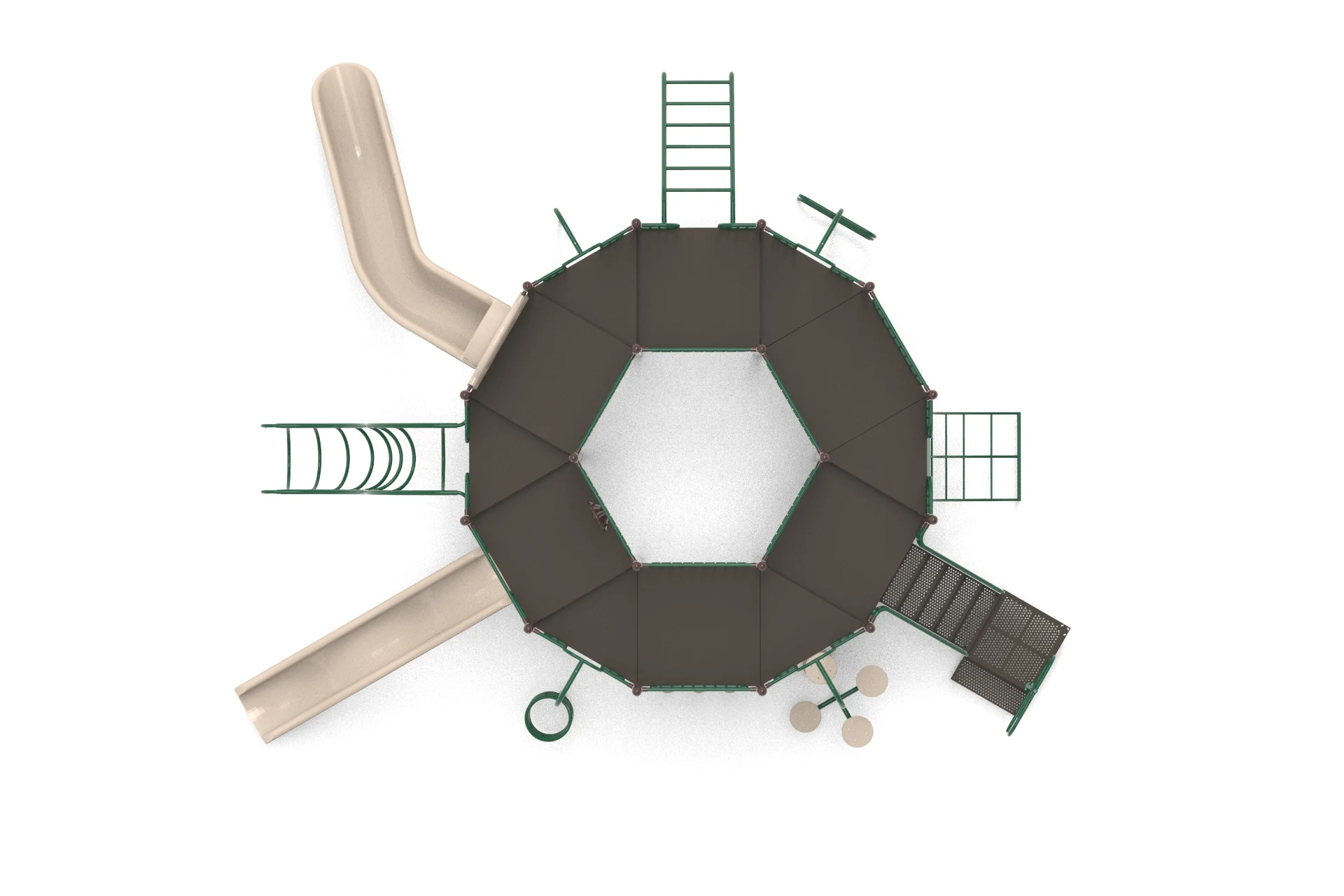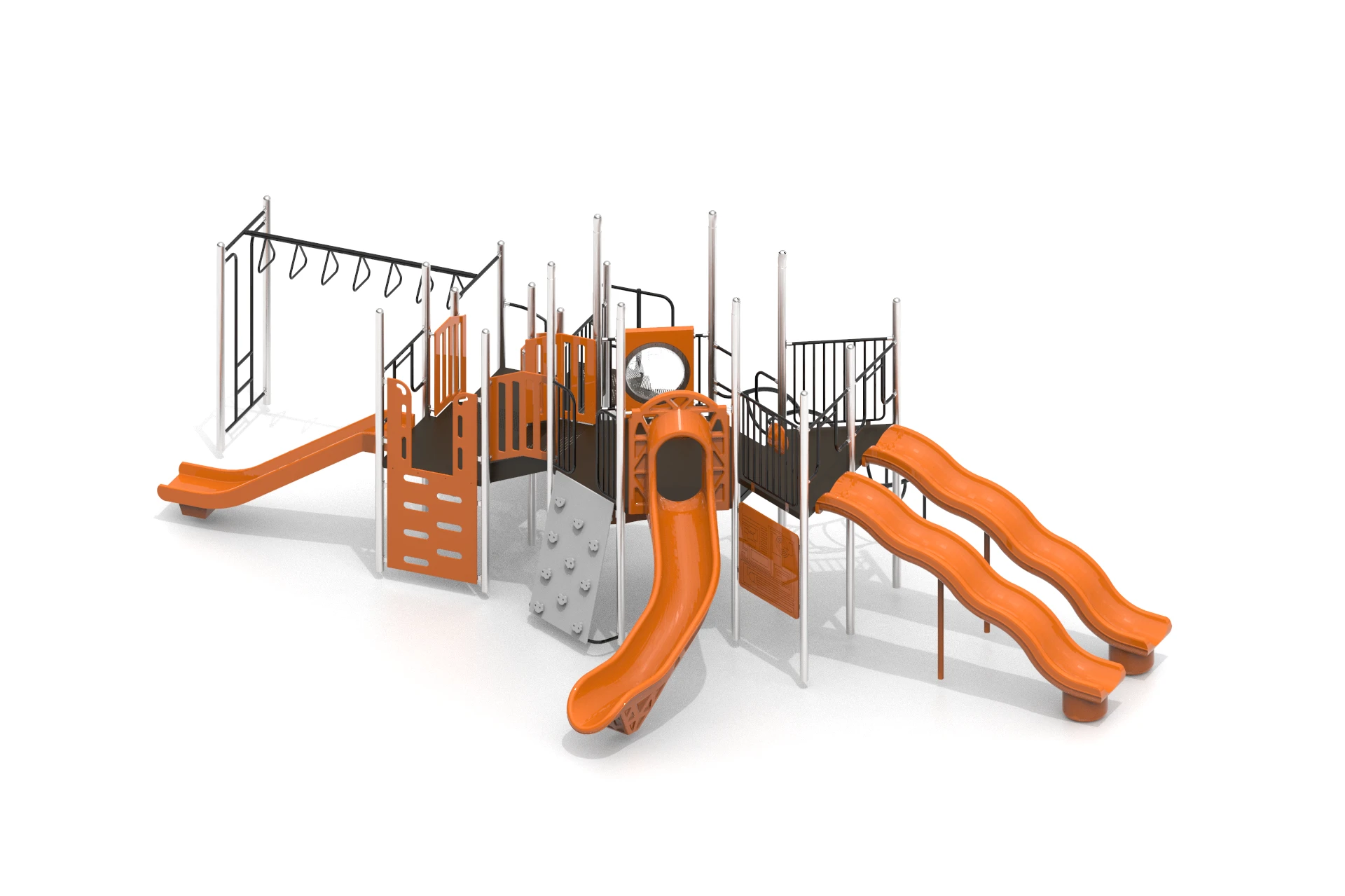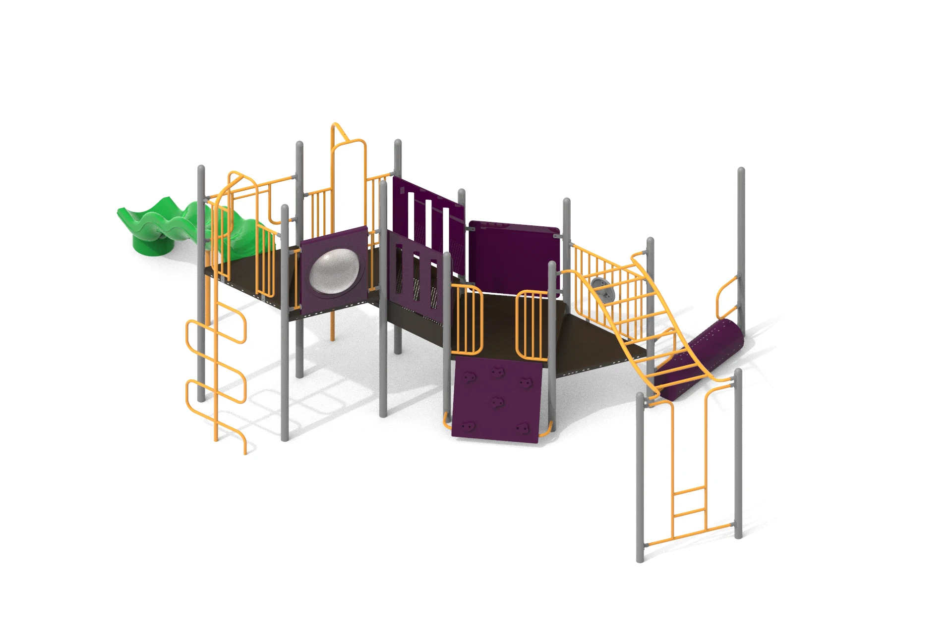 The workflow began with building a detailed 3D model capturing every structural element, climbing ladders, linked deck platforms, tunnel panels, wave slide, log roller, and safety railings. Multiple camera angles were explored to best communicate scale and assembly logic. A top-down orthographic view was included alongside perspective renders to serve both design review and installation planning purposes. Lighting and material setups were crafted to produce clean, studio-quality outputs against neutral backgrounds.