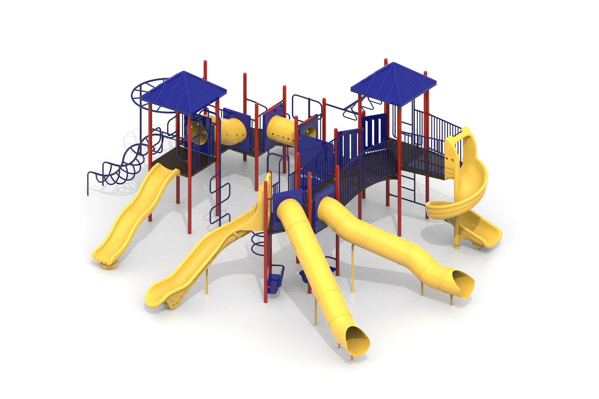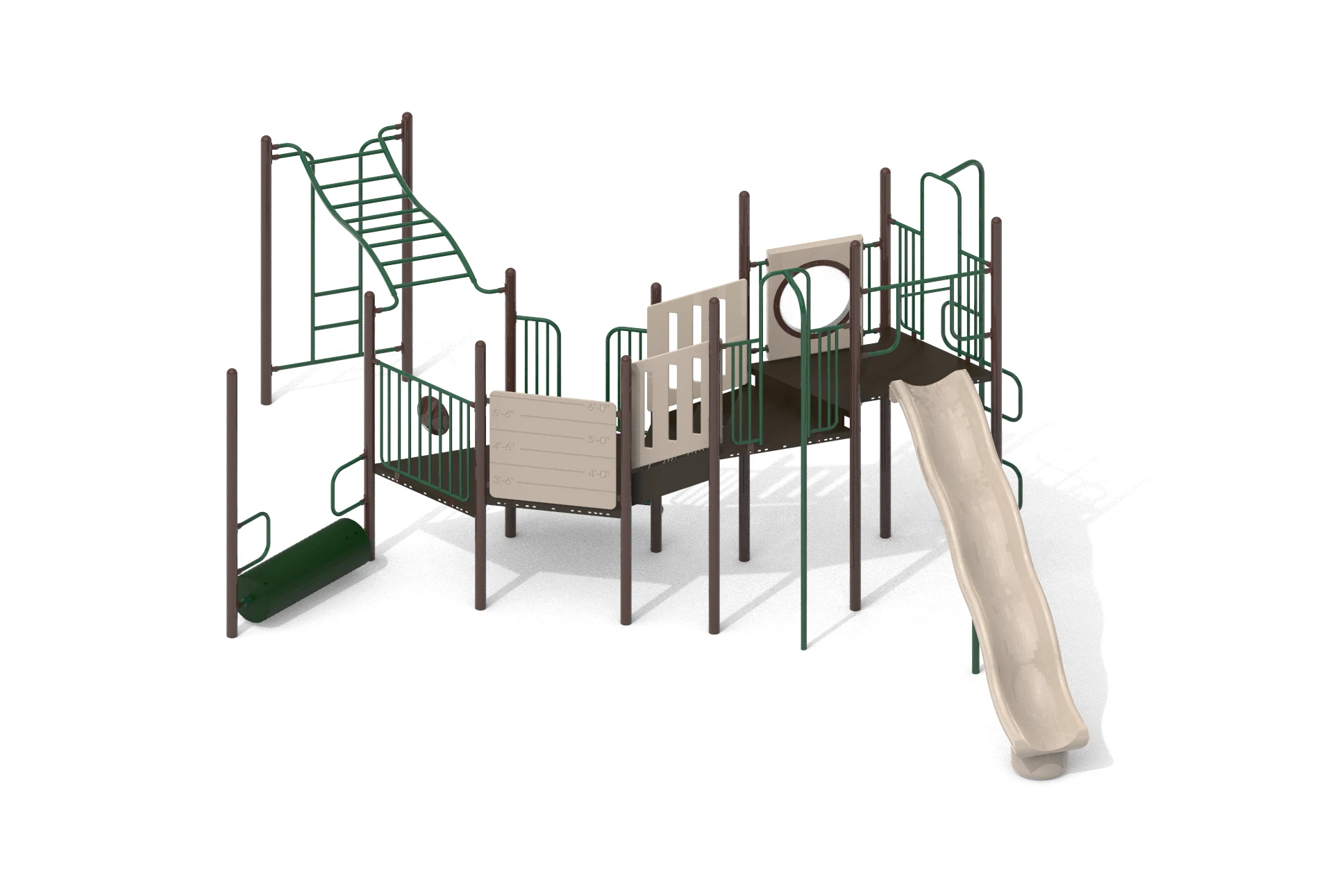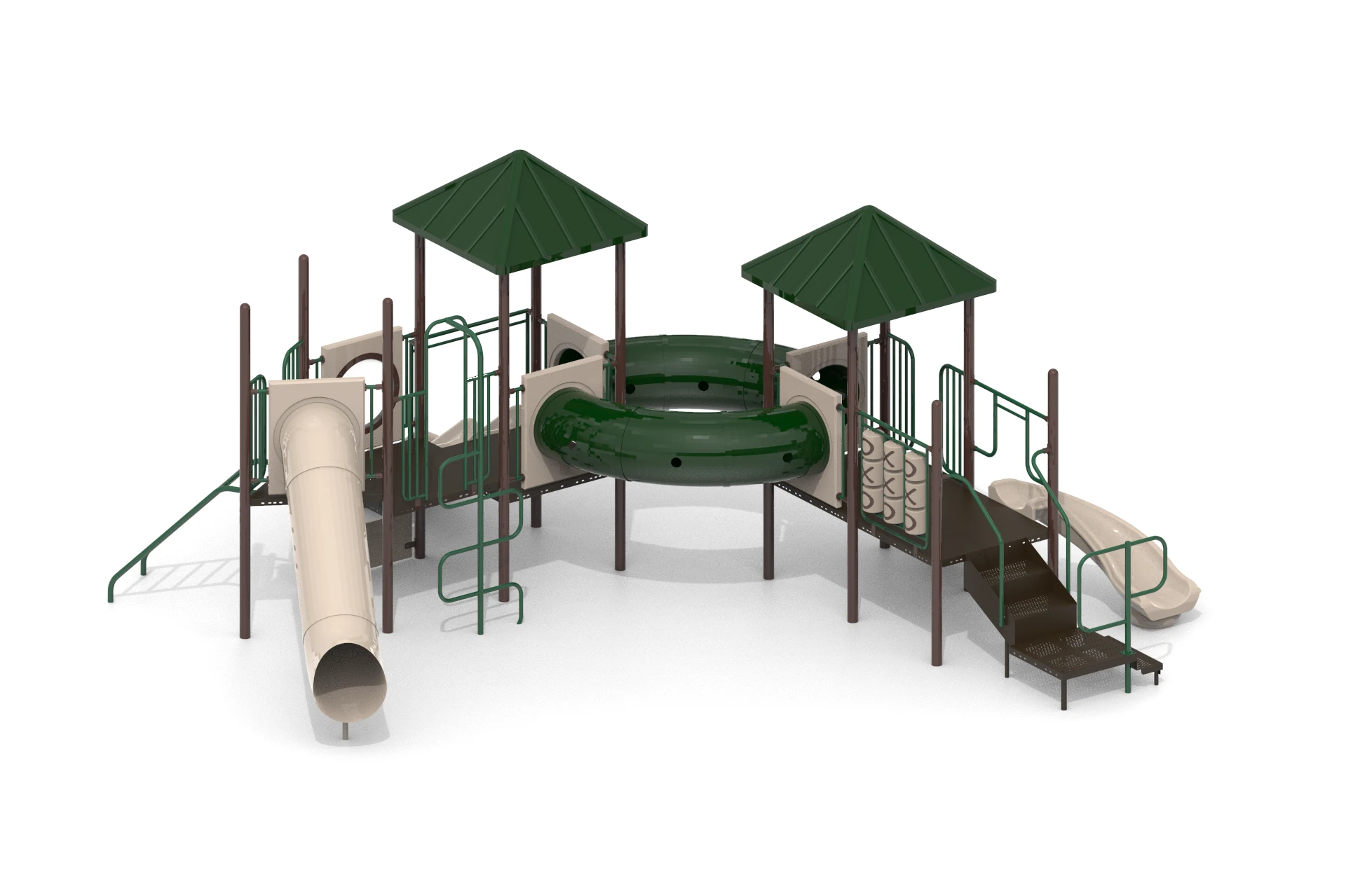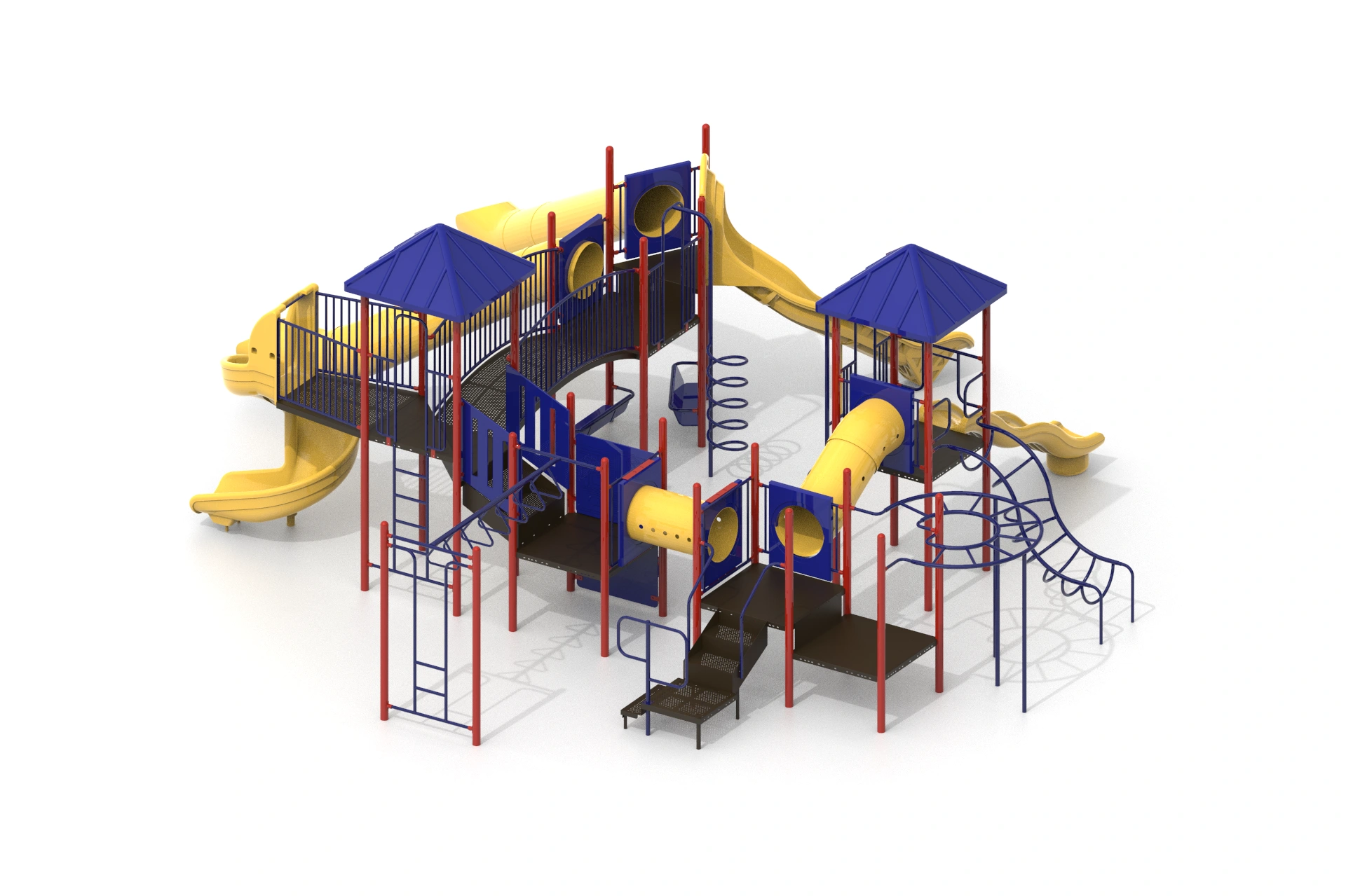 The workflow began with building a detailed 3D model capturing every structural element, climbing ladders, linked deck platforms, tunnel panels, wave slide, log roller, and safety railings. Multiple camera angles were explored to best communicate scale and assembly logic. A top-down orthographic view was included alongside perspective renders to serve both design review and installation planning purposes. Lighting and material setups were crafted to produce clean, studio-quality outputs against neutral backgrounds.
