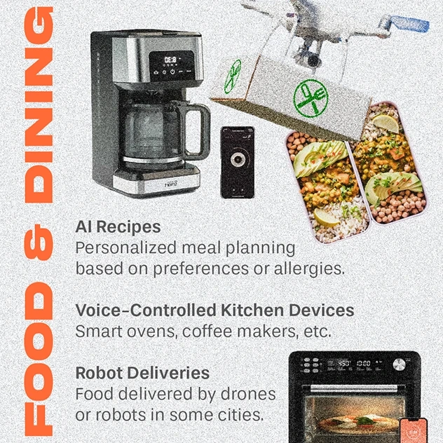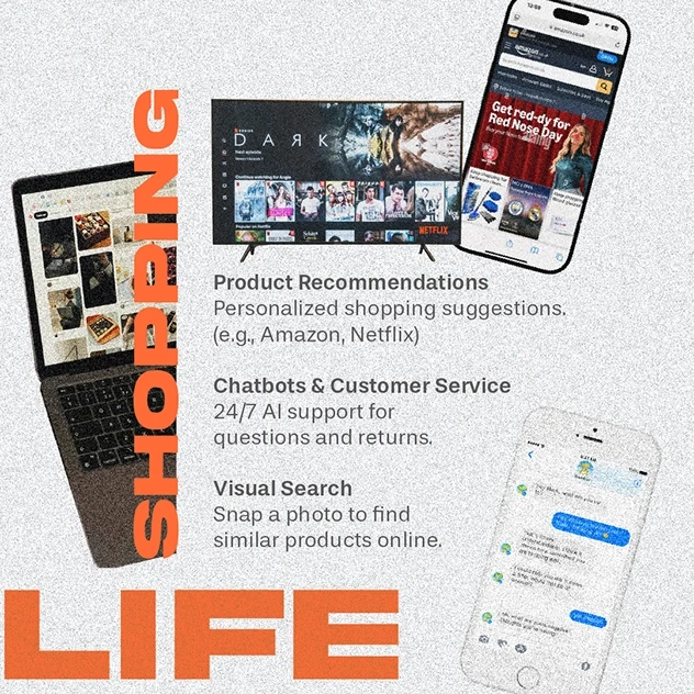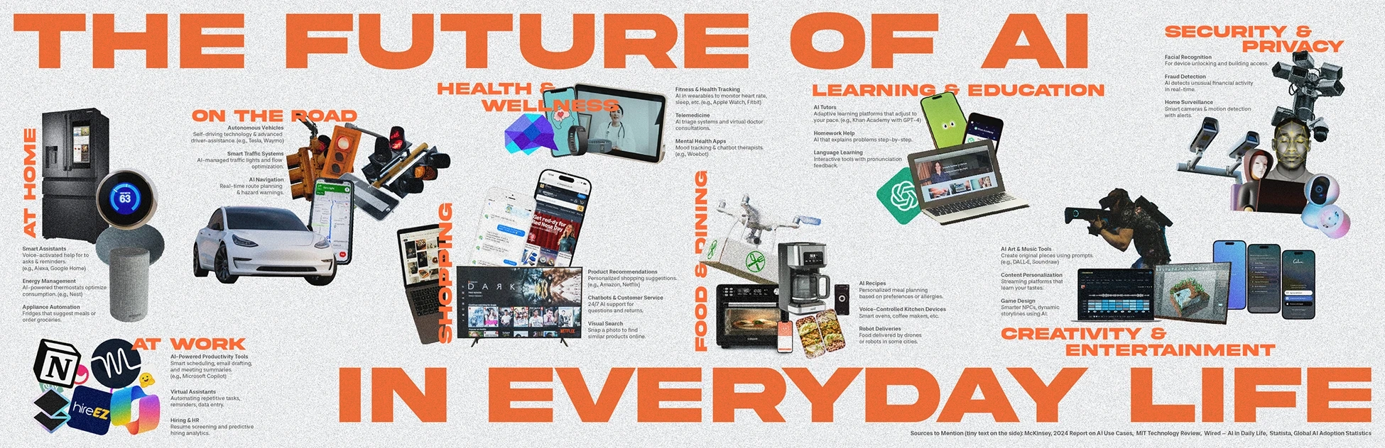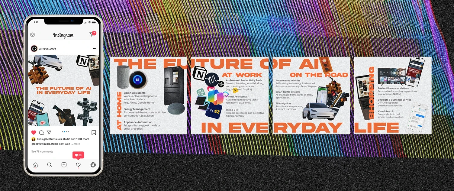 Content simplification involved condensing a long, text-heavy report into brief, catchy summaries that would work well in a visual flow. Creative interpretation was key to establishing the right tone—so I applied a subtle noise and blur effect to the images using Photoshop, visually representing the idea that AI, while impressive, is still evolving and far from flawless. Instead of using generic icons, I incorporated real-life images of devices, tools, and apps that students would instantly recognize—from smart home assistants to GPS apps and wearable tech. For the social media adaptation, I redesigned the infographic as an Instagram carousel, breaking down each section for better readability, and also created simplified visual assets for use in Reels, where the magazine team could overlay text, motion, or link to the full article.