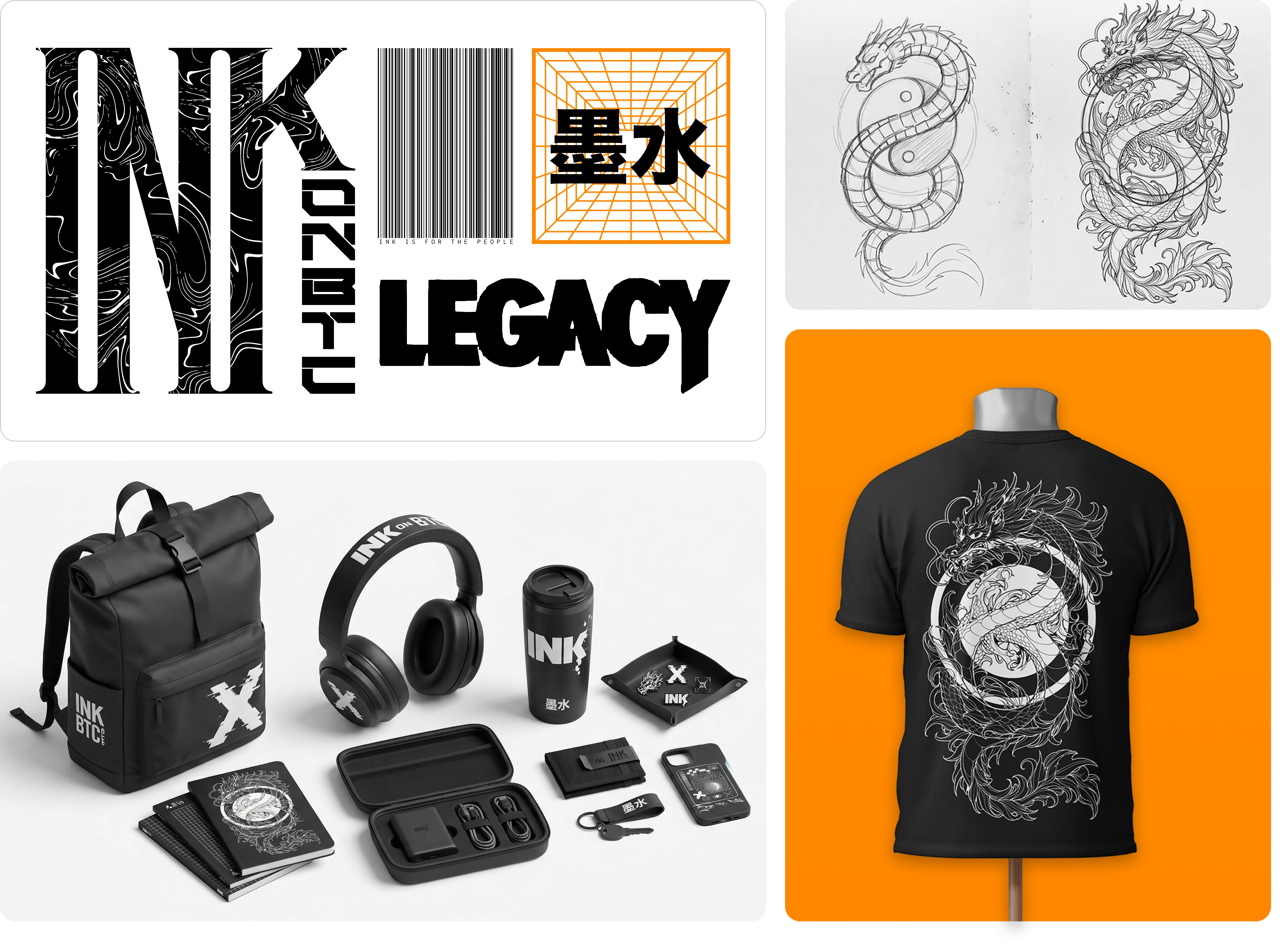 A small apparel line designed to honor the aesthetic INKedBTC had already established, black-on-black, ink-heavy, with the project's signature orange used as a punctuation mark rather than a base.