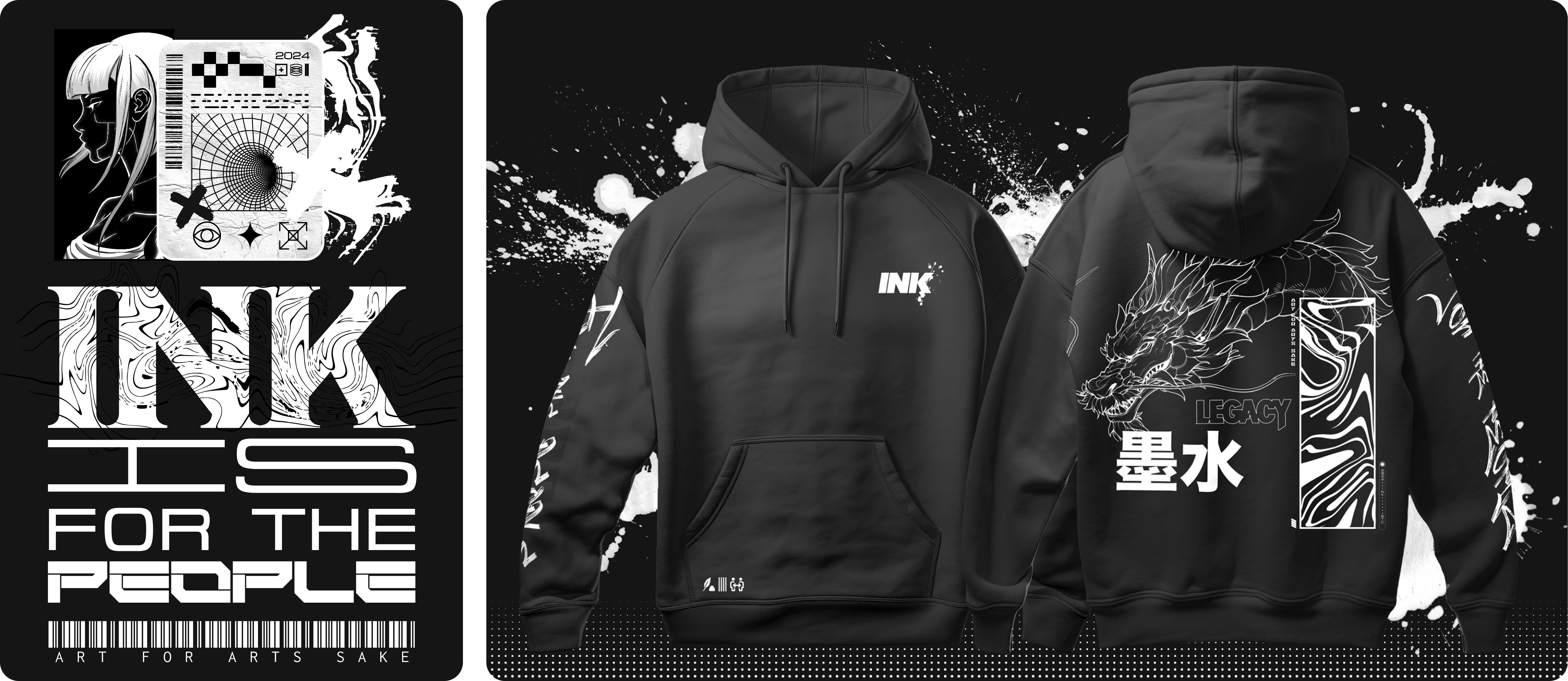 The hoodies layer the project's kanji typography (墨水 — "ink"), sleeve text, and the original character artwork from the collection. The graphic poster design references the project's cyber-editorial visual language: barcodes, grid warps, and the manga-influenced figure work that defined the INK aesthetic.