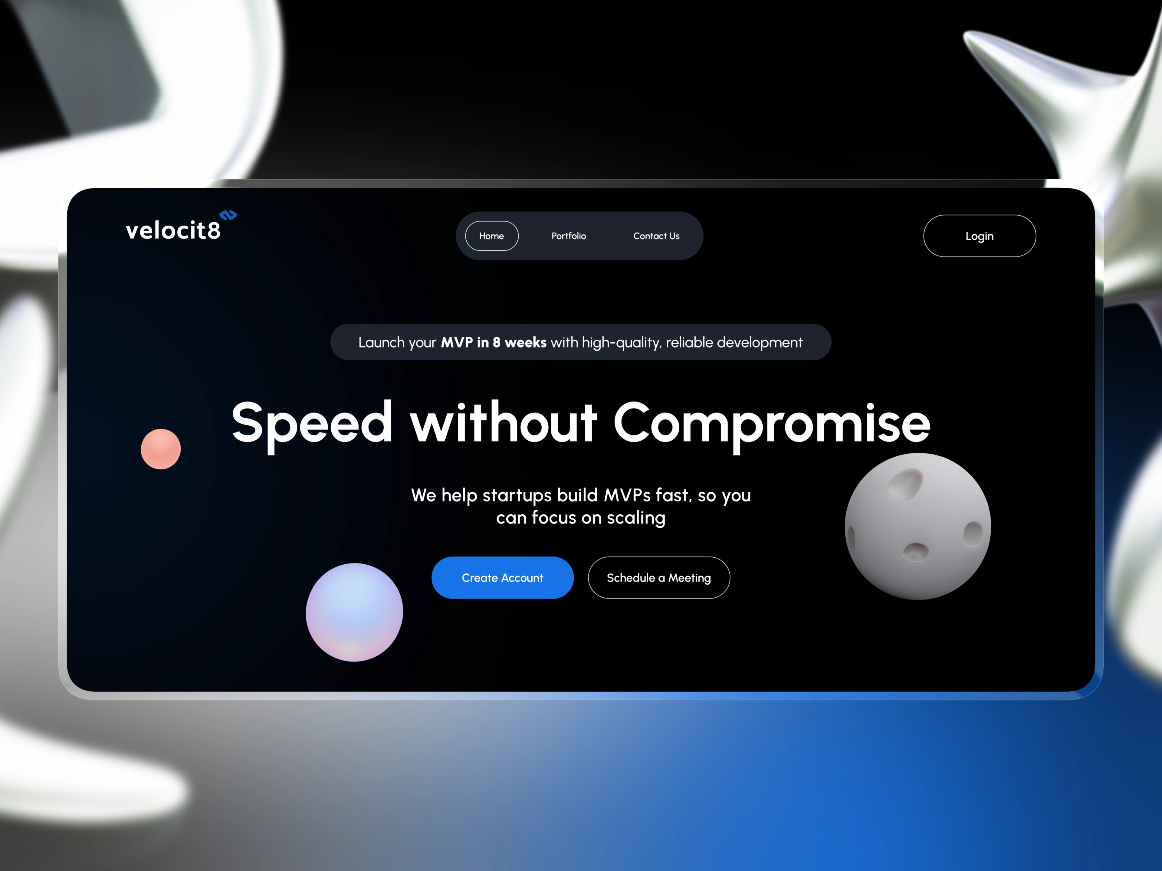 Velocit8 needed a marketing front door that matched the sophistication of its SaaS product. The goal was to build a landing page that clearly communicated its value proposition "Speed without Compromise" and converted visitors into booked meetings for MVP development.
