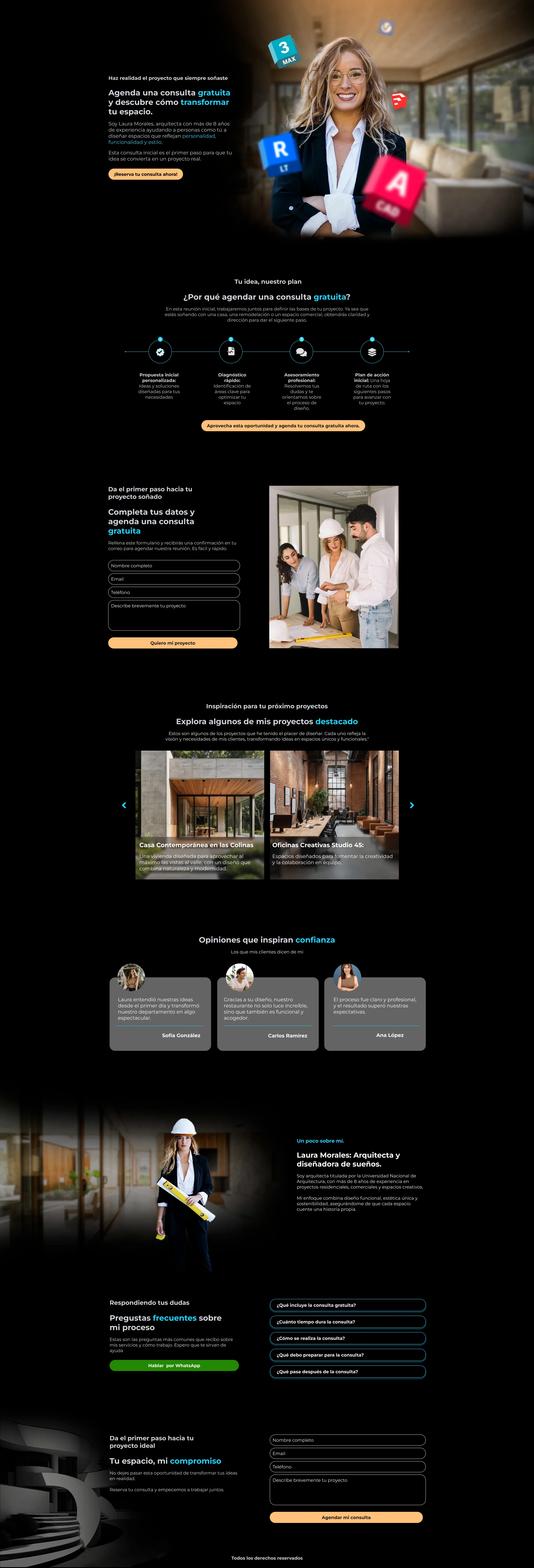 Este proyecto presenta el servicio de Laura Morales, arquitecta especializada en transformar ideas en proyectos únicos y personalizados. Con más de 8 años de experiencia, se enfoca en crear espacios funcionales y estéticamente impecables a través de un proceso accesible que incluye una consulta gratuita inicial, diagnósticos detallados y propuestas de diseño a medida.