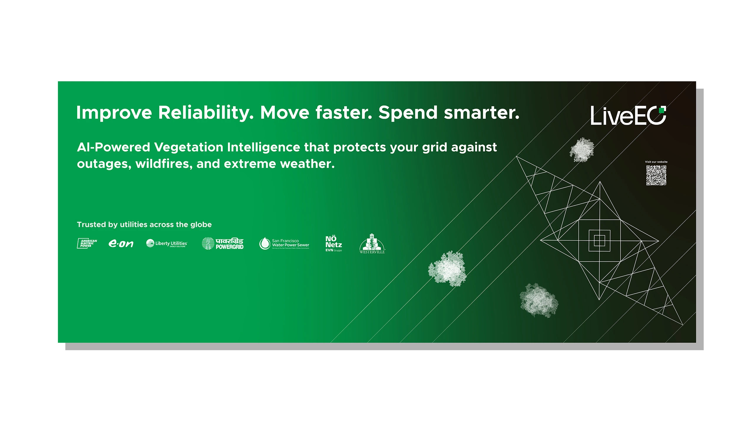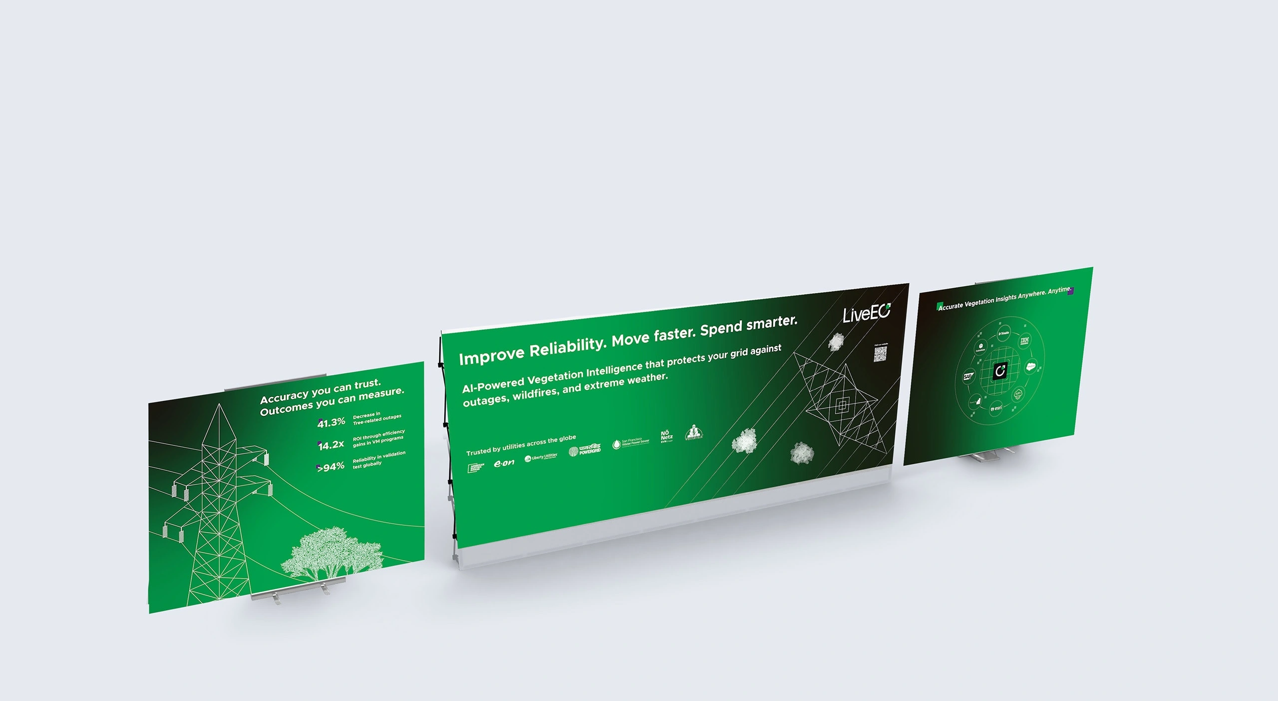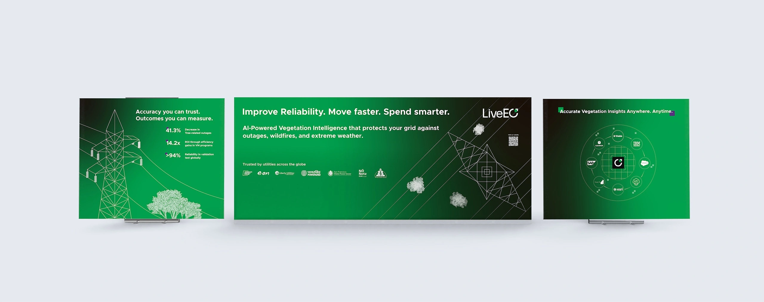 For Berlin-based Scale-Up LiveEO, I developed a modular event booth system that adapts seamlessly across single-wall, L-shaped, and U-shaped layouts. The design replaces outdated product imagery with bold typography, gradients, and custom visuals of electrical towers and trees that would resonate with electric utility professionals at the Trees and Utilities event in Knoxville, Tennessee, USA. By creating clear messaging through typographic choices, the booth system enhances brand recognition, supports QR codes and strong CTAs, whilst effectively communicating LiveEO’s mission of utilising Earth observation technologies to revolutionise asset monitoring and improve reliability, safety, and efficiency.