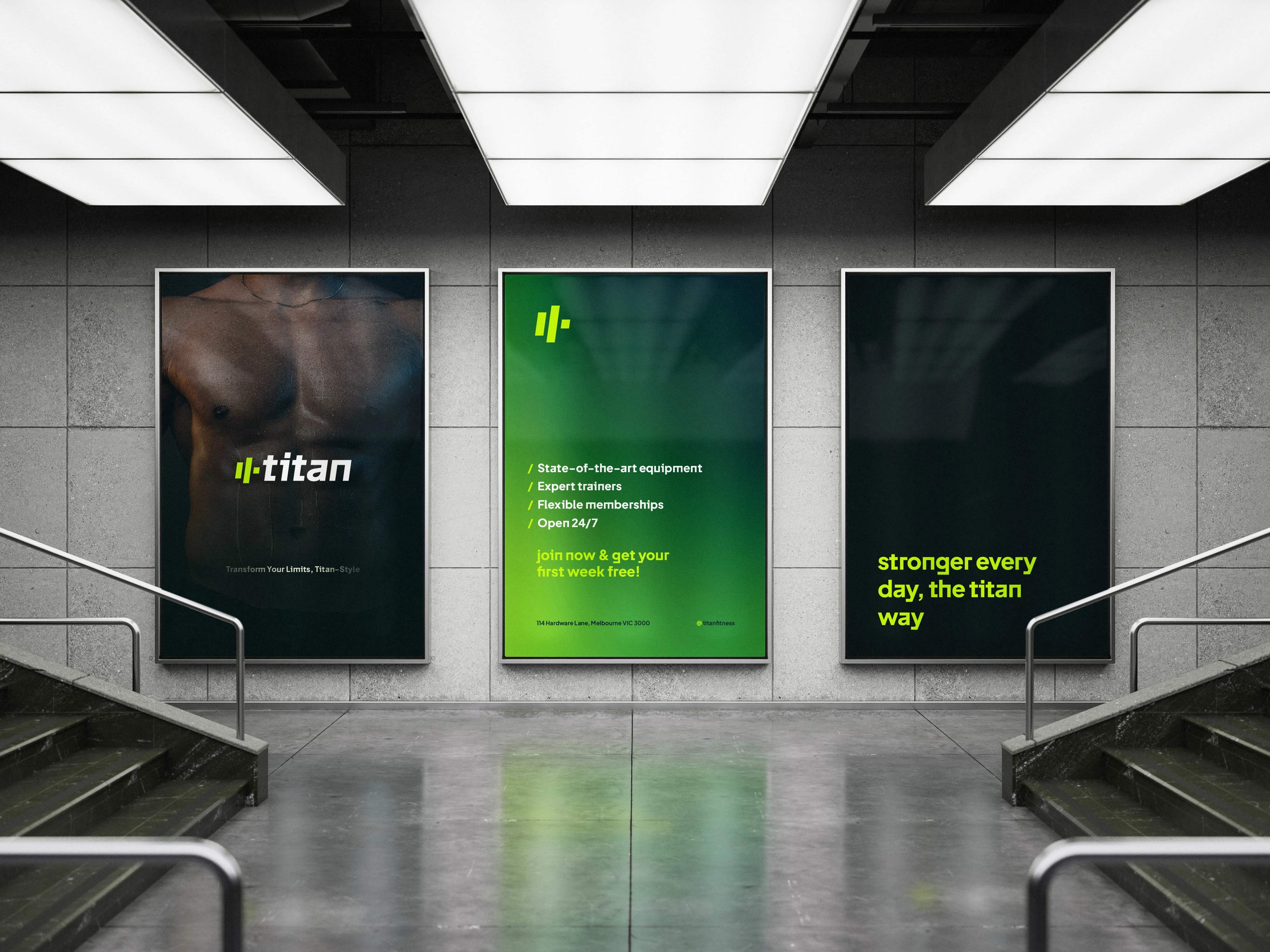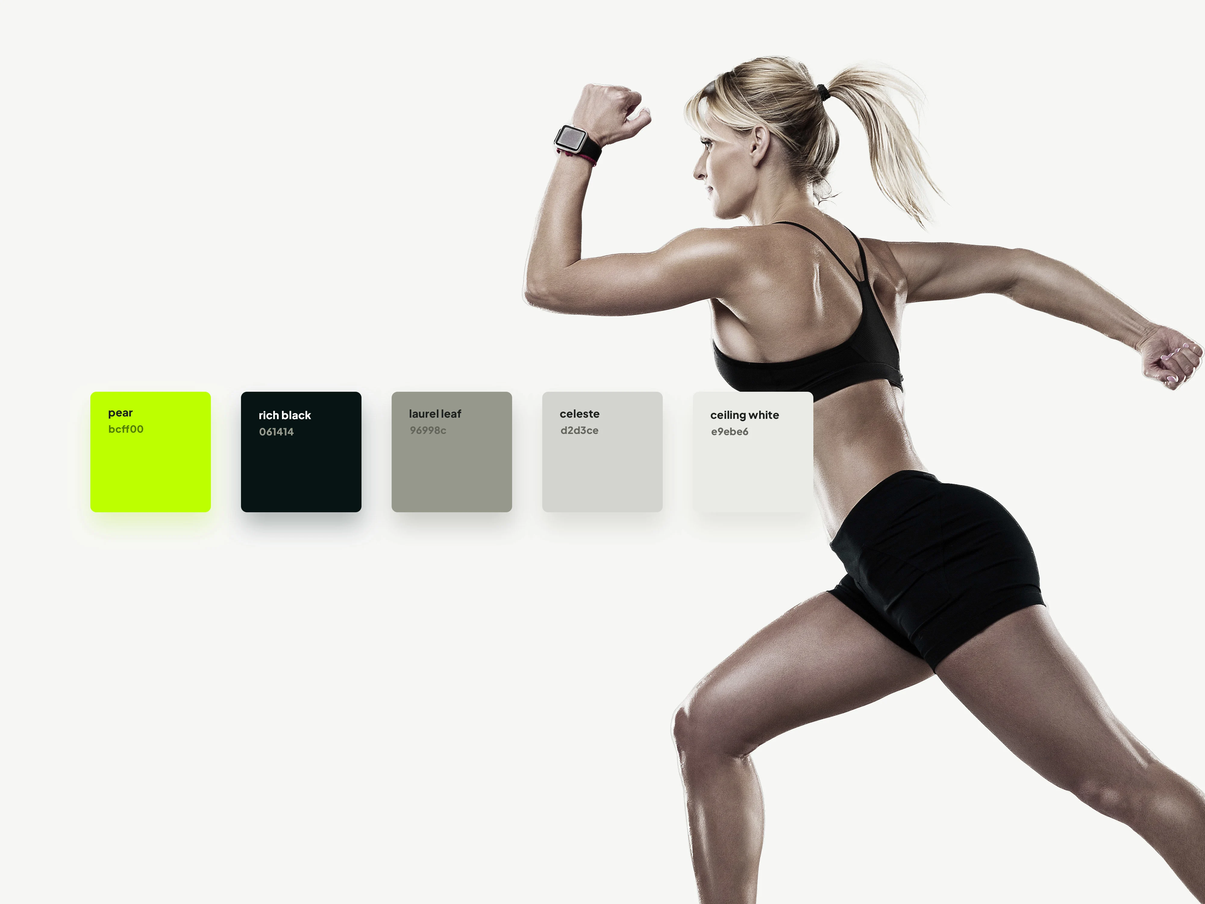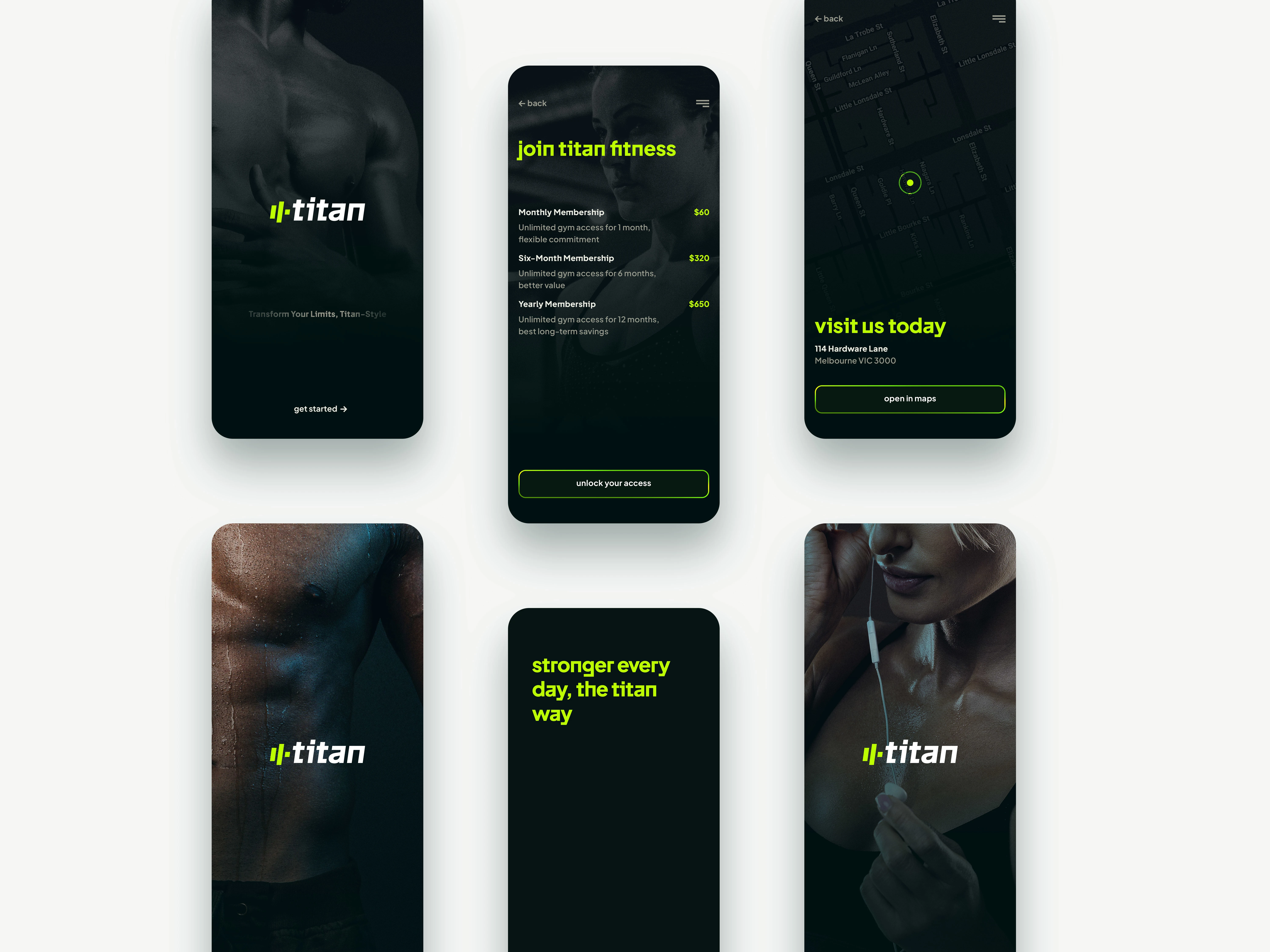 Comprehensive fitness app UI with bold typography, intuitive navigation, and modern design. Complete branding system balancing elegance with functionality.