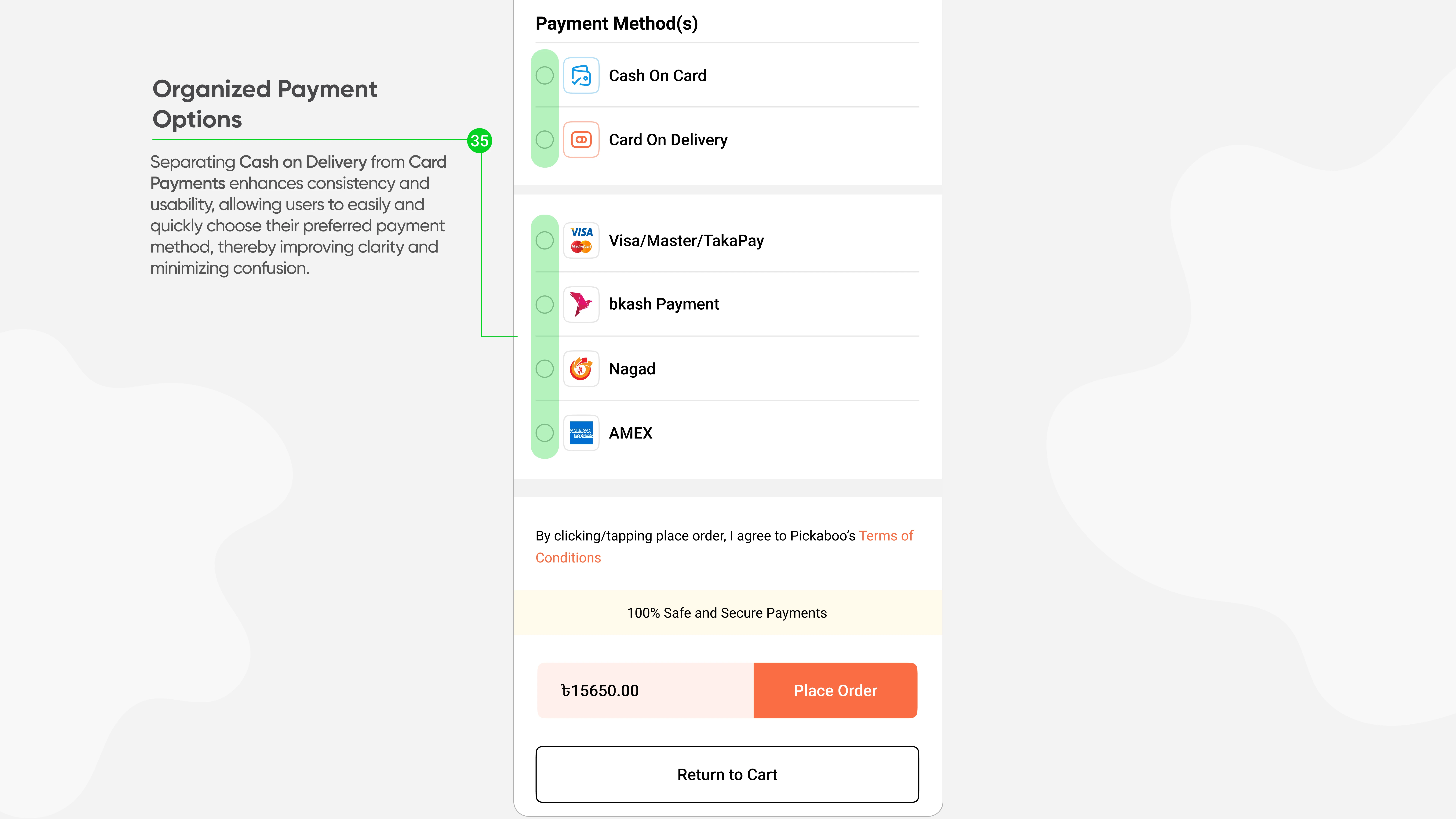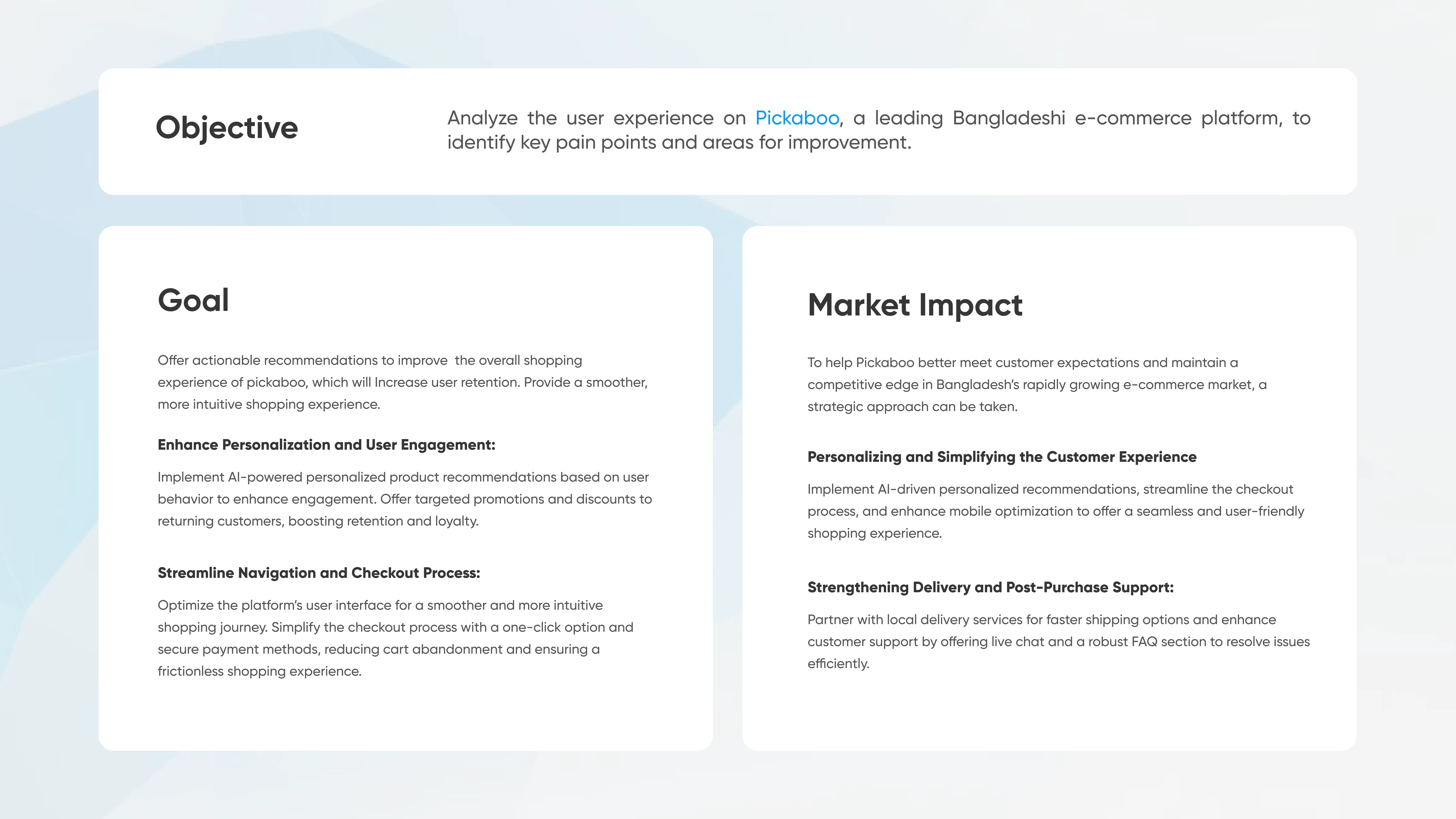 Description: In this case study, we delve into the redesign of Pickaboo's eCommerce checkout process, aiming to create a seamless and user-friendly experience for customers. By identifying pain points in the existing system, our team applied user-centered design principles to streamline navigation, reduce cart abandonment rates, and enhance overall satisfaction. The result is a refined checkout experience that not only boosts conversion rates but also fosters customer loyalty.