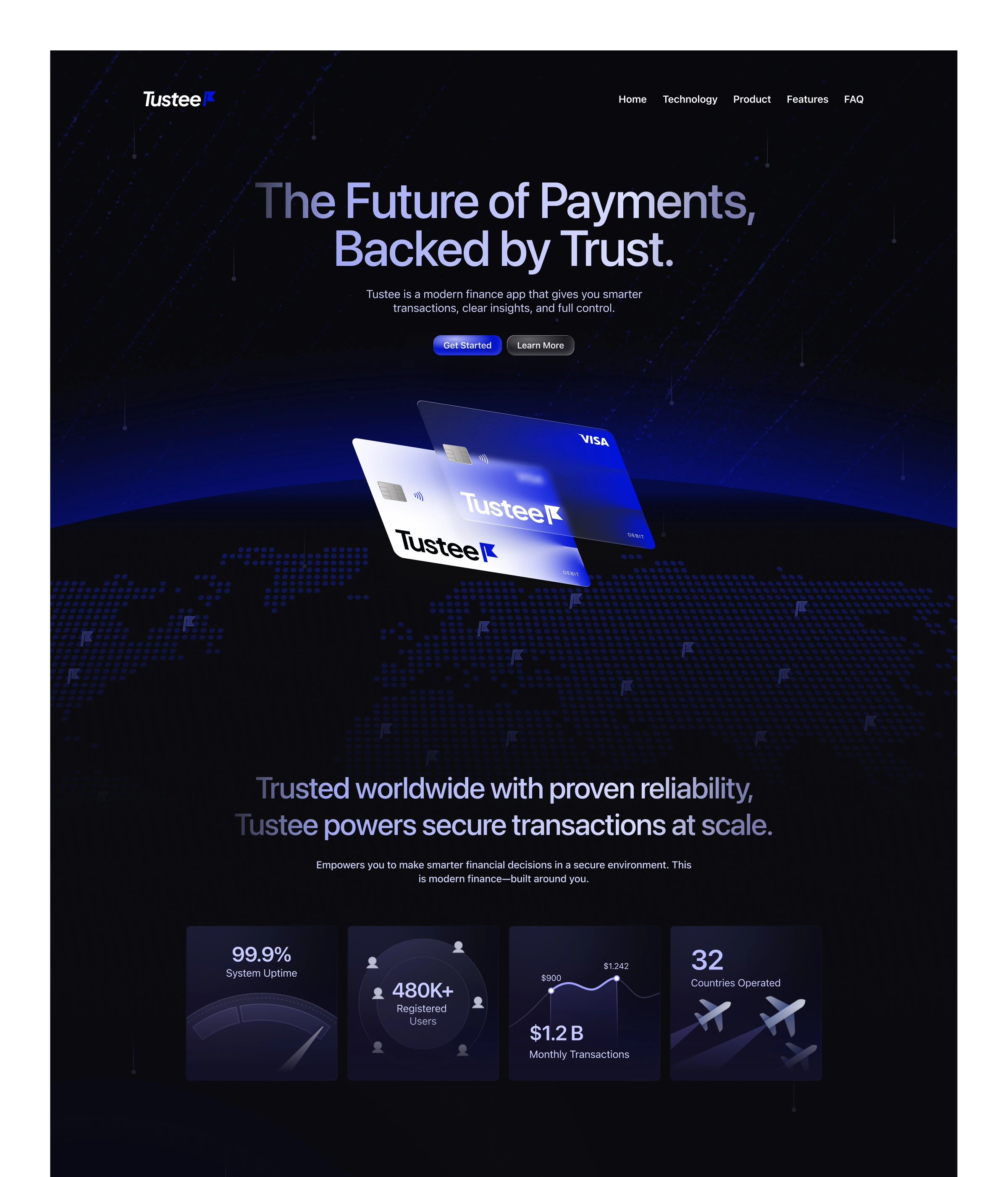 The landing page was designed to capture Tustee’s core values—trust, simplicity, and innovation—through a clean, structured interface. The layout highlights key financial features with clear hierarchy, guiding users effortlessly from awareness to action. The use of white space, geometric accents, and the blue gradient palette creates a balance between professionalism and modern appeal. Every section of the page is crafted to build user confidence and reflect Tustee’s mission: making smarter money management simple, secure, and accessible.
