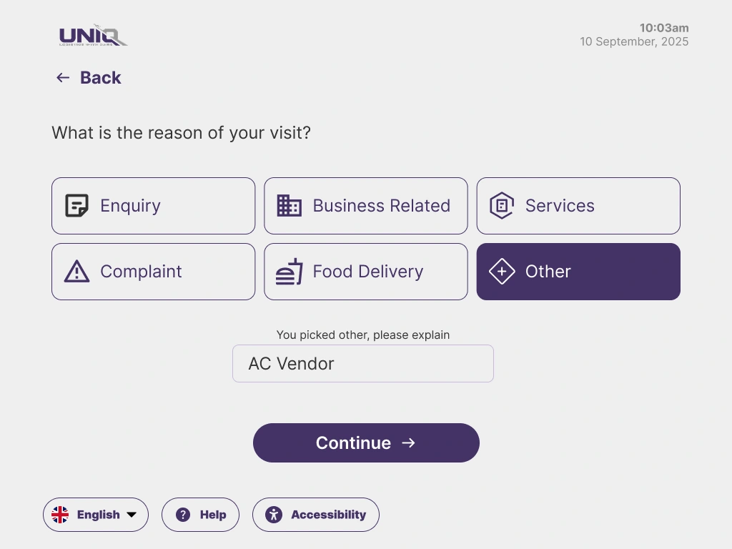 First Check-in: Once registered, they use the kiosk for a quick first check-in, which then directs them to security personnel for personal guidance.